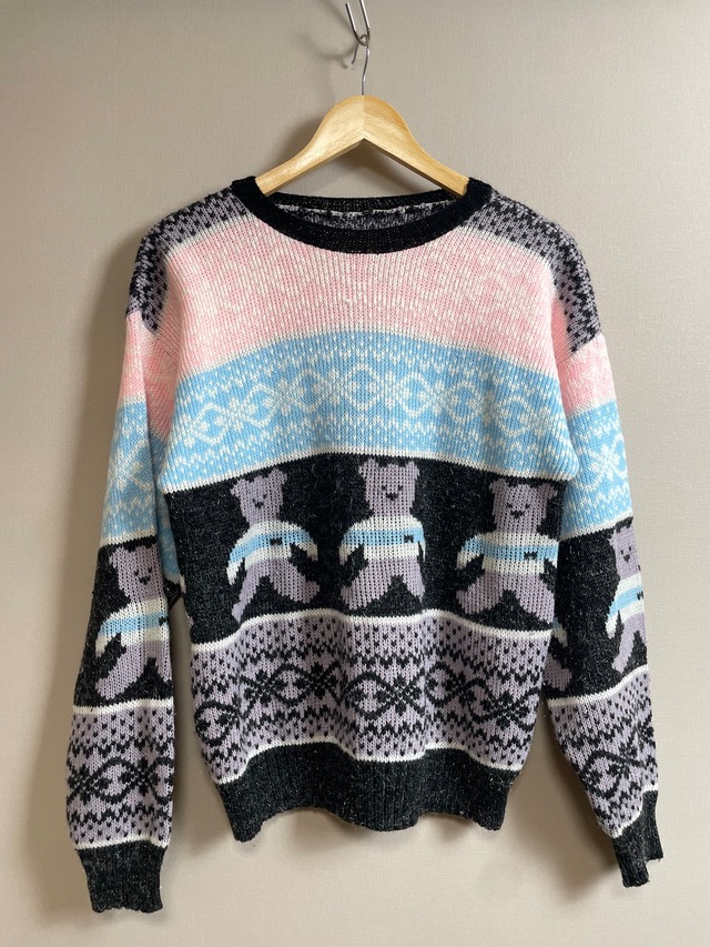 ※モデル身長:172cm、普段はレディースM〜L着用 今回は少しルーズなフィット感ですが、首周りが少し小さめの作りなので脱ぎ着のときにきつく感じました。頭まわりのサイズが55cm以下の方向けです。 【サイズ】 表記:なし 着用感:レディースL、メンズM 平置き(実寸・cm):肩幅55、身幅50、袖丈53、着丈60 ◾︎テディベアセーター リボンをつけたかわいいテディベアモチーフのセーター。 パステルブルーとピンクをブラックで締めているので子どもっぽくなりません。 "ダサかわ”を楽しめるオトナのあなたへ。 【ブランド】Unknown 【状態】美品。やや着用感はありますが、目立つダメージはありません。 ※当店では新品・デッドストック品を除いて、古着はすべて洗濯、検品、お直しなどのケアを行っております。 ※商品写真はすべてスマホで撮影しています。モニターの発色により実物と異なる場合がございます。予めご了承ください。 ※ 当店で扱っている商品は全てUSED品になりますので、使用感、毛玉、匂いなどある場合がございます。古着にご理解ある方のみ、ご購入いただきますようお願いいたします。