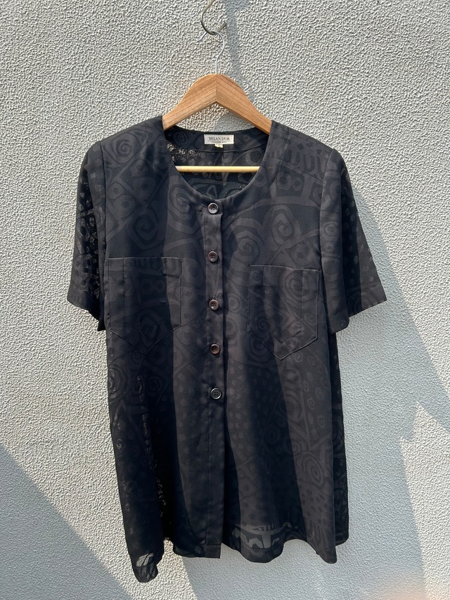 【サイズ】 表記:なし 着用感:レディースS〜M、メンズS 平置き・実寸(cm):肩幅37、身幅47、着丈56 ■半袖ショート丈シャツ シャツの下部分に筆で描いたようなデザインがされているショート丈シャツ。 ボタン部分も凝っていて、ボタンホールはなくゴムで留めるデザインなのも新鮮! ちょっとシワ加工がされたシャツで、シャリシャリとして乾きやすい素材。 やや透け感もあり、黒ですが涼しげで夏に気軽に着られるシャツです。 【素材】 表記なし 【状態】 A:着用感はありますが、ダメージや汚れはなく、美品です S:中古・使用感があまり無く、とても良い状態の美品 A:使用感はあるが、ダメージや汚れがあまり見られない商品 B:使用感があり、多少の汚れやダメージが見られるが、古着慣れしている方なら気にならない程度の商品 C:使用感があり、部分的に目立つ汚れやダメージが見られる商品 D:とても使用感があり、目立つ汚れやダメージが見られる商品 ※当店では新品・デッドストック品を除いて、古着はすべて洗濯、検品、お直しなどのケアを行っております。 ※商品写真はすべてスマホで撮影しています。モニターの発色により実物と異なる場合がございます。予めご了承ください。 ※ 当店で扱っている商品は全てUSED品になりますので、使用感、毛玉、匂いなどある場合がございます。古着にご理解ある方のみ、ご購入いただきますようお願いいたします。 ※管理番号:#166