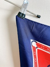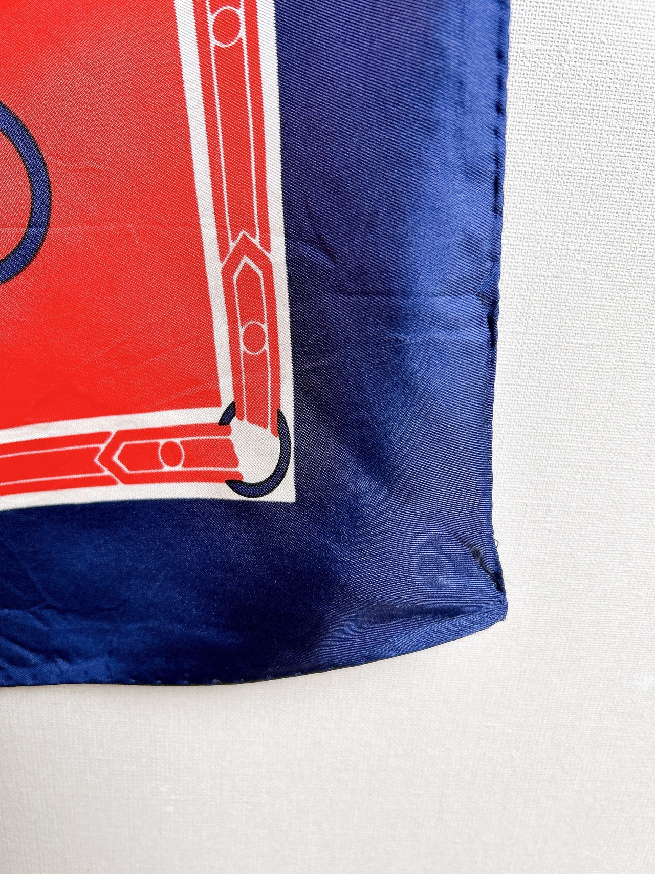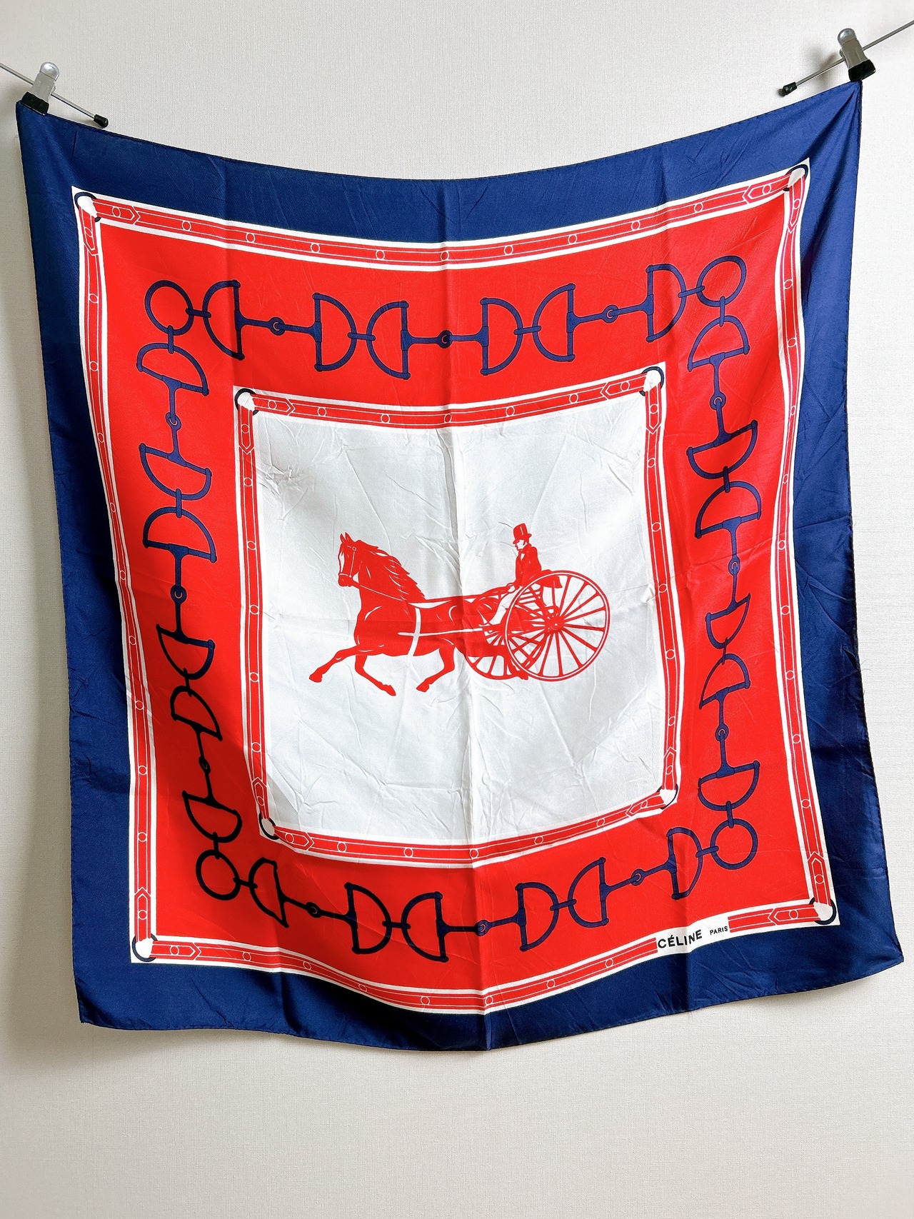 レッドベースにネイビー、ホワイトの馬車デザイン、なんちゃってCELINE風のスカーフです。