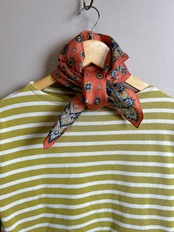 中判サイズです。頭・首元に巻いたり、巾着バック風にしたり、バッグにチャームっぽく巻くなど、ポイントアクセントとして楽しめるスカーフです。