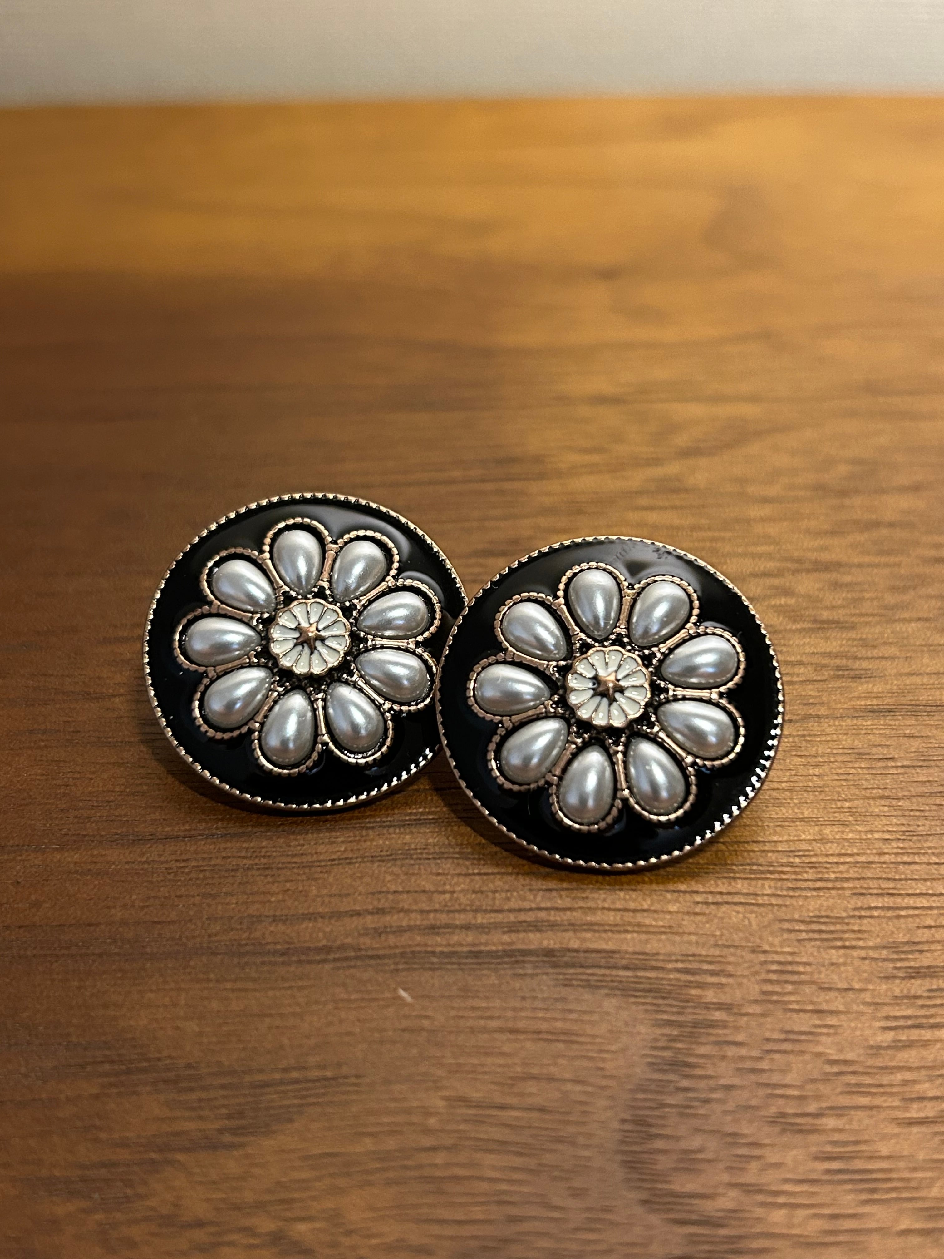 ブラックベースにゴールドとパール感のあるお花がデザインされたピアス。