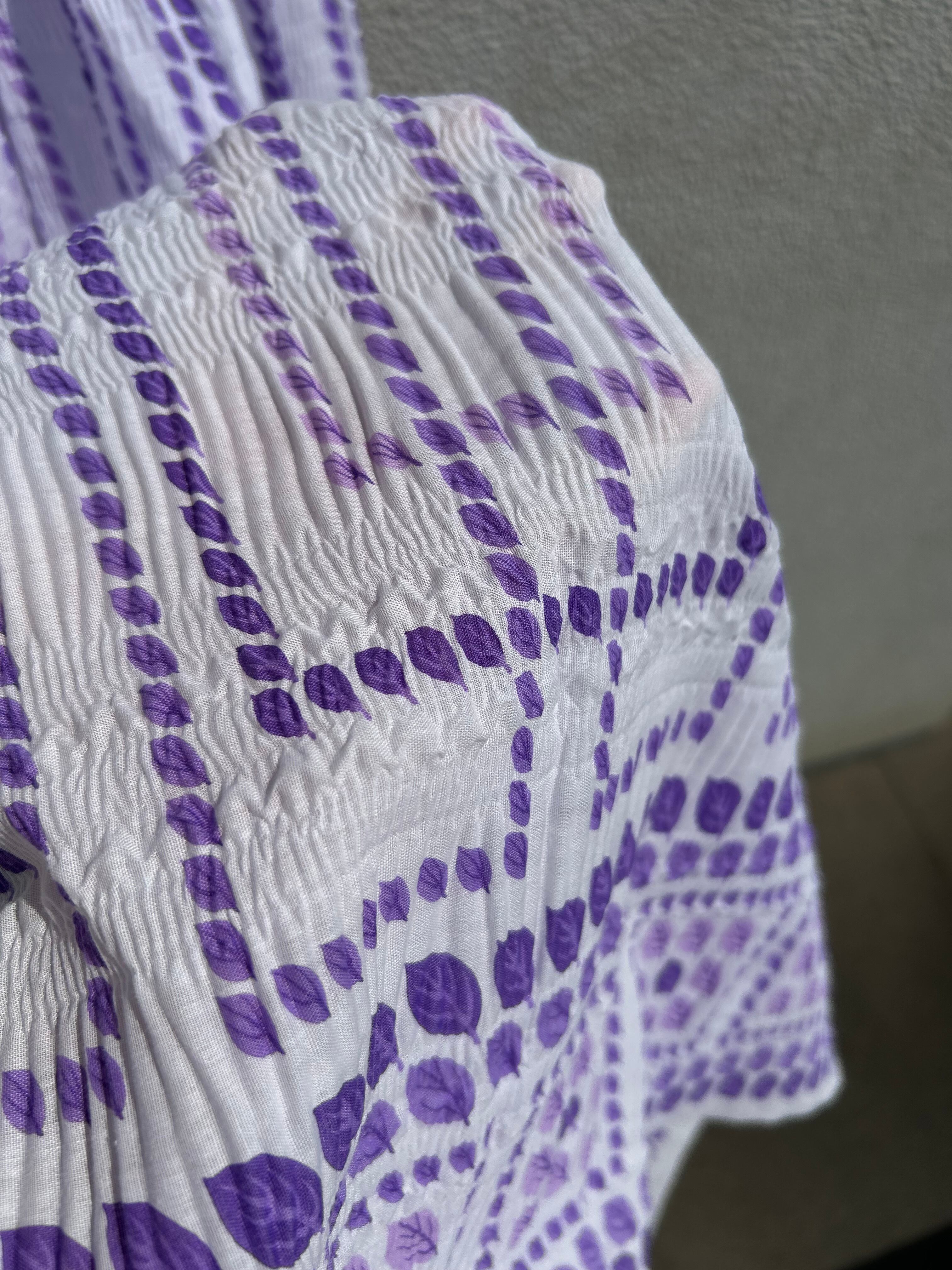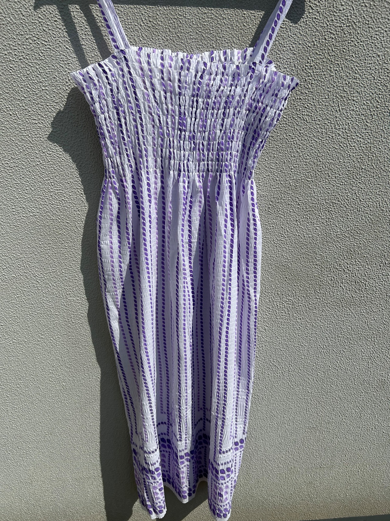 中にタンクトップ1枚、ワンピースの下にデニムを着用しています。着丈は脛くらいです。1枚で着るには透け感があります