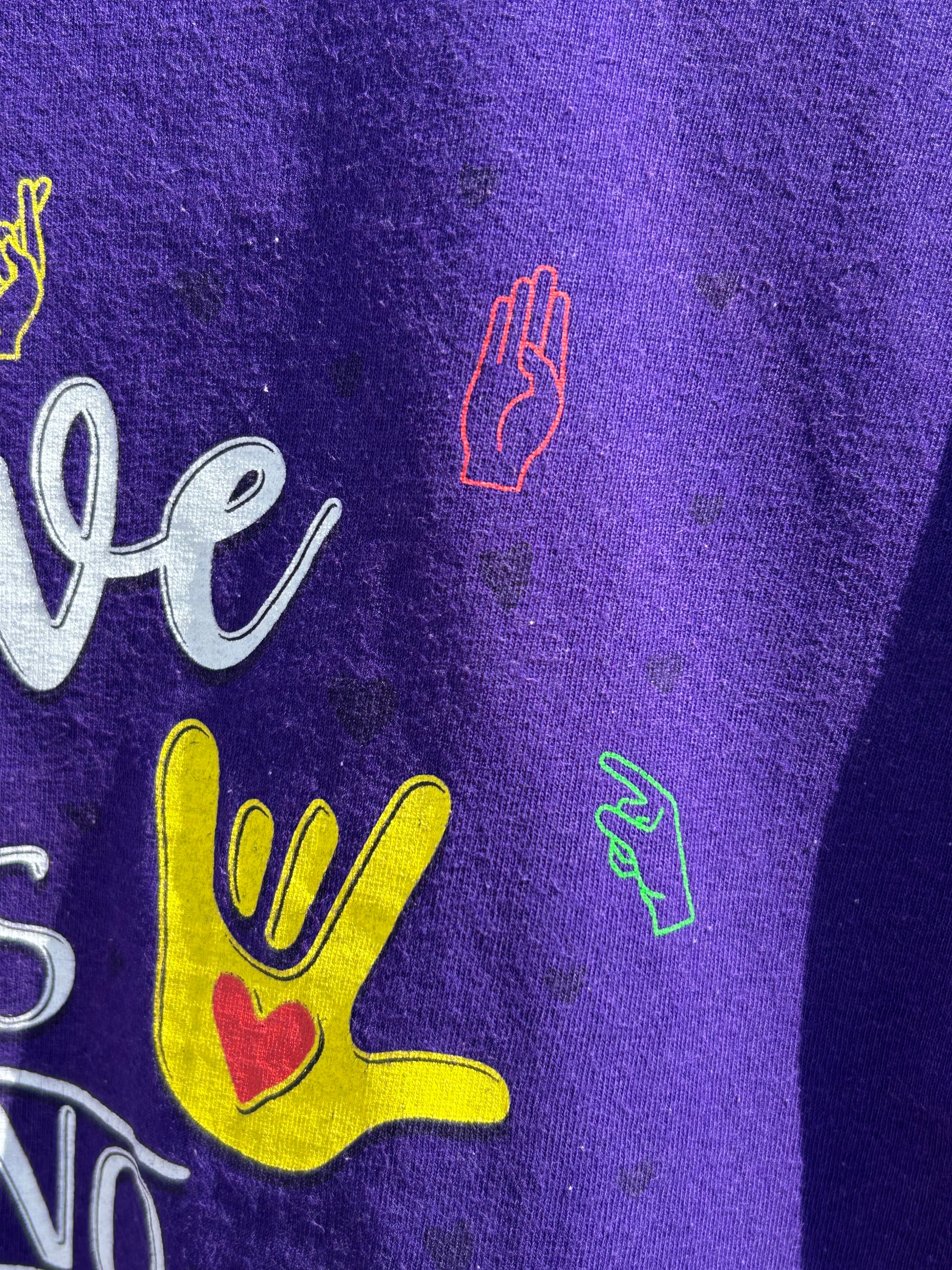 胸元にI LOVE YOUを意味するハンドサインがプリントされたTシャツ。