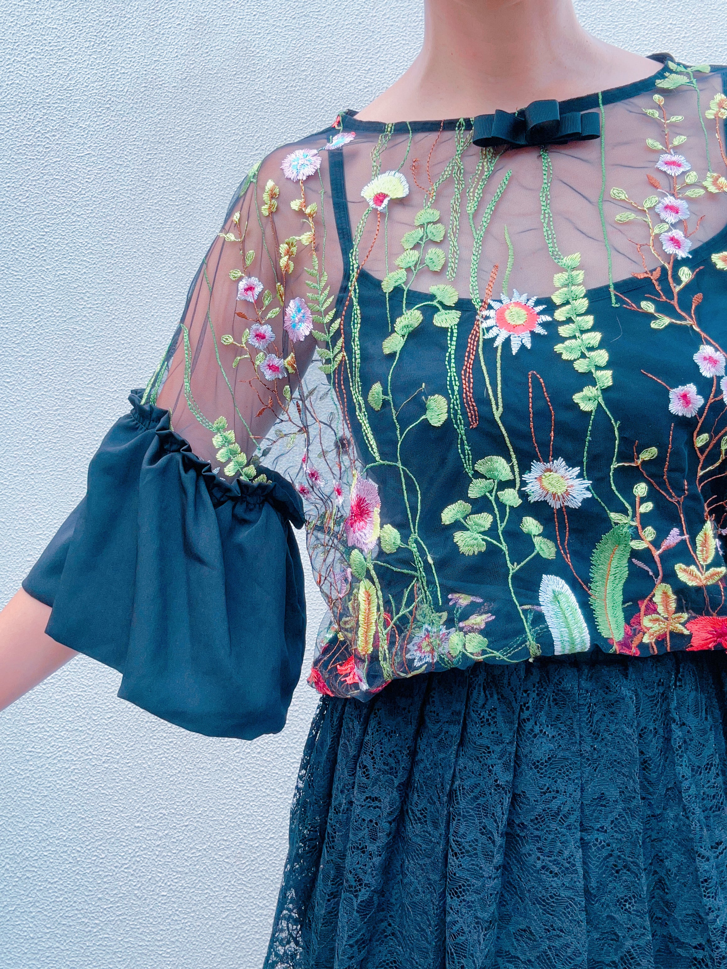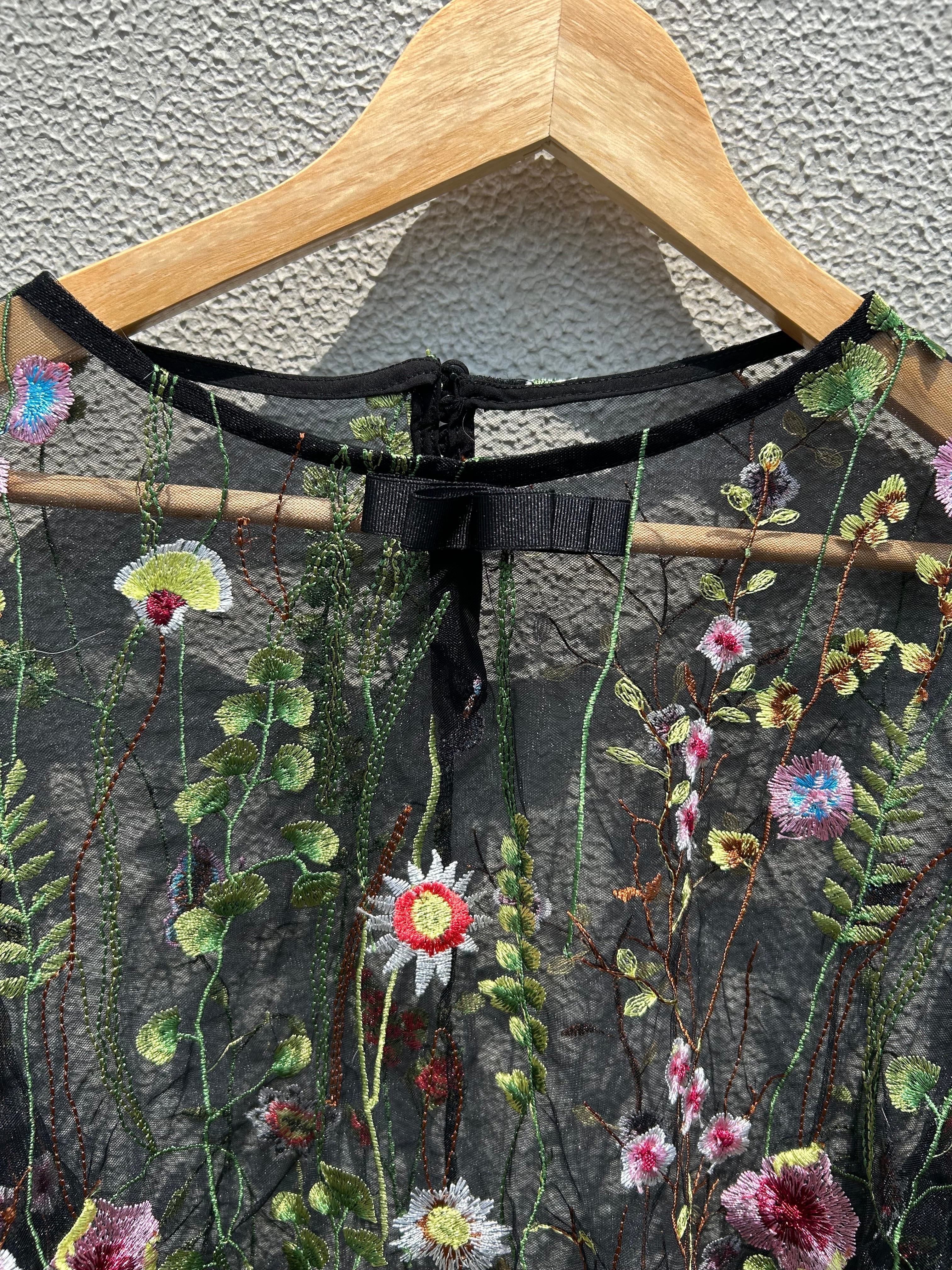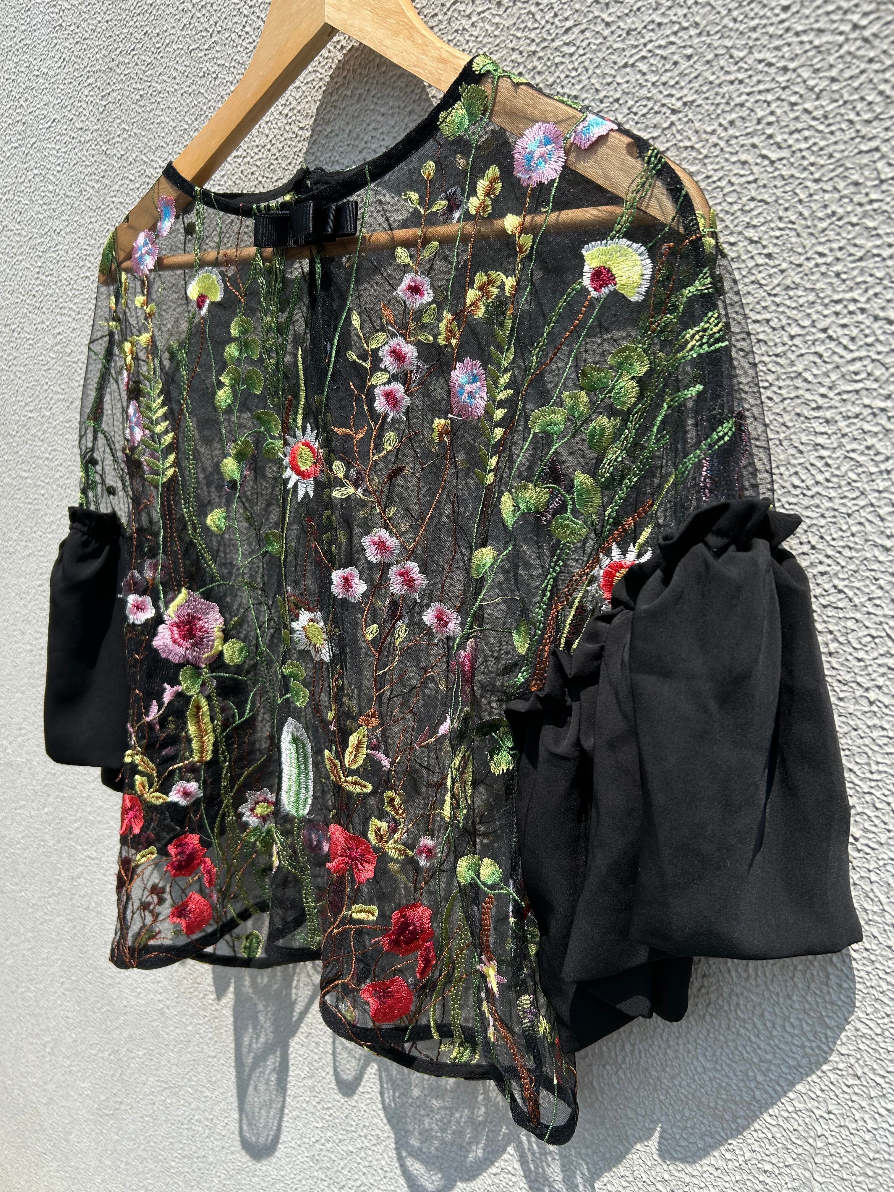前面背面にお花が刺繍され、袖はブラックの切り替えのオシャレなブラウスです。