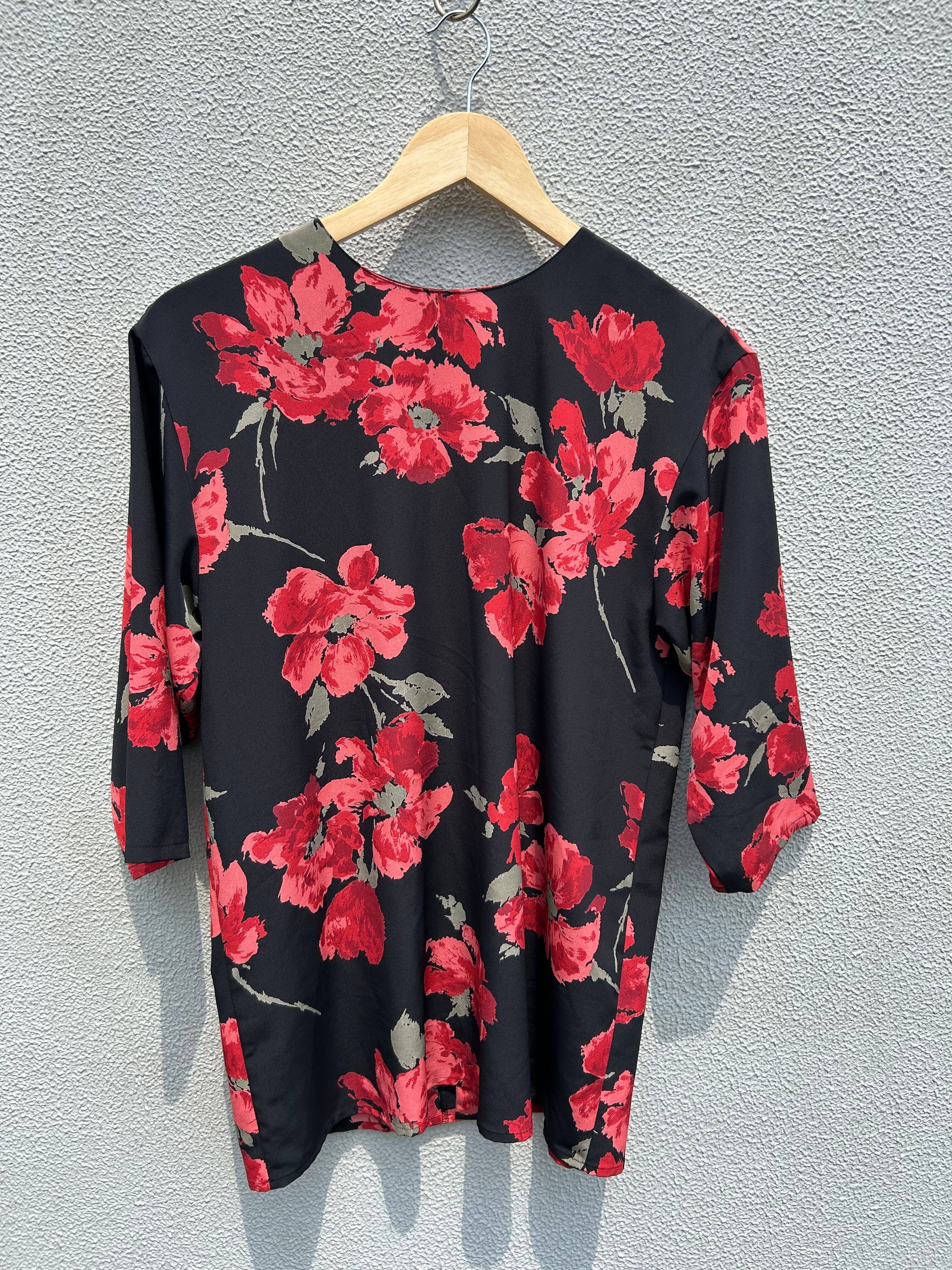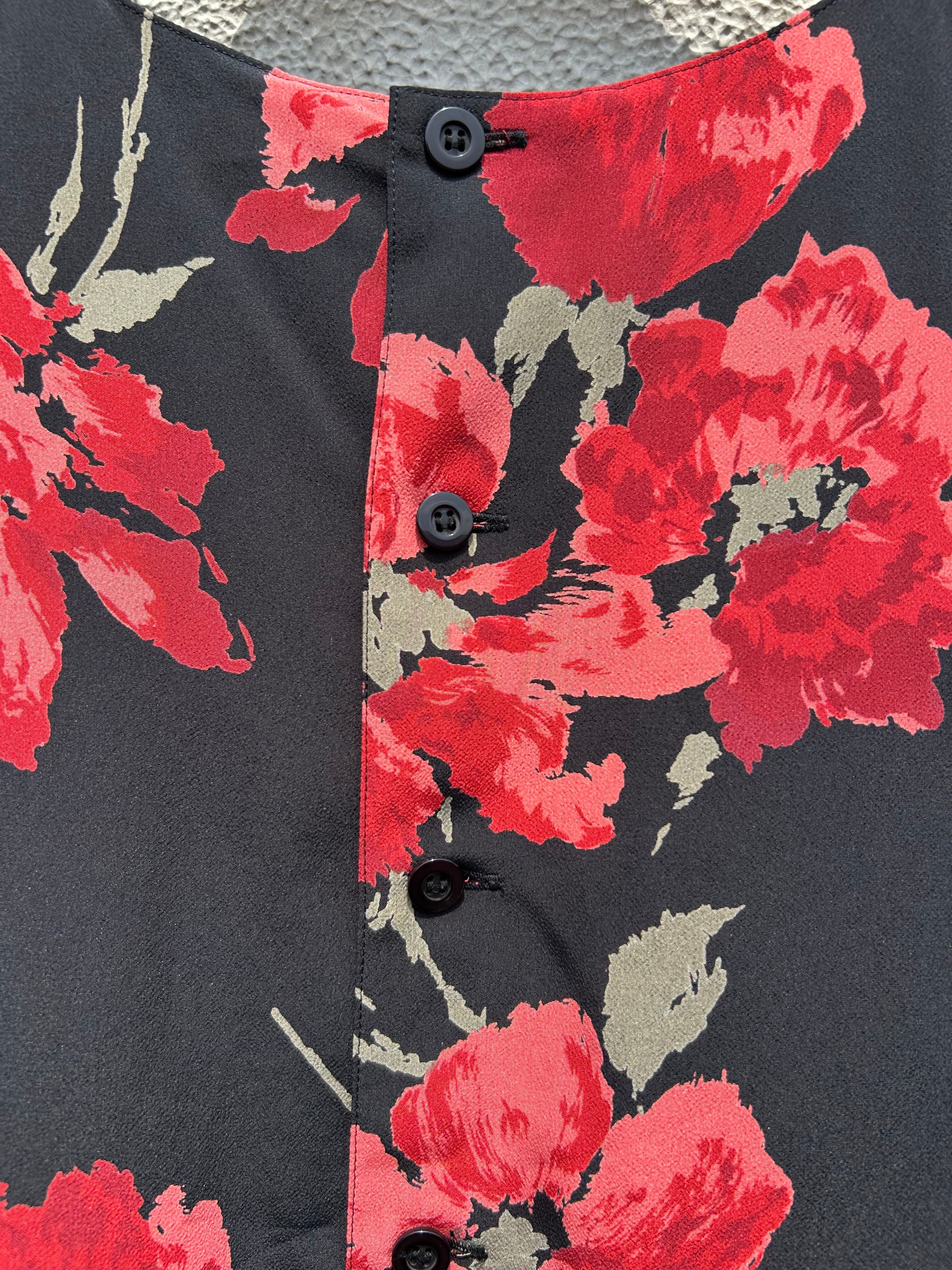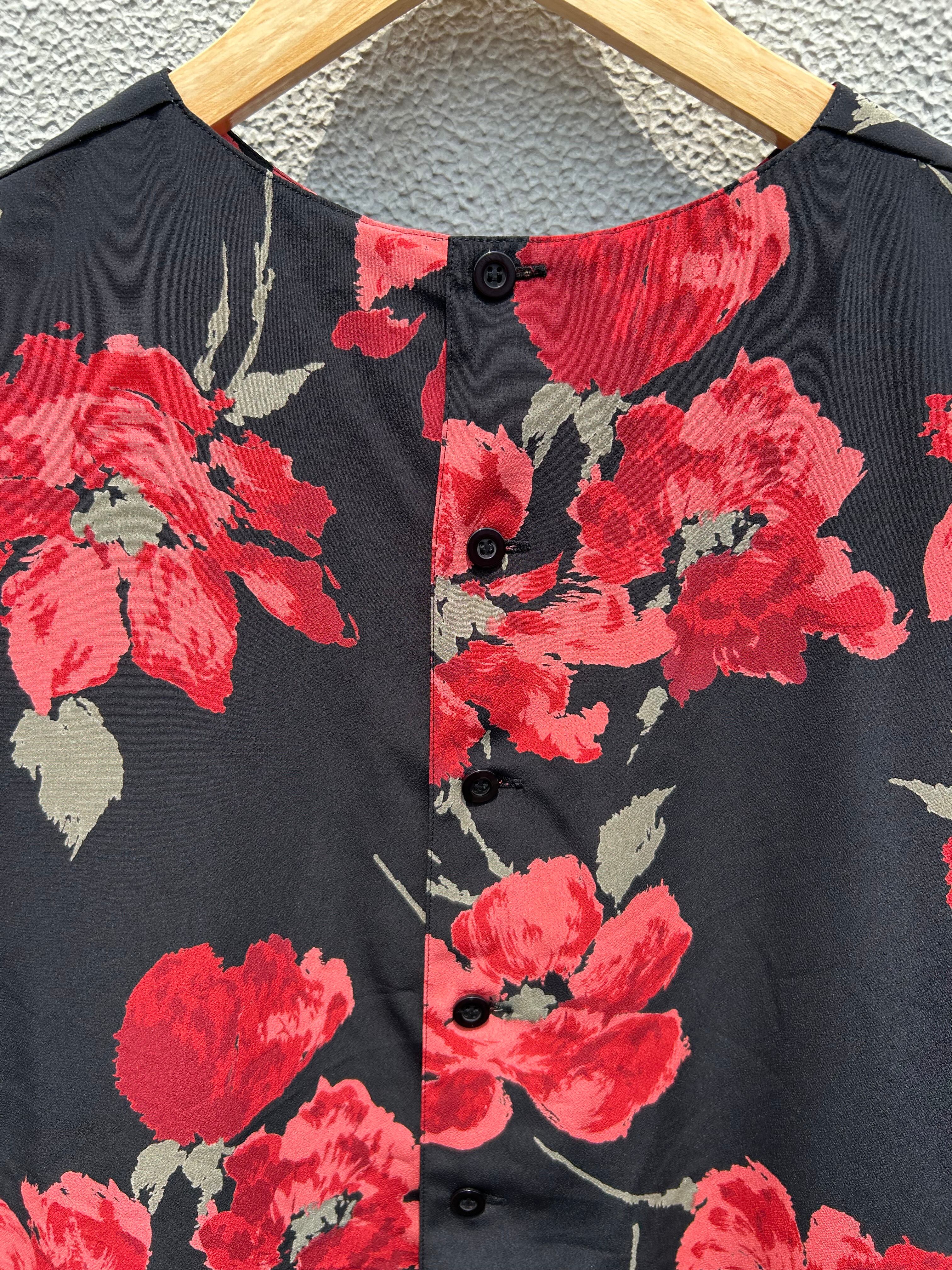 黒ベースに大きな赤い花柄のシャツ。