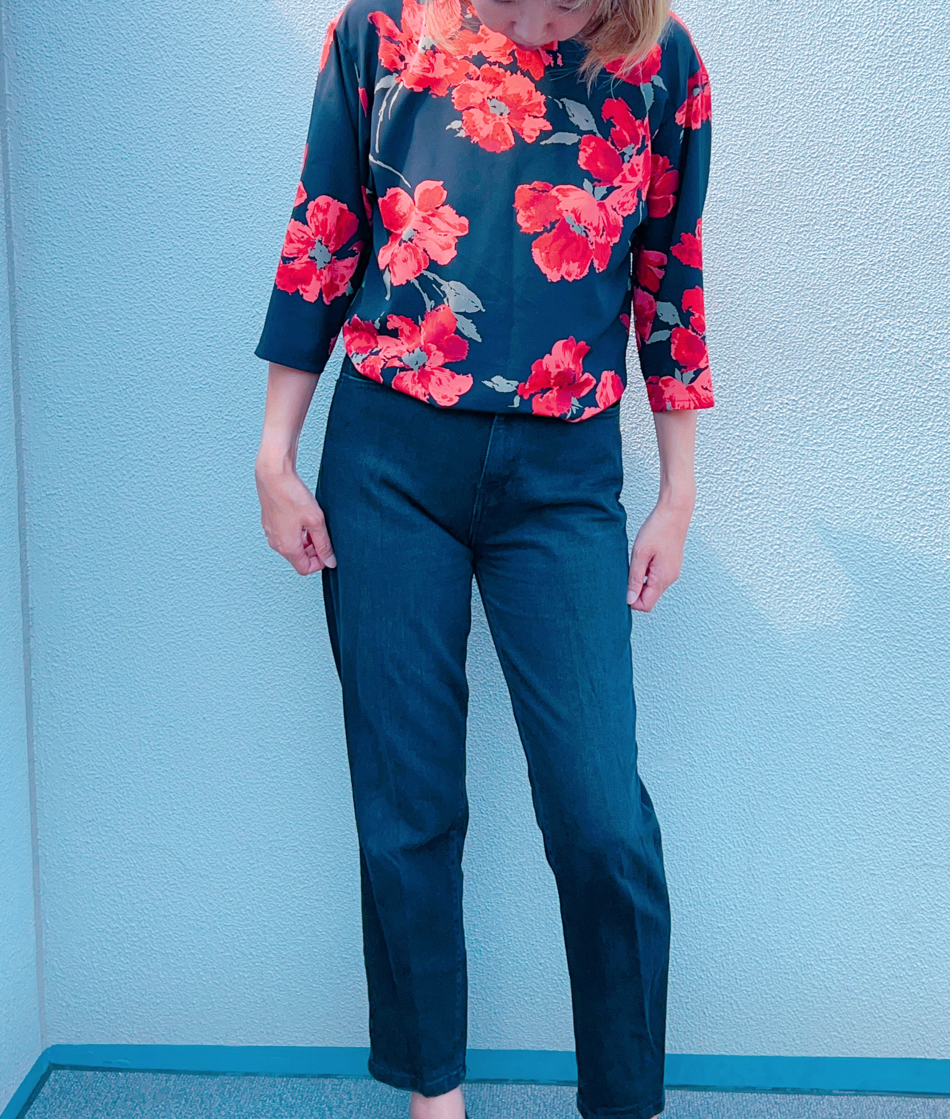 派手そうに見えますが、黒ベース、黒×赤のデザインは誰にでも似合うので、ぜひ挑戦してほしい1枚。7分袖なので秋まで着ていただけます!