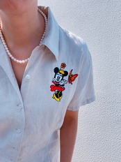 左胸元にウキウキのミニーちゃんが刺繍されたリネンシャツ。