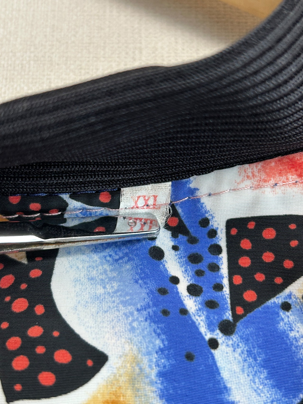 カラフルでど派手な総柄のリバーシブルナイロンカーディガン。