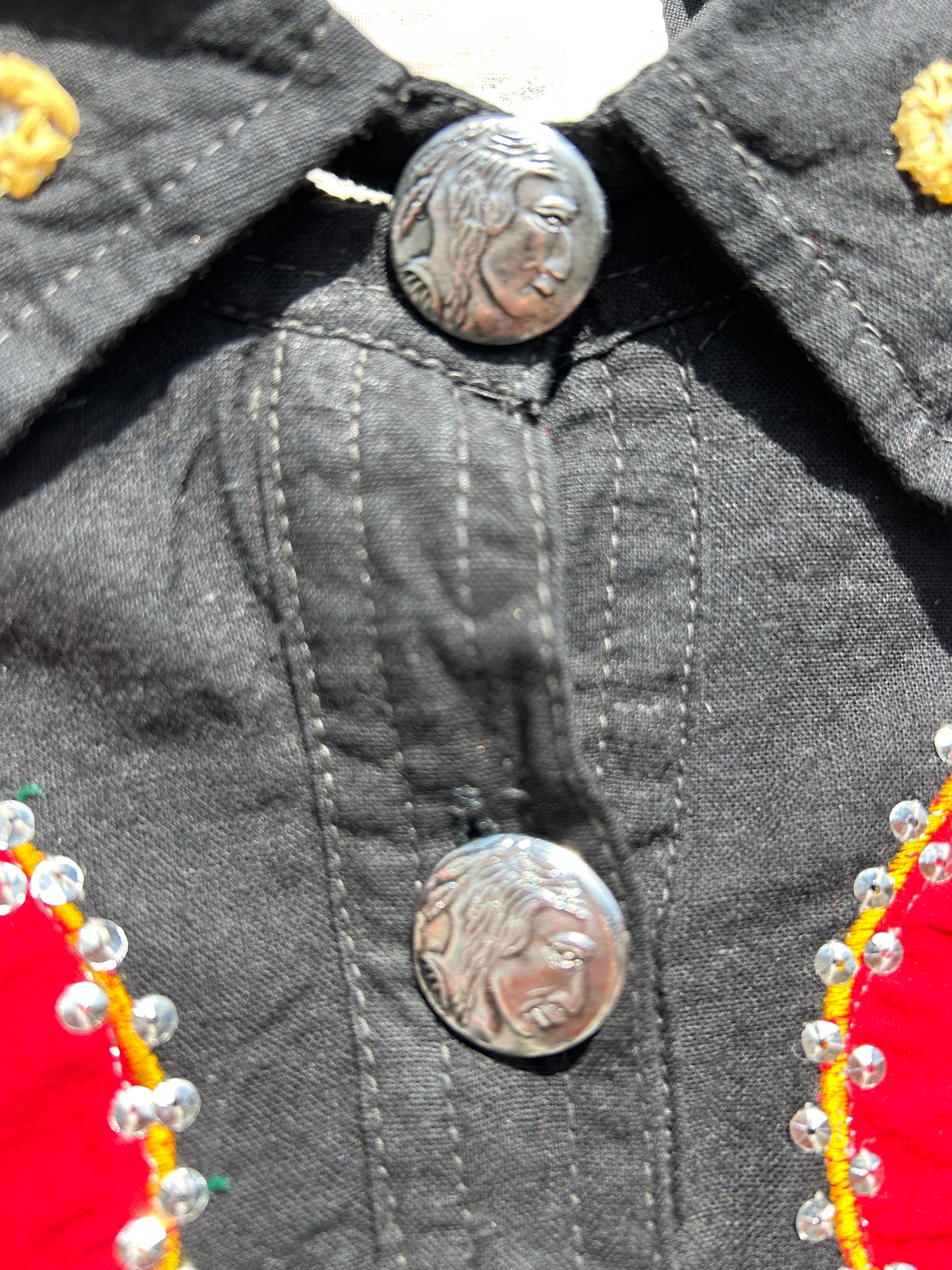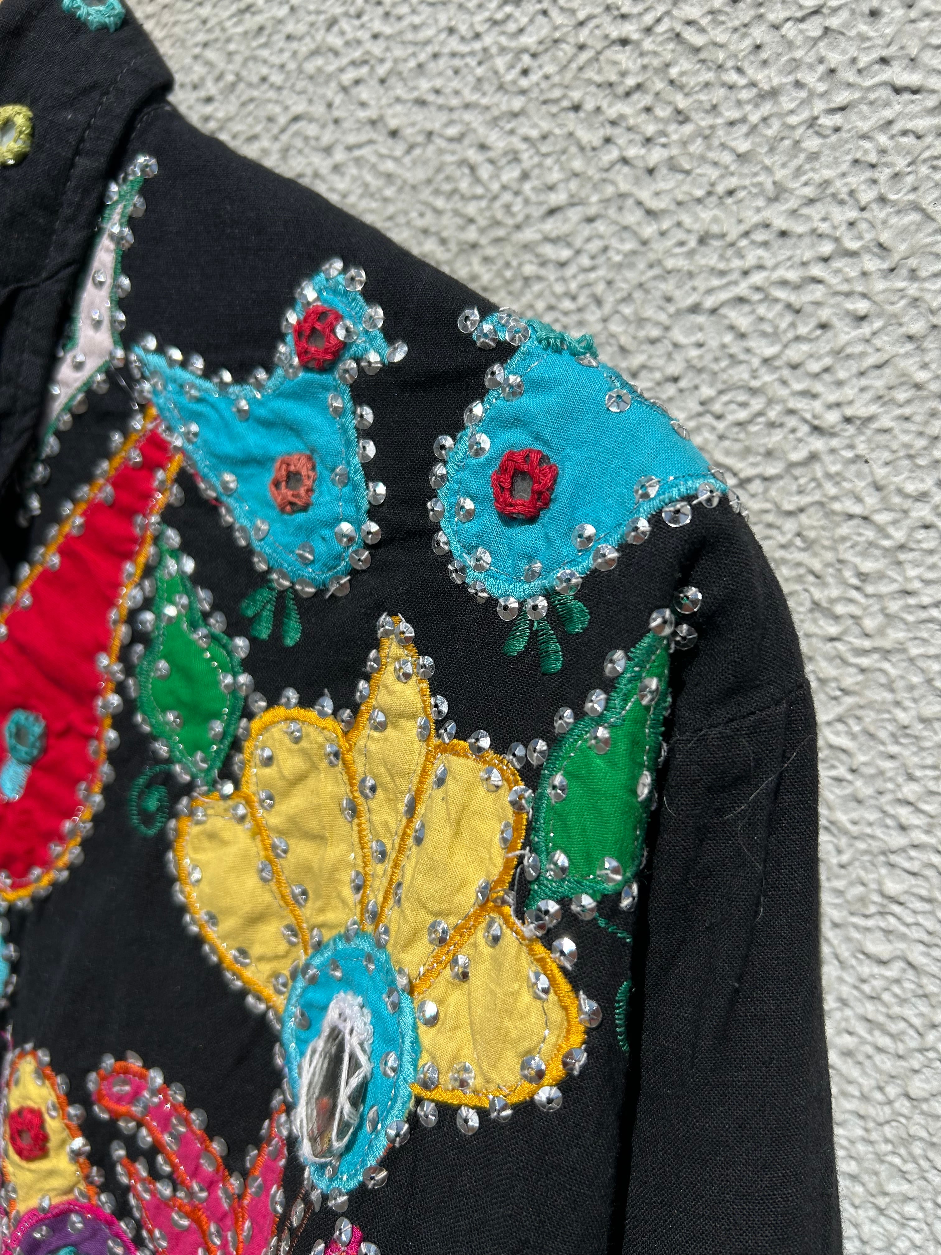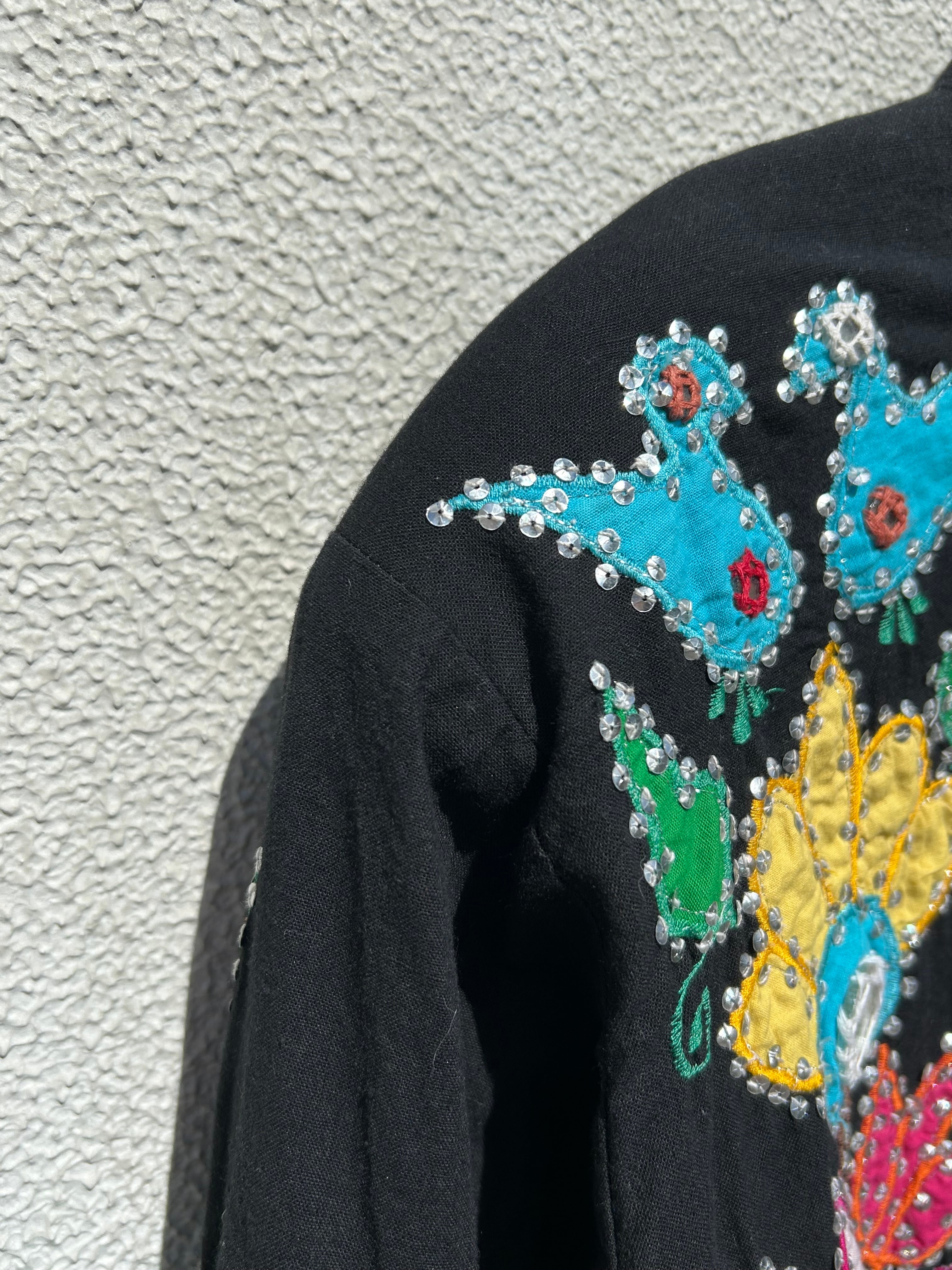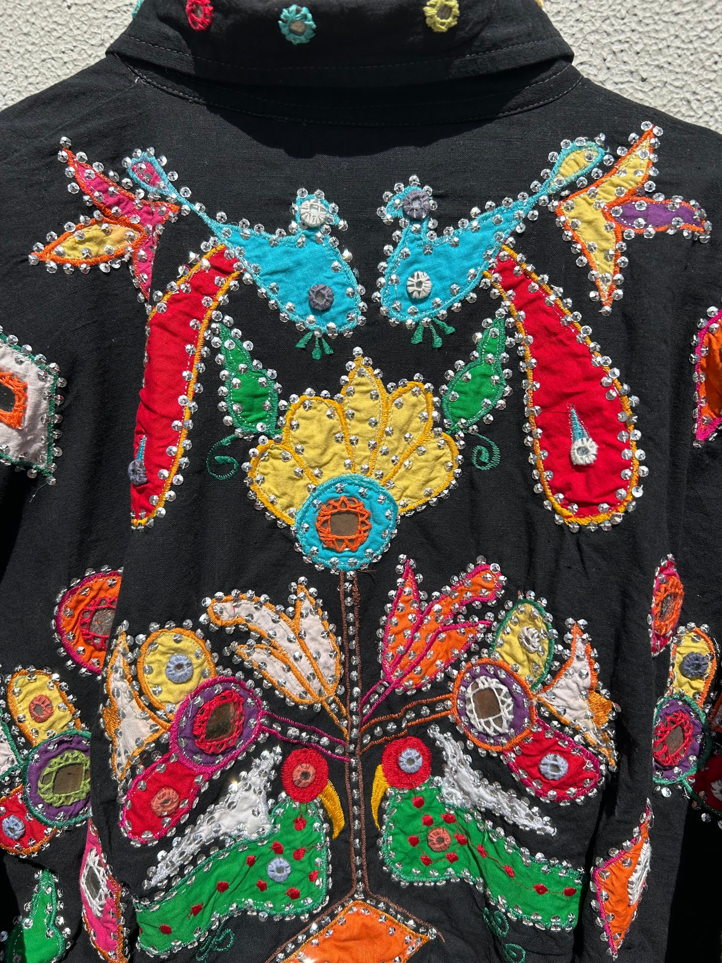 ミラーを縫い付け、その周りを刺繍で装飾する、インドやパキスタン地方の伝統的なミラーワーク(ミラー刺繍)がぎっしりとこれでもか!と全面に施されたジャケットです。