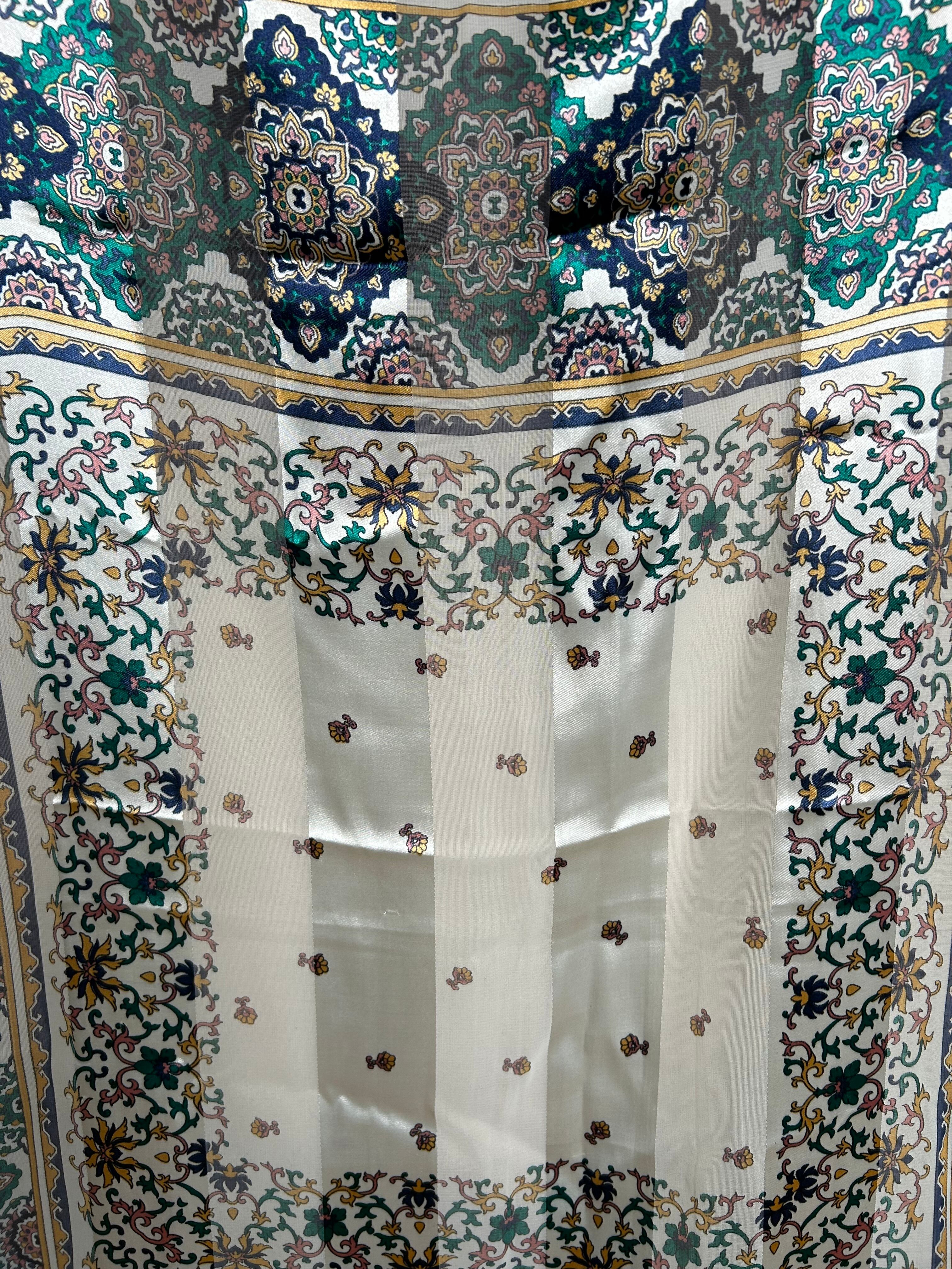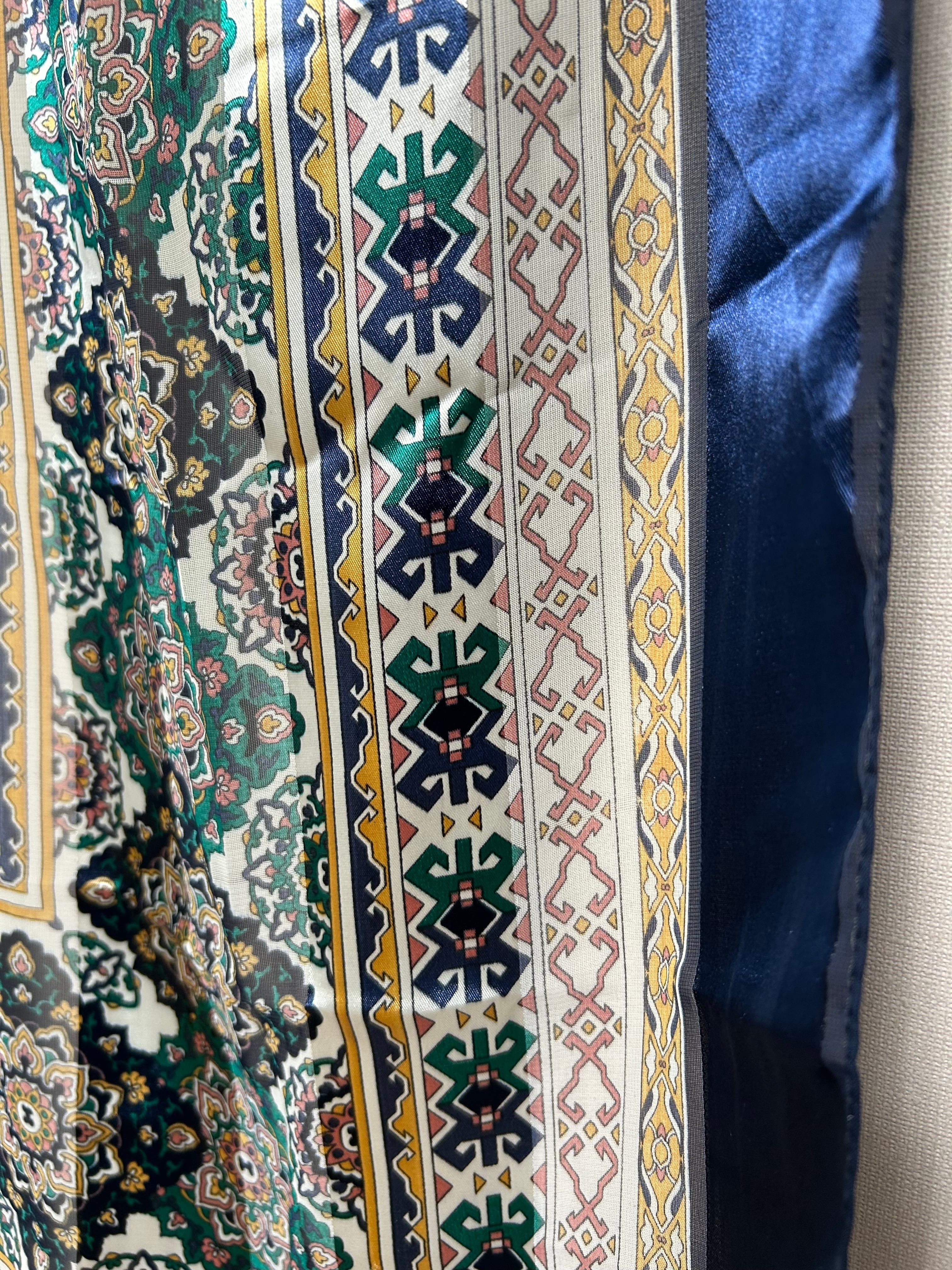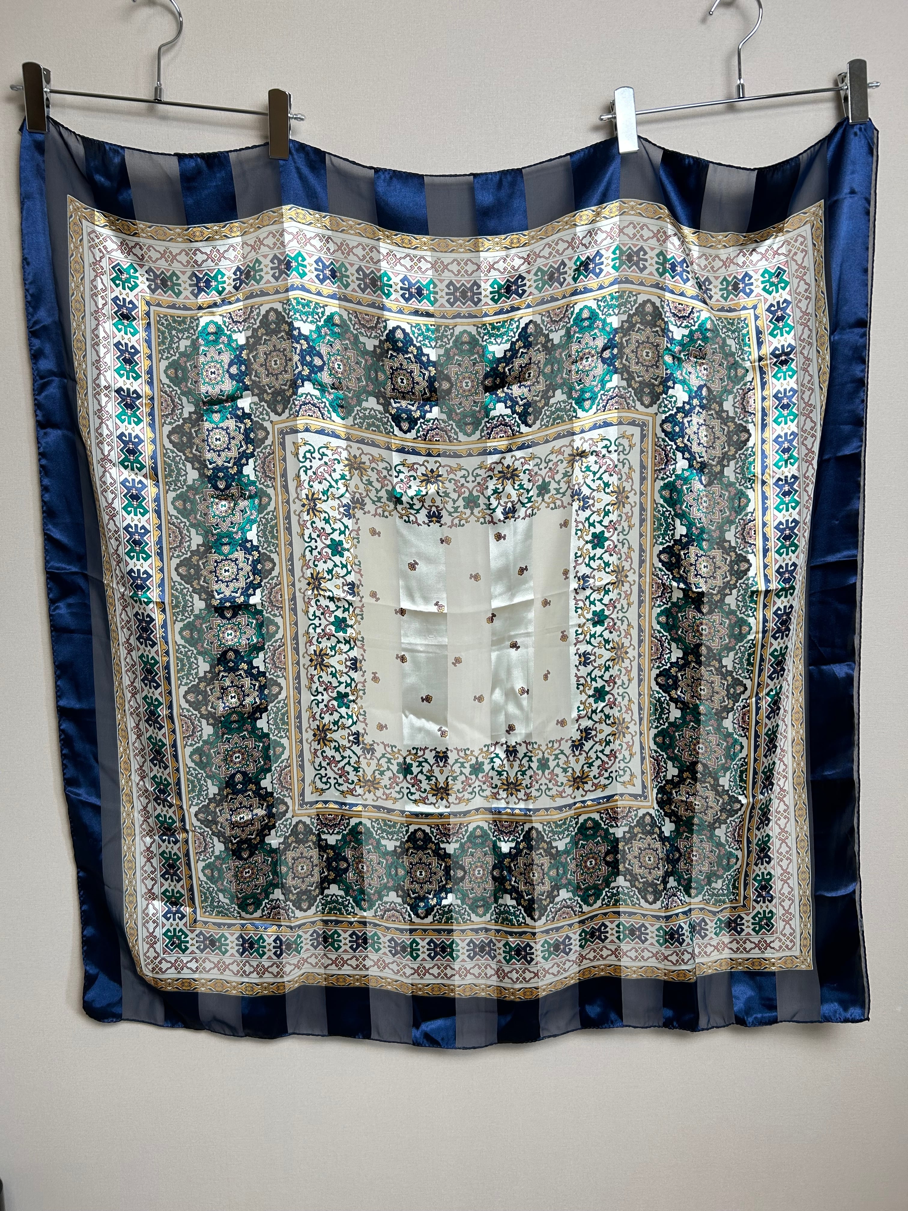 大判サイズです。ターバン風、首元、ビスチェ風に巻いたり、巾着バッグにしたり、ベルト風、ディスプレイなどインテリアにも使える一枚です。