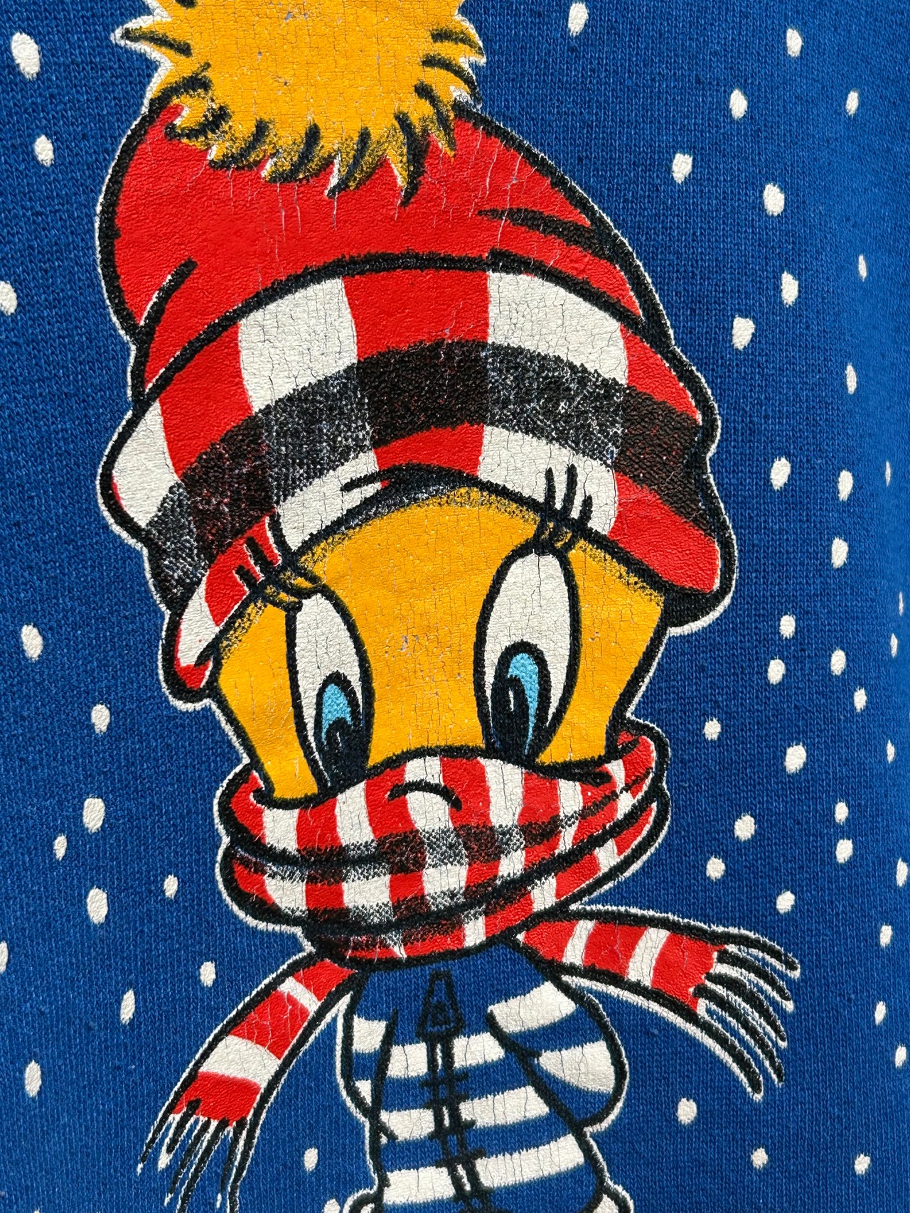 雪の日にポンポン帽子とマフラーでガッツリ防寒しているトゥイーティーのプリントがかわいいスウェット。