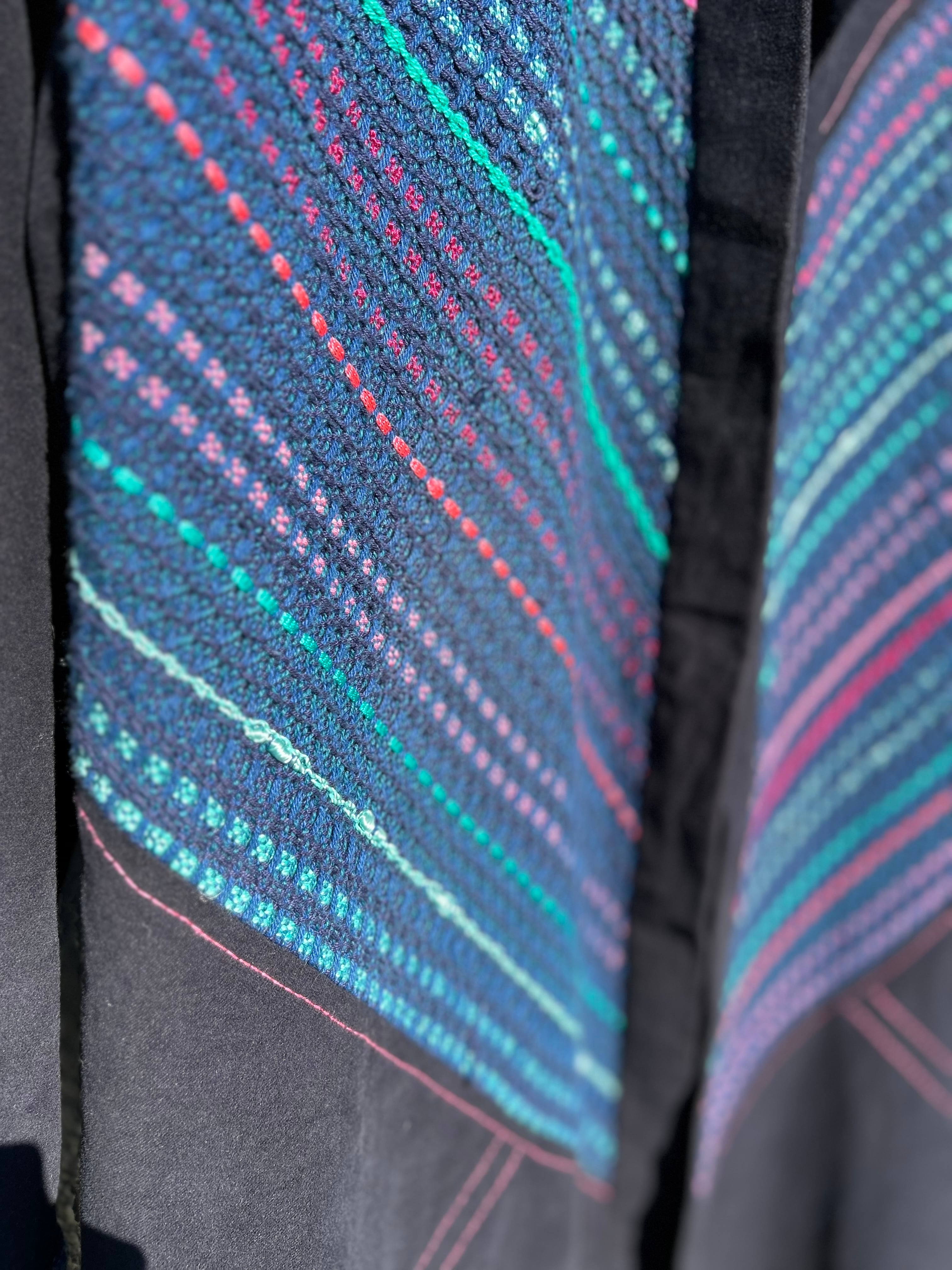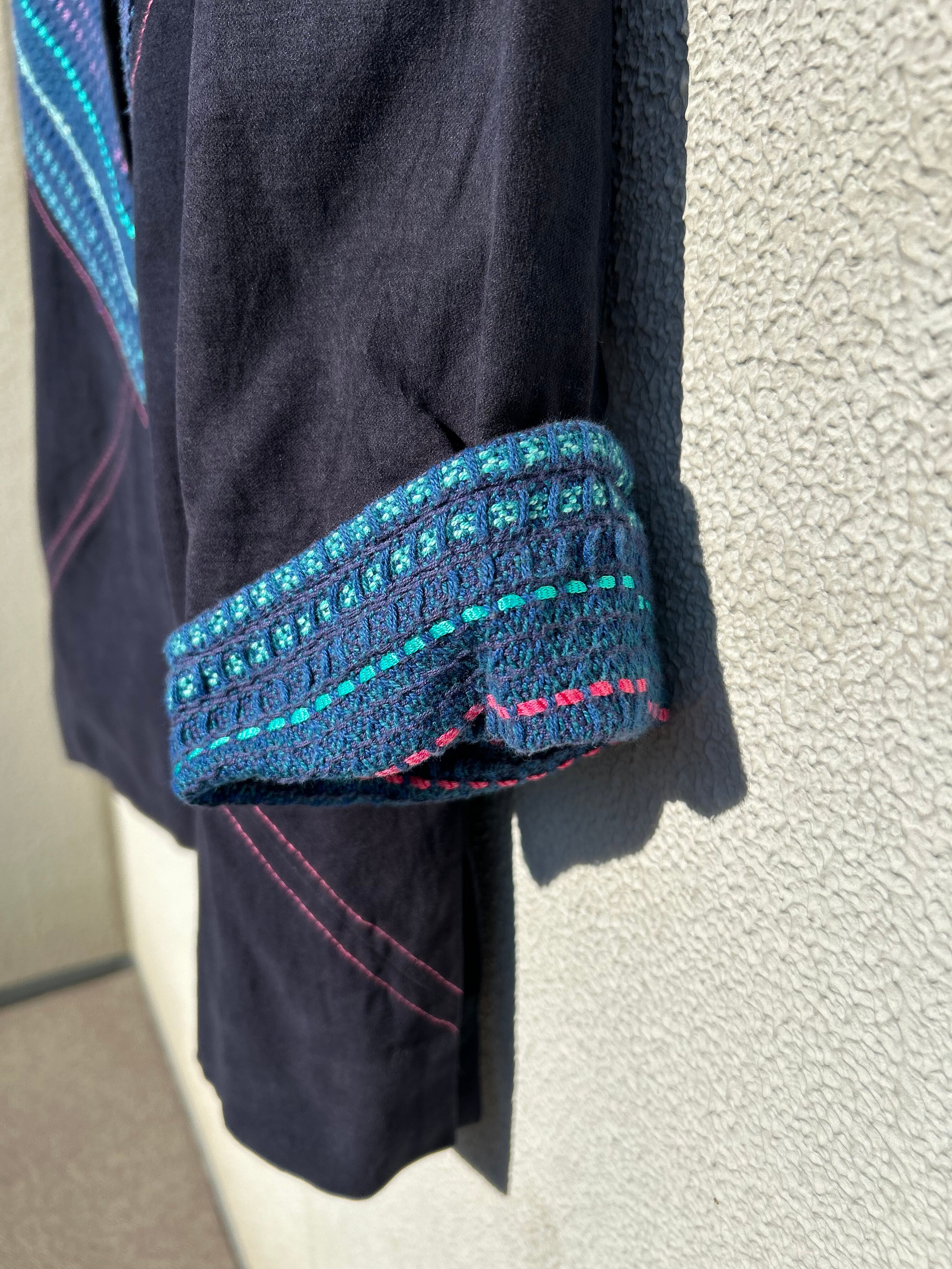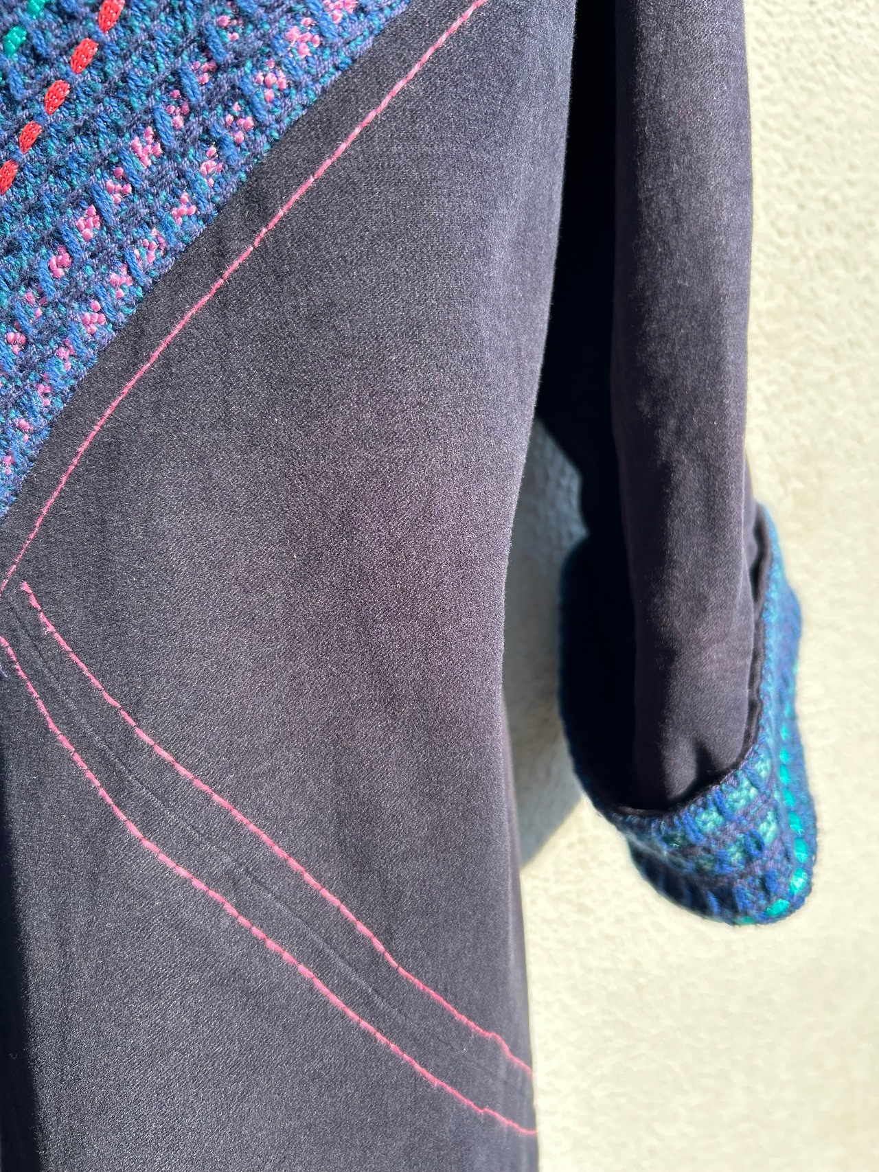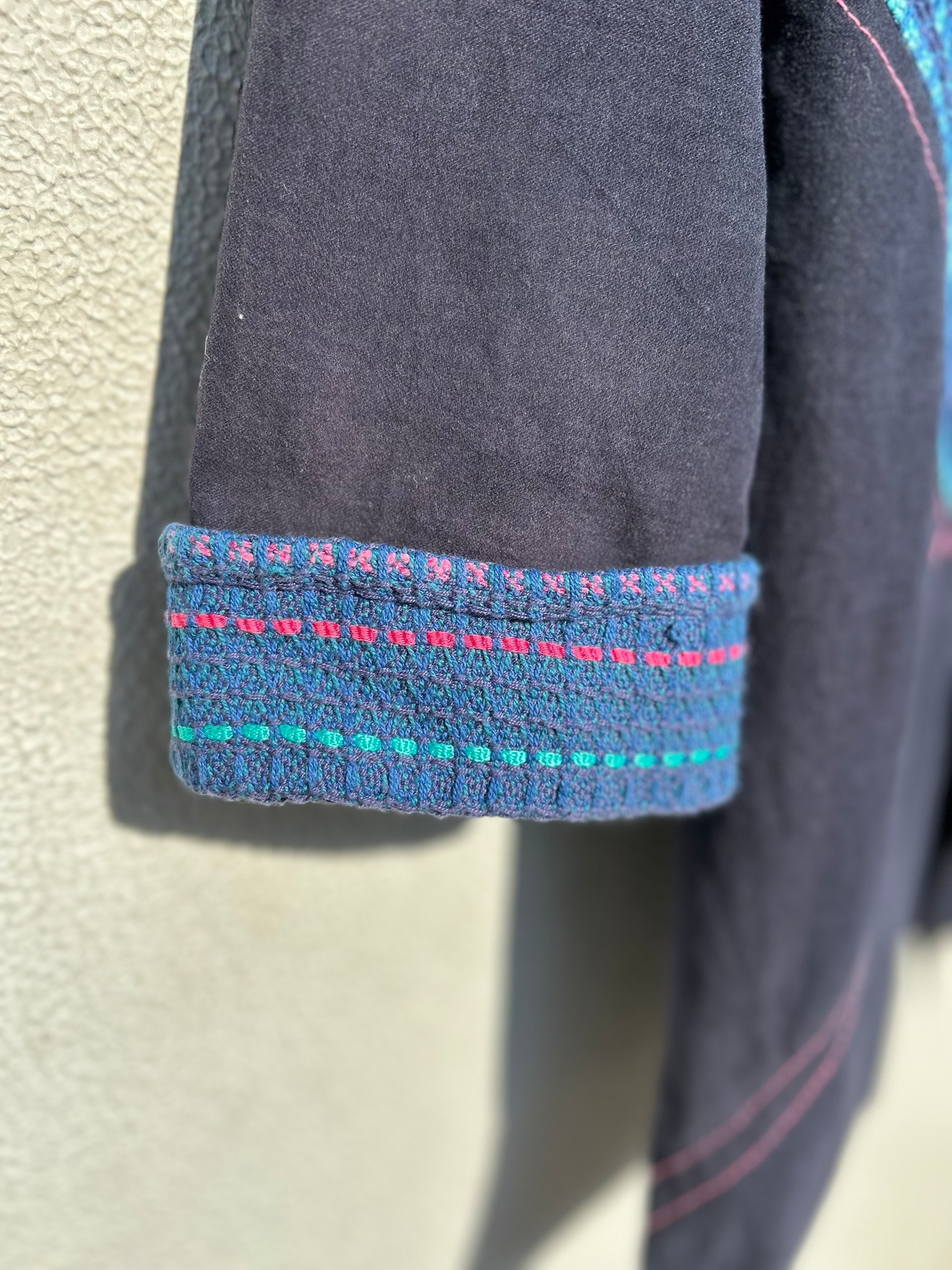 全面、背面、袖口にカラフルな編み模様、表面の縫い糸がピンクなのもポイント!