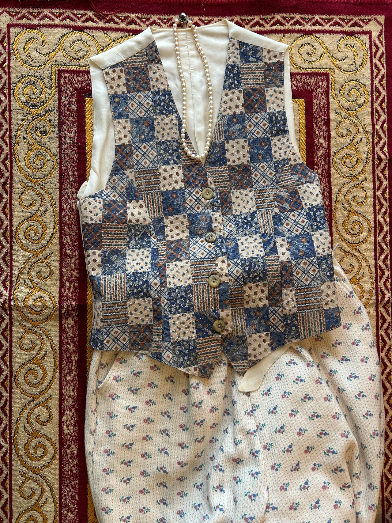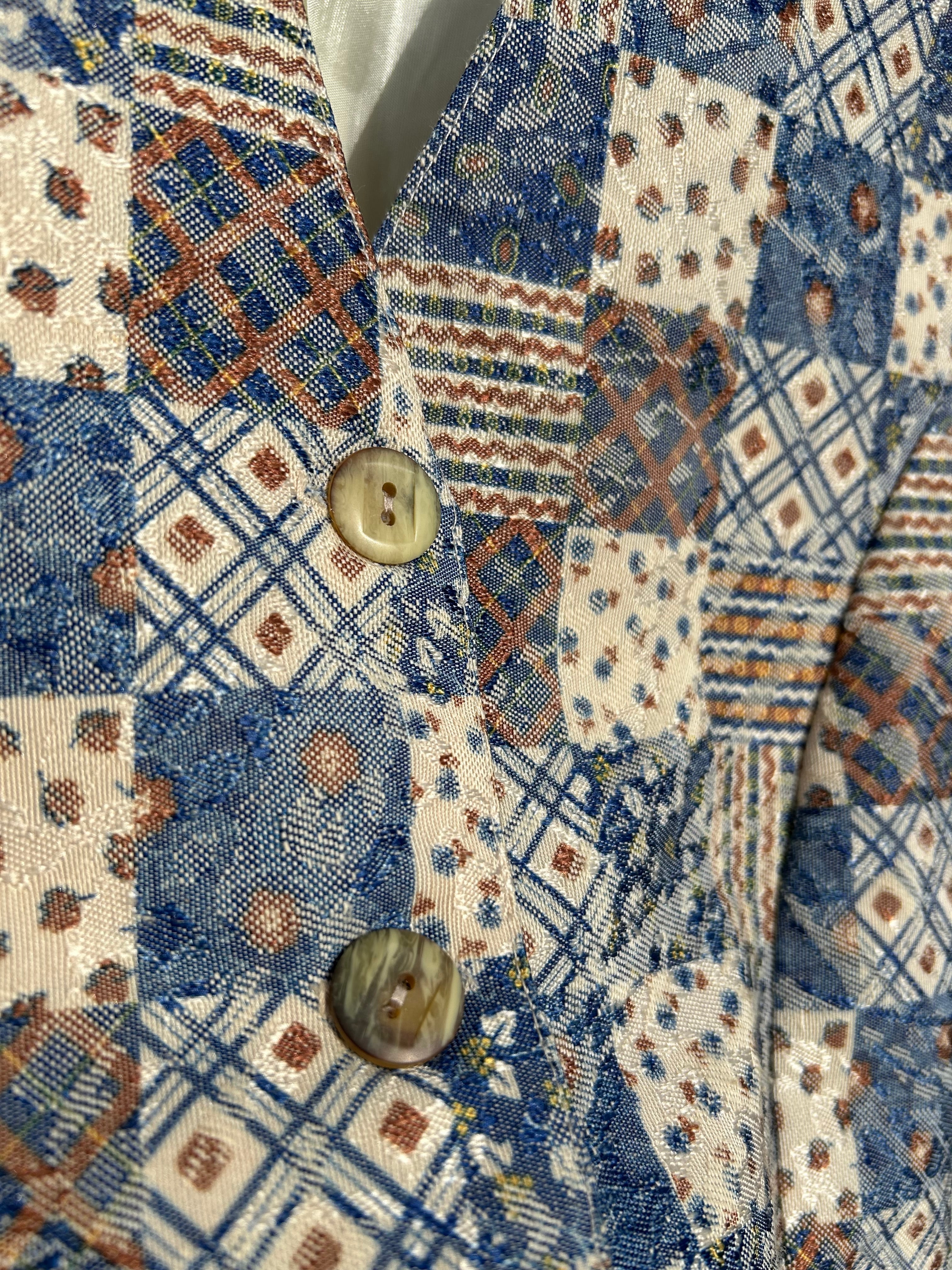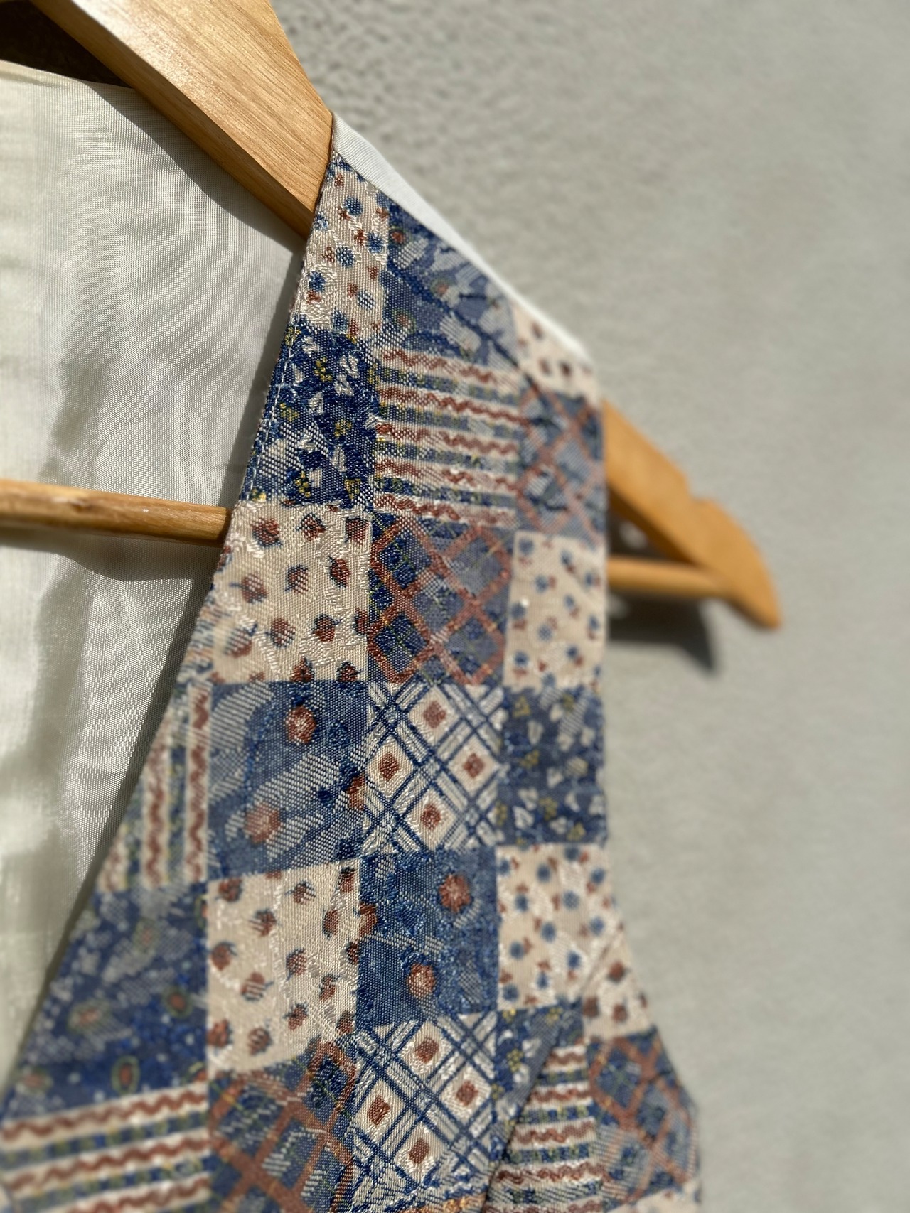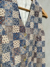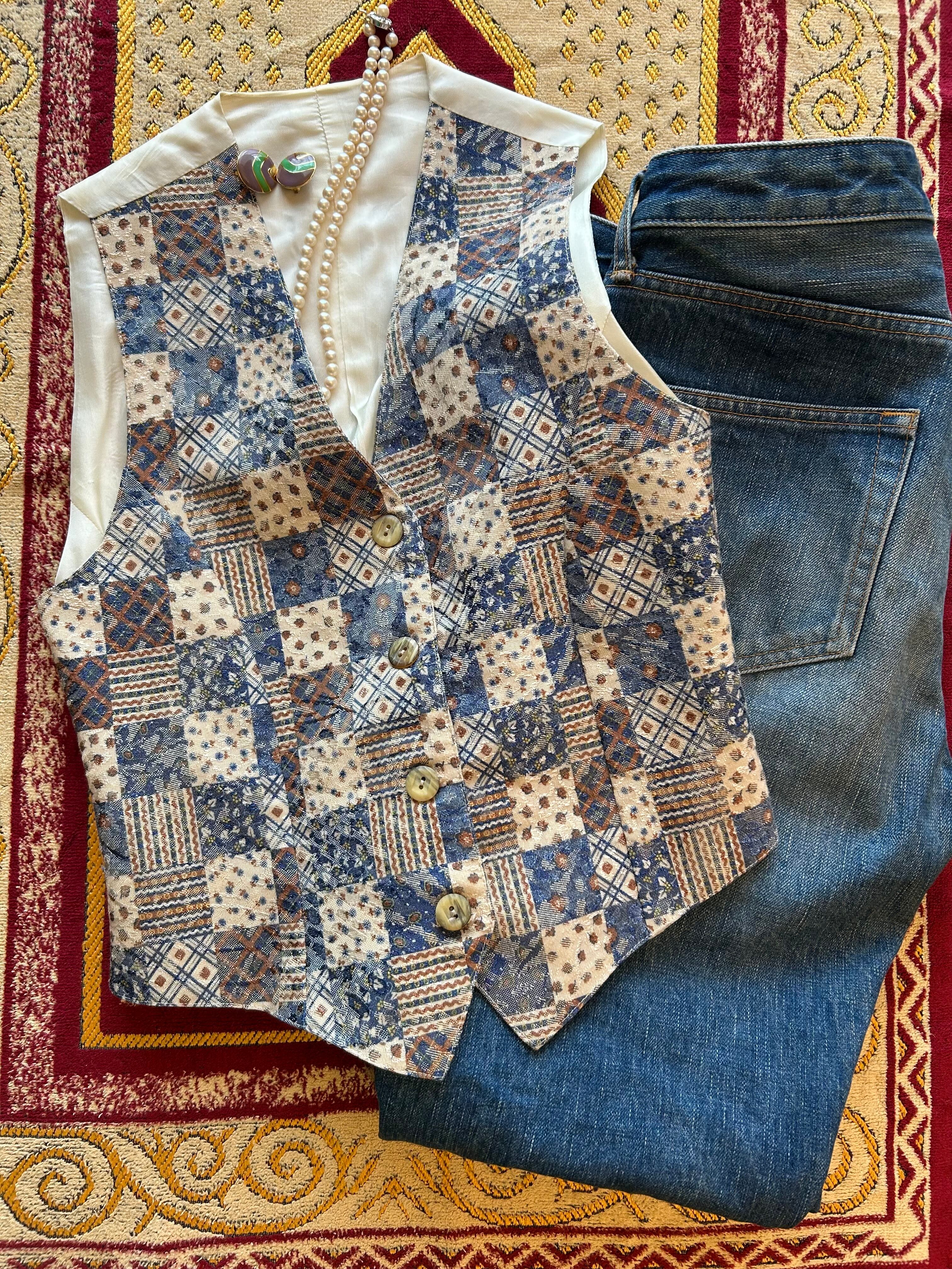 パステルベースのベージュとブルーのパッチワークデザインのベスト。