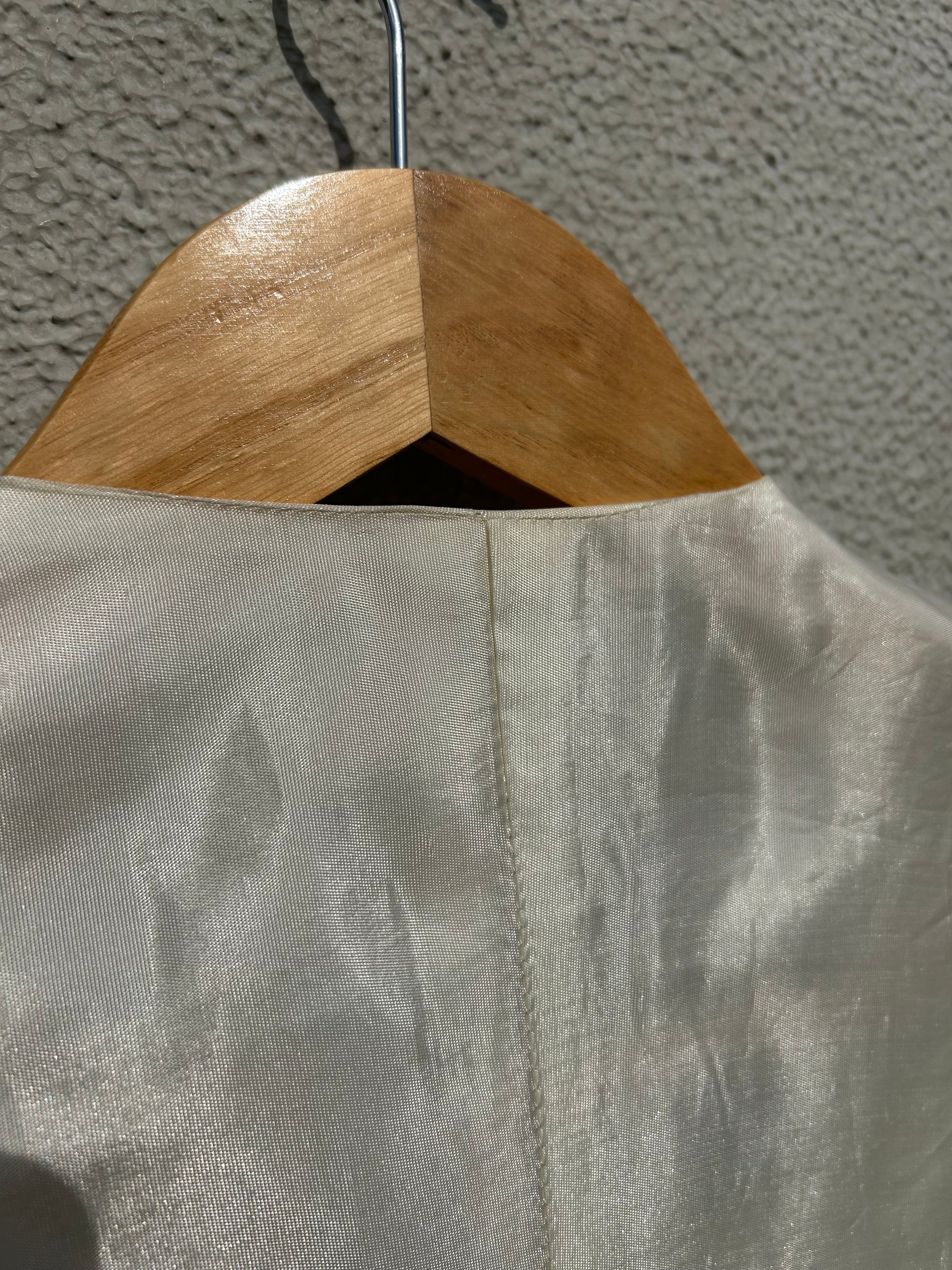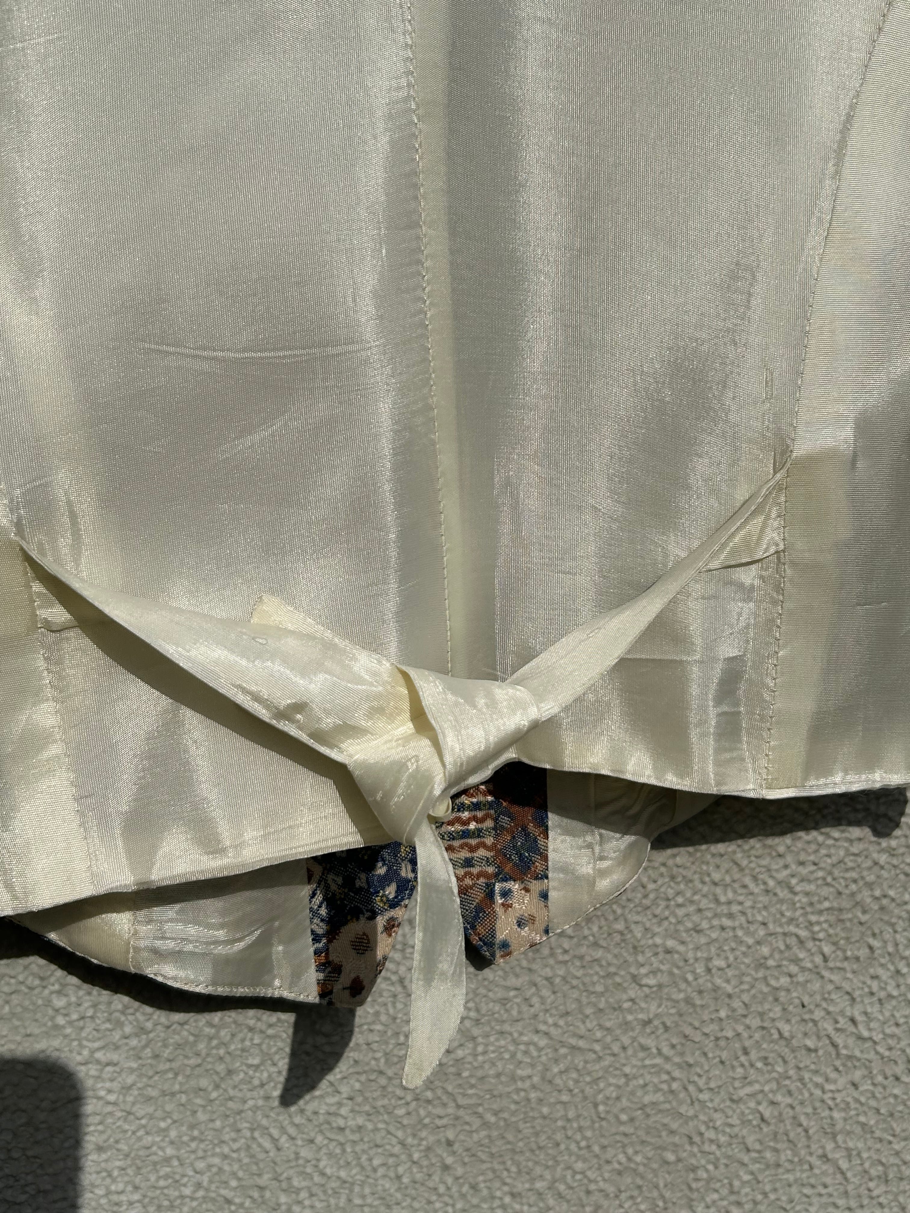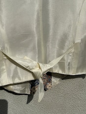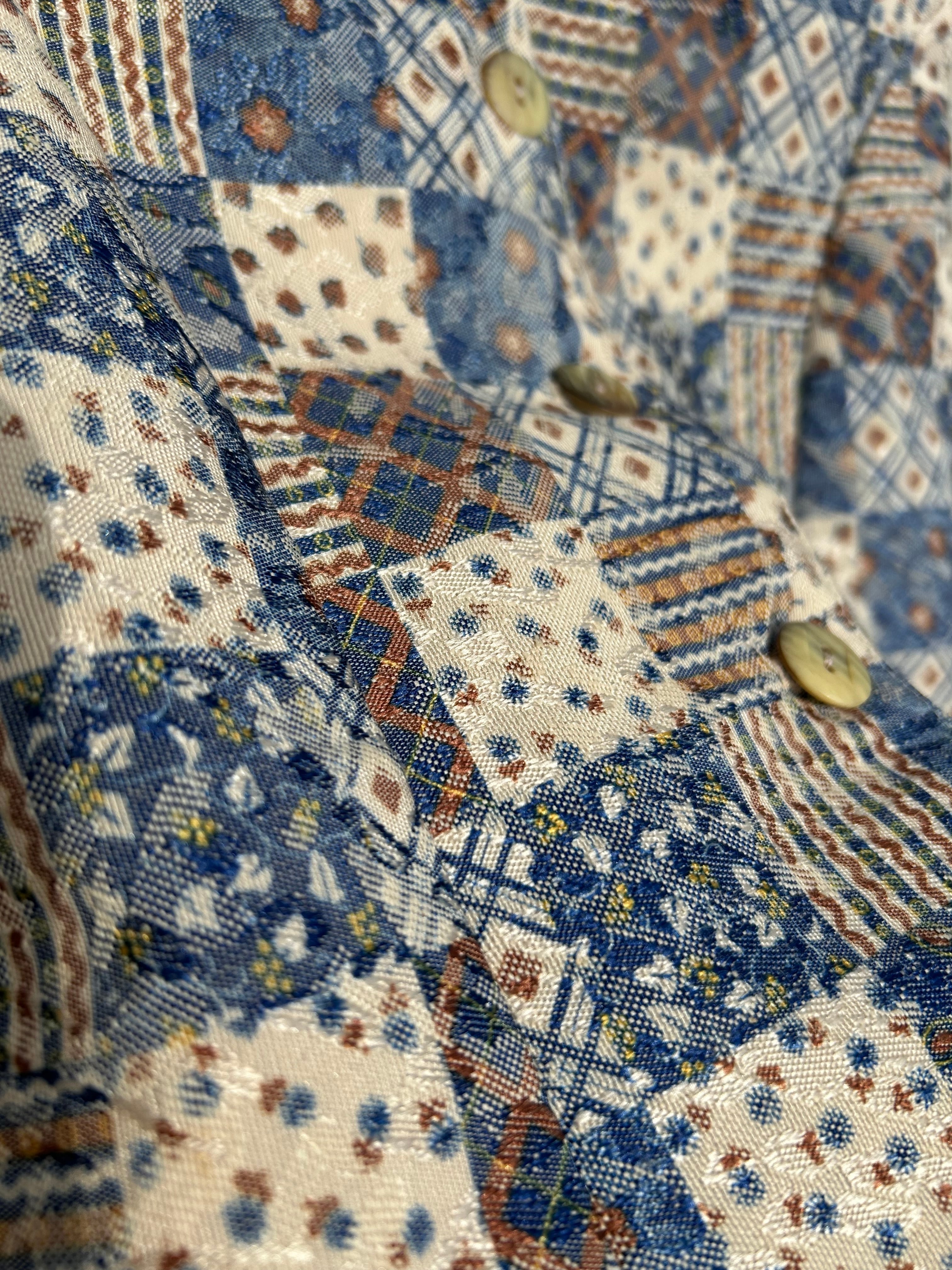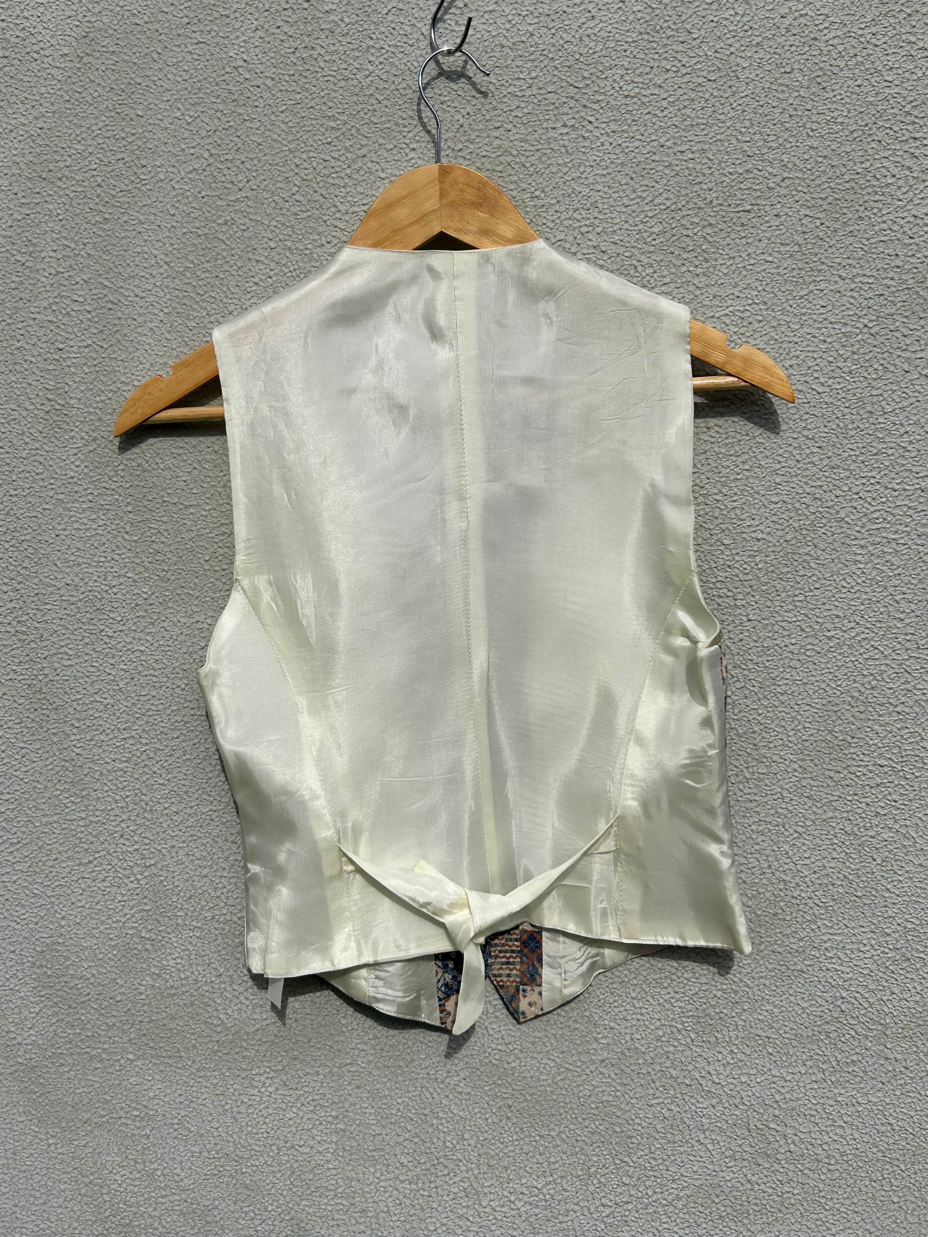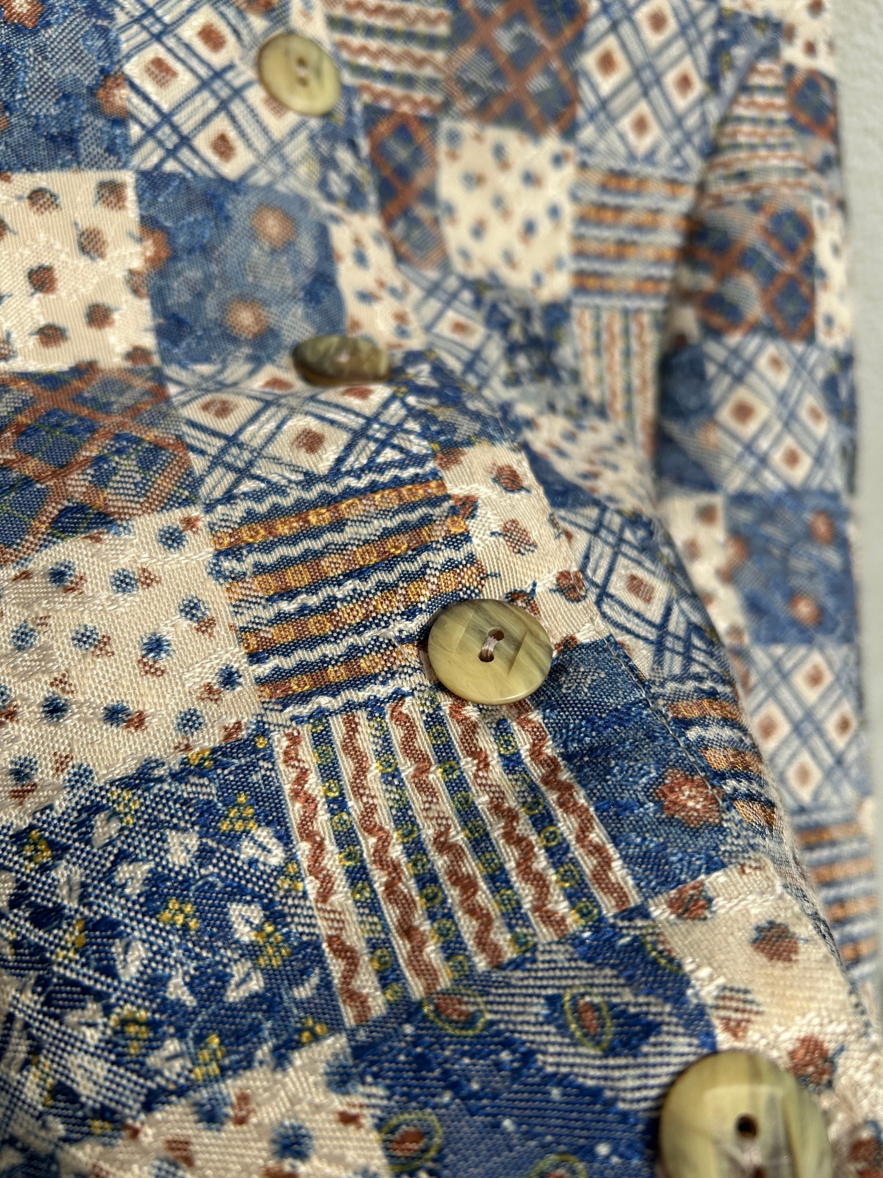 パステルベースのベージュとブルーのパッチワークデザインのベスト。