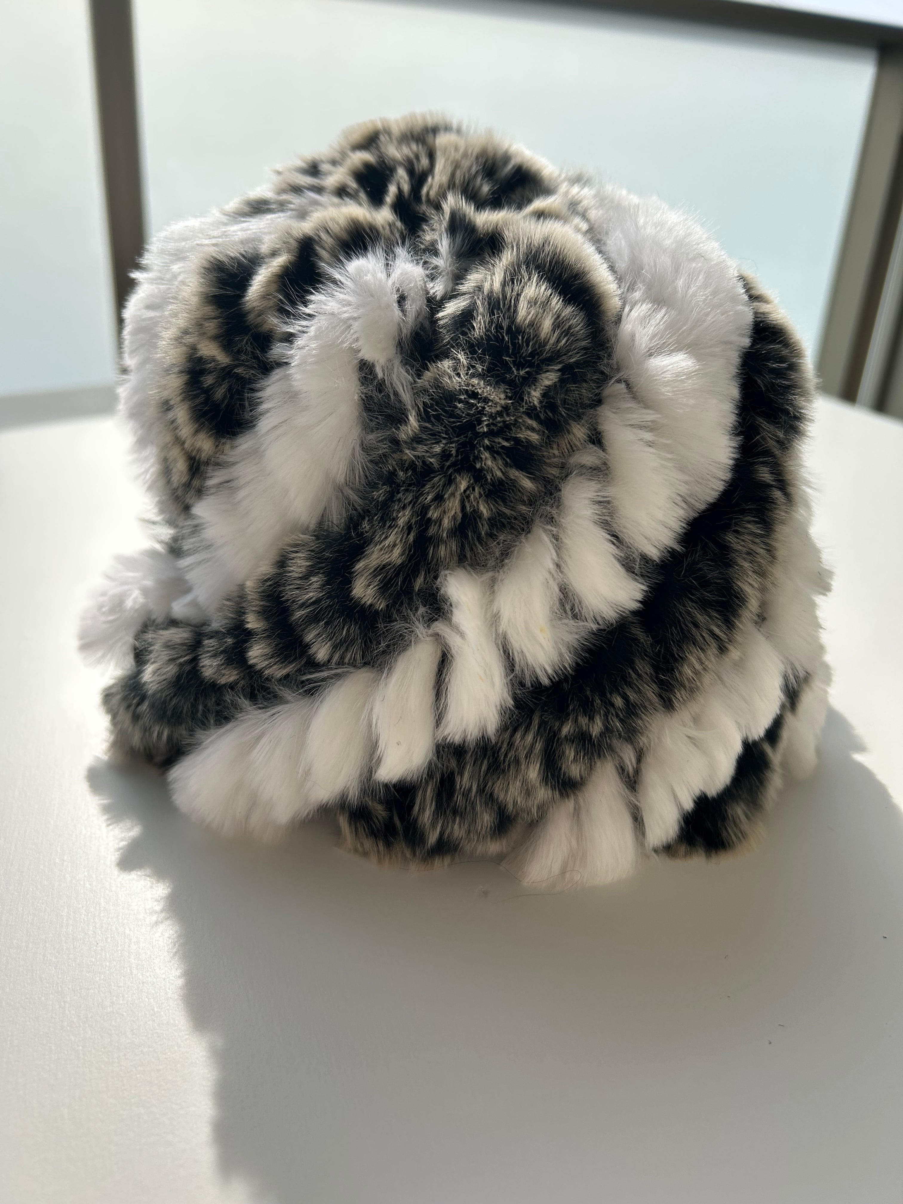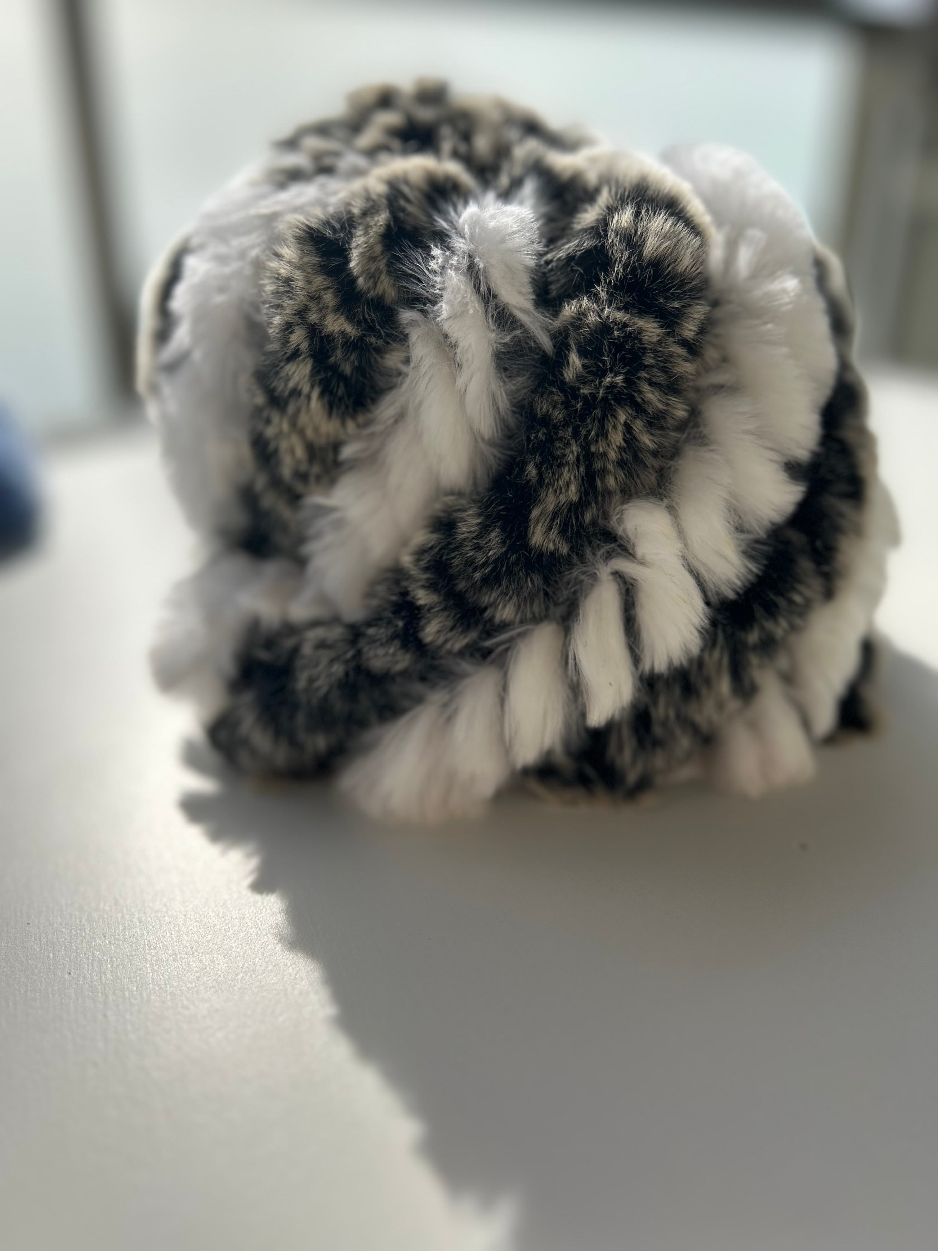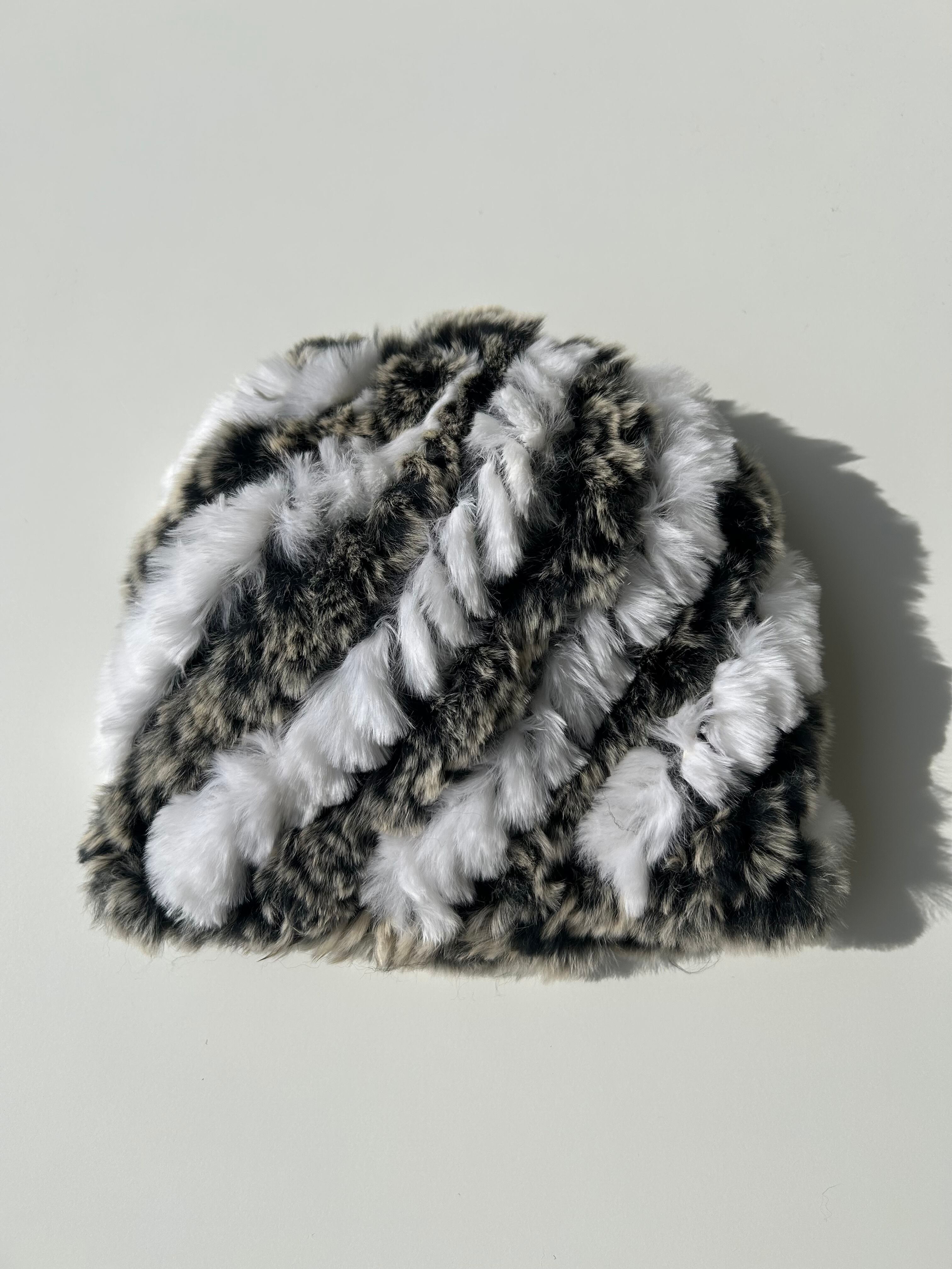 白・黒・グレーの混じった斜めストライプなファー帽子。