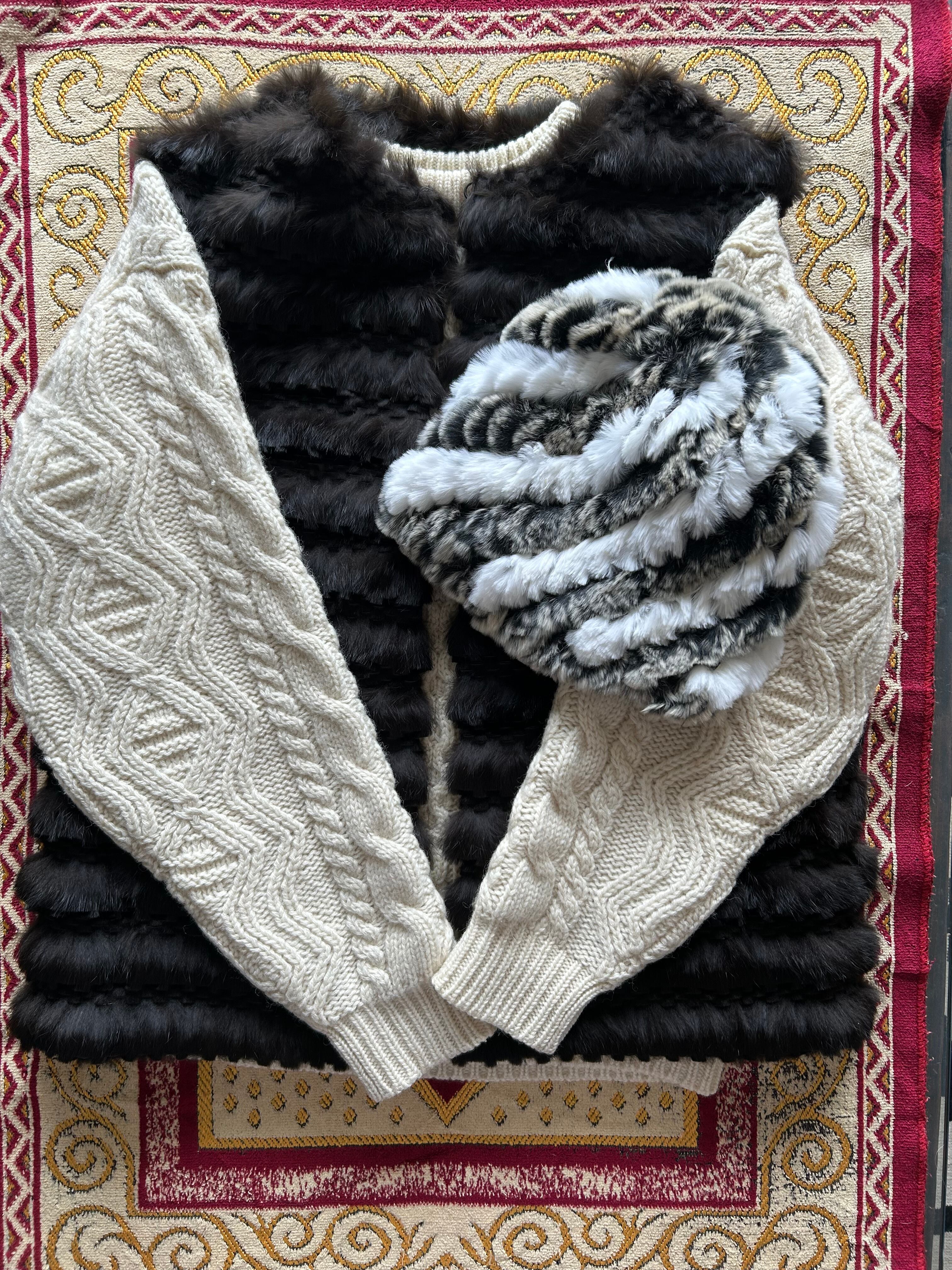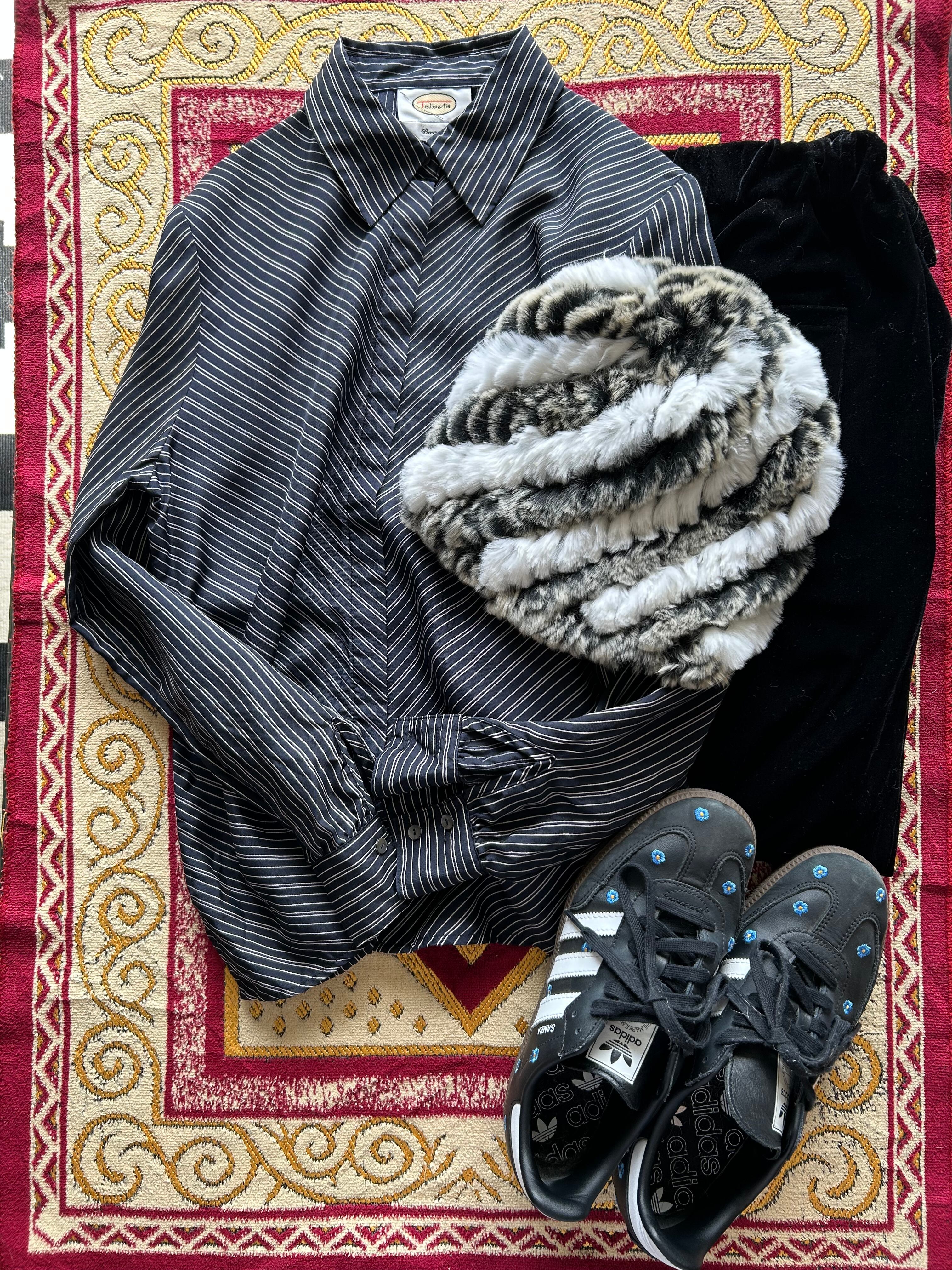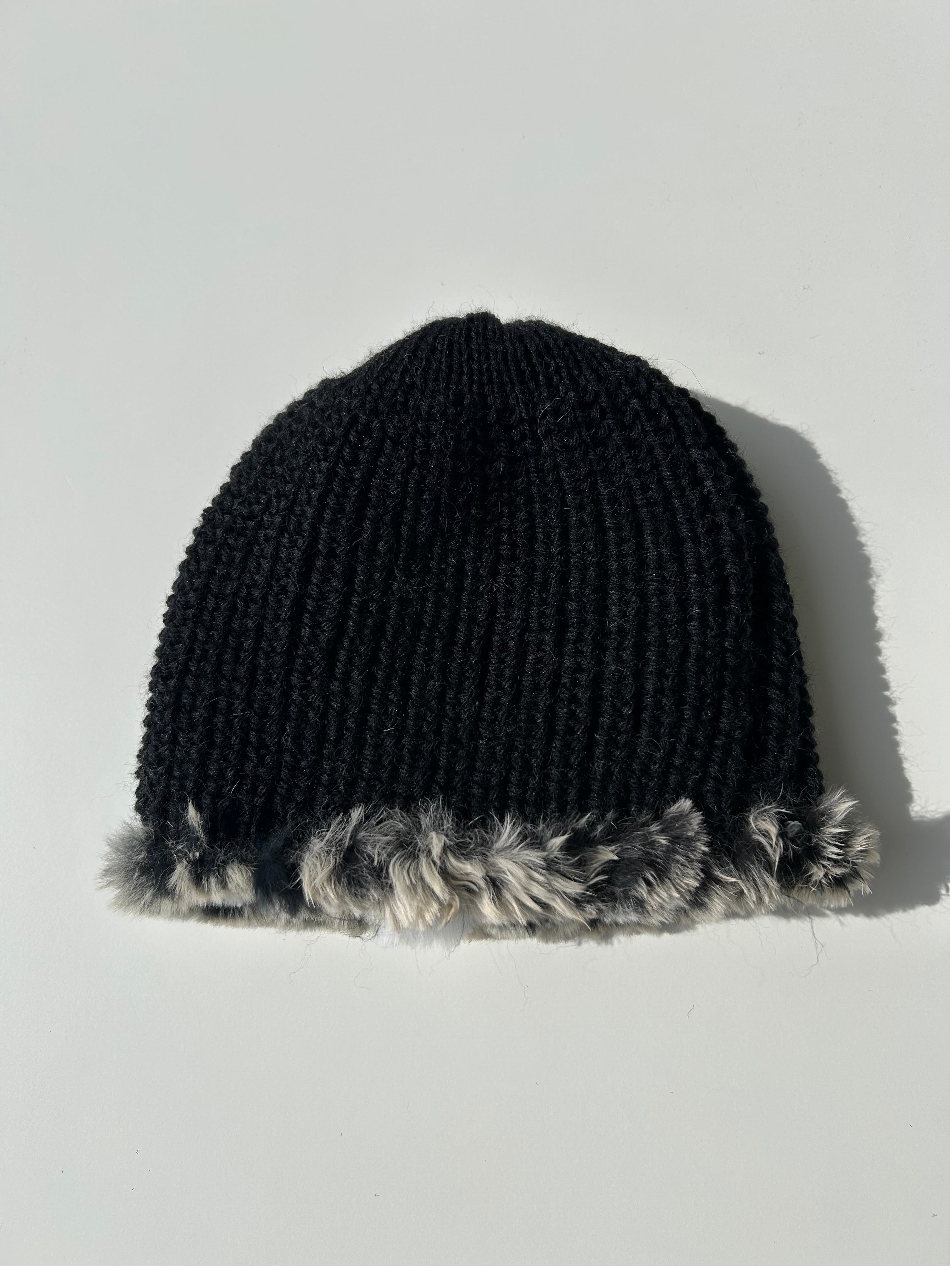 白・黒・グレーの混じった斜めストライプなファー帽子。