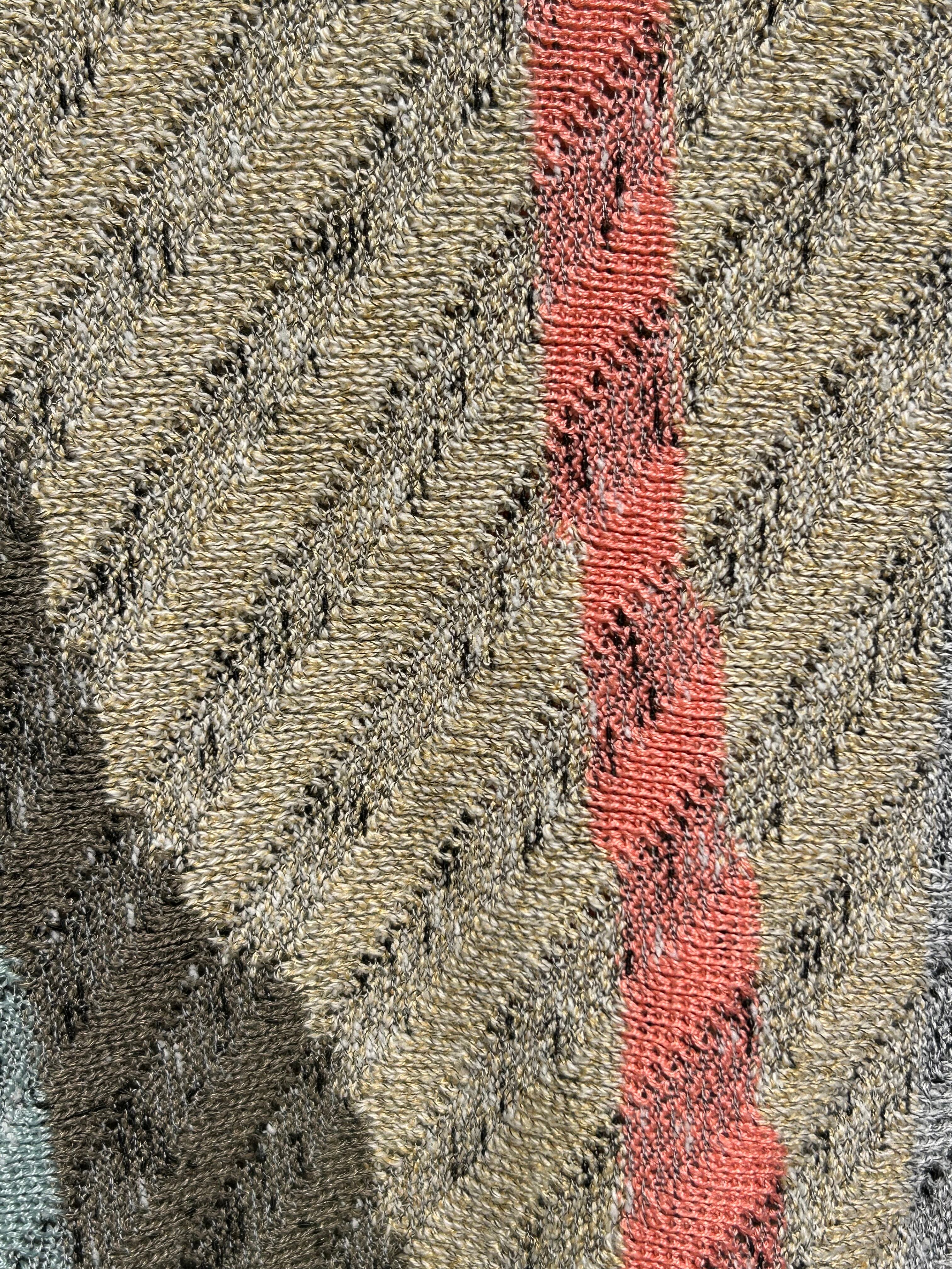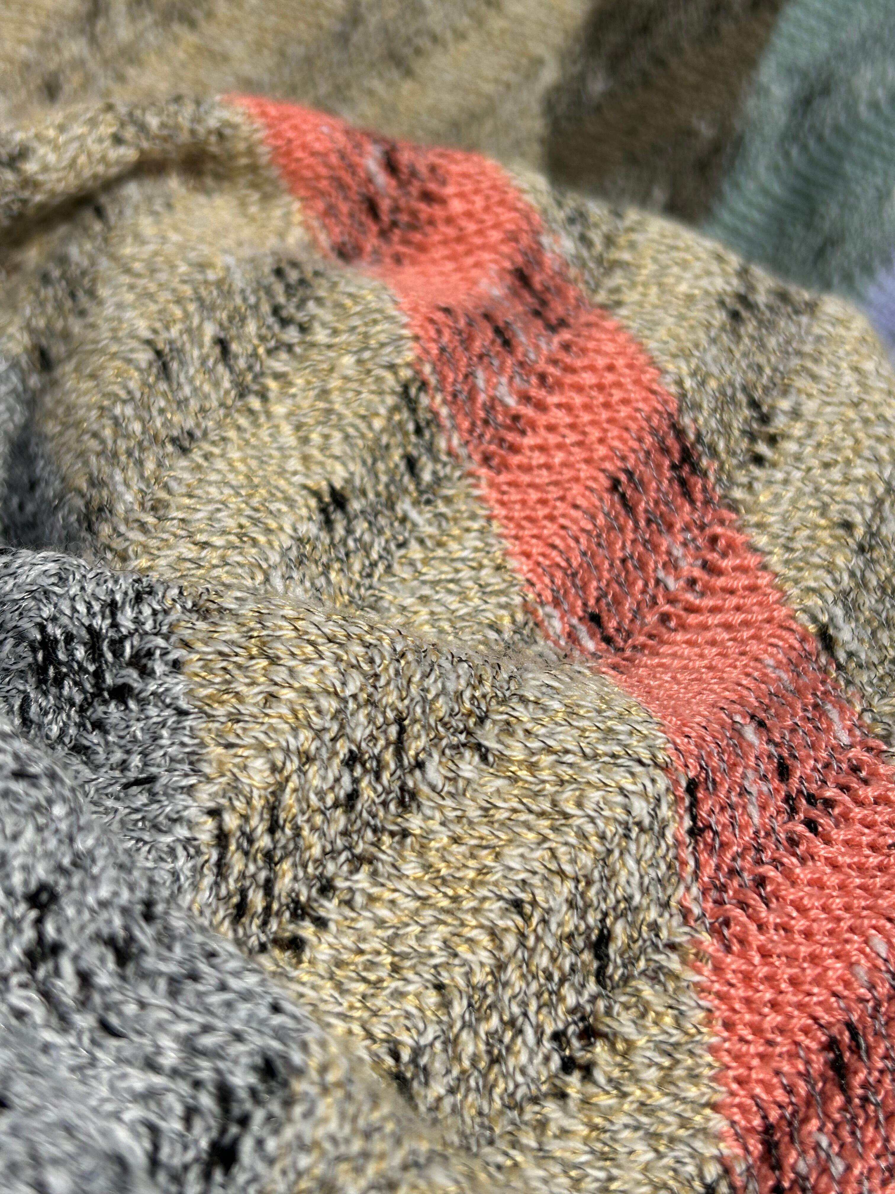 グレー、ピンク、パステルブルー、ベージュのストライプ柄ですが、生地は斜めに折られている面白いデザイン。