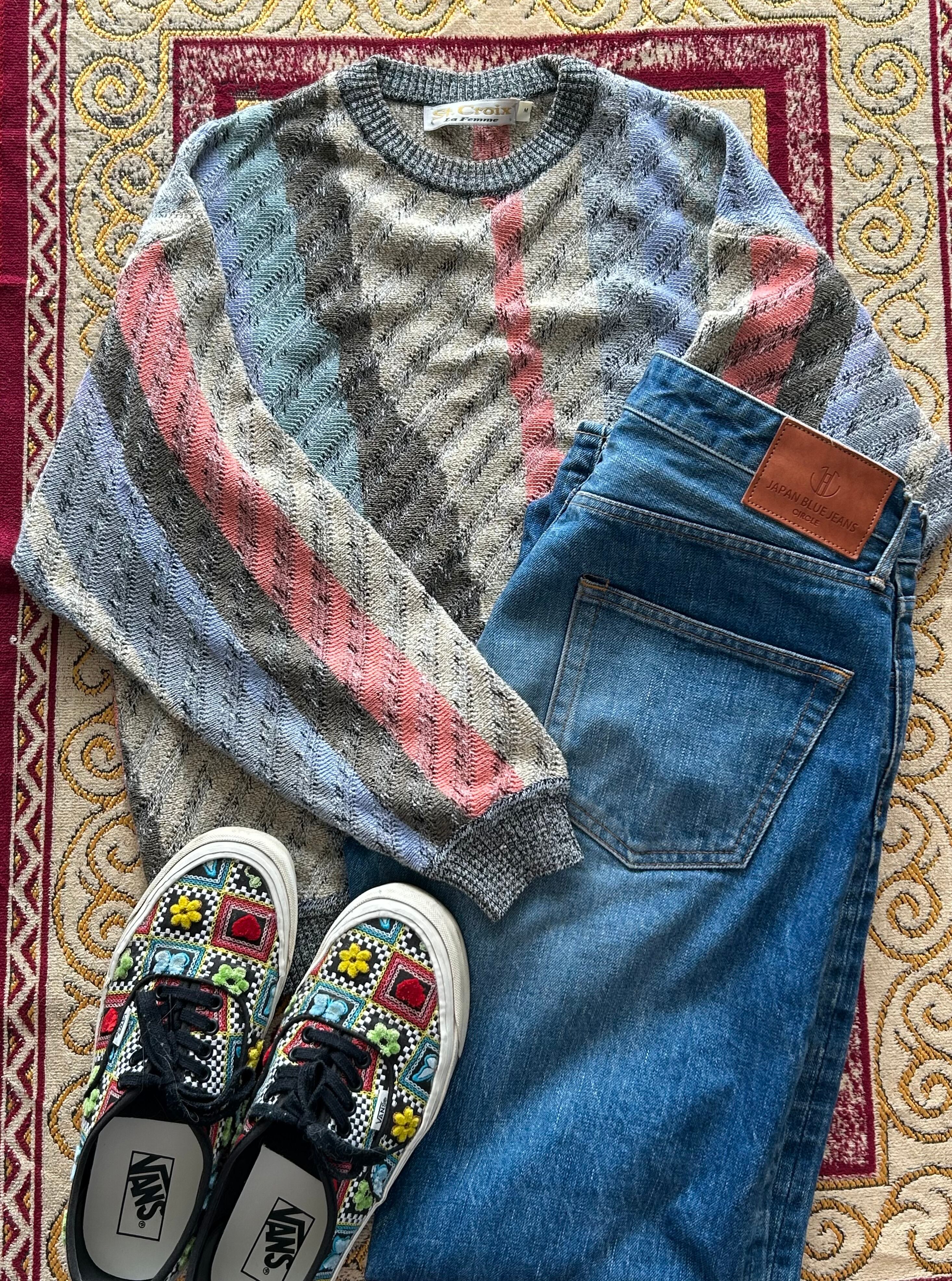 デニムやスウェットパンツなど何に合わせても1枚でキマるニットです。