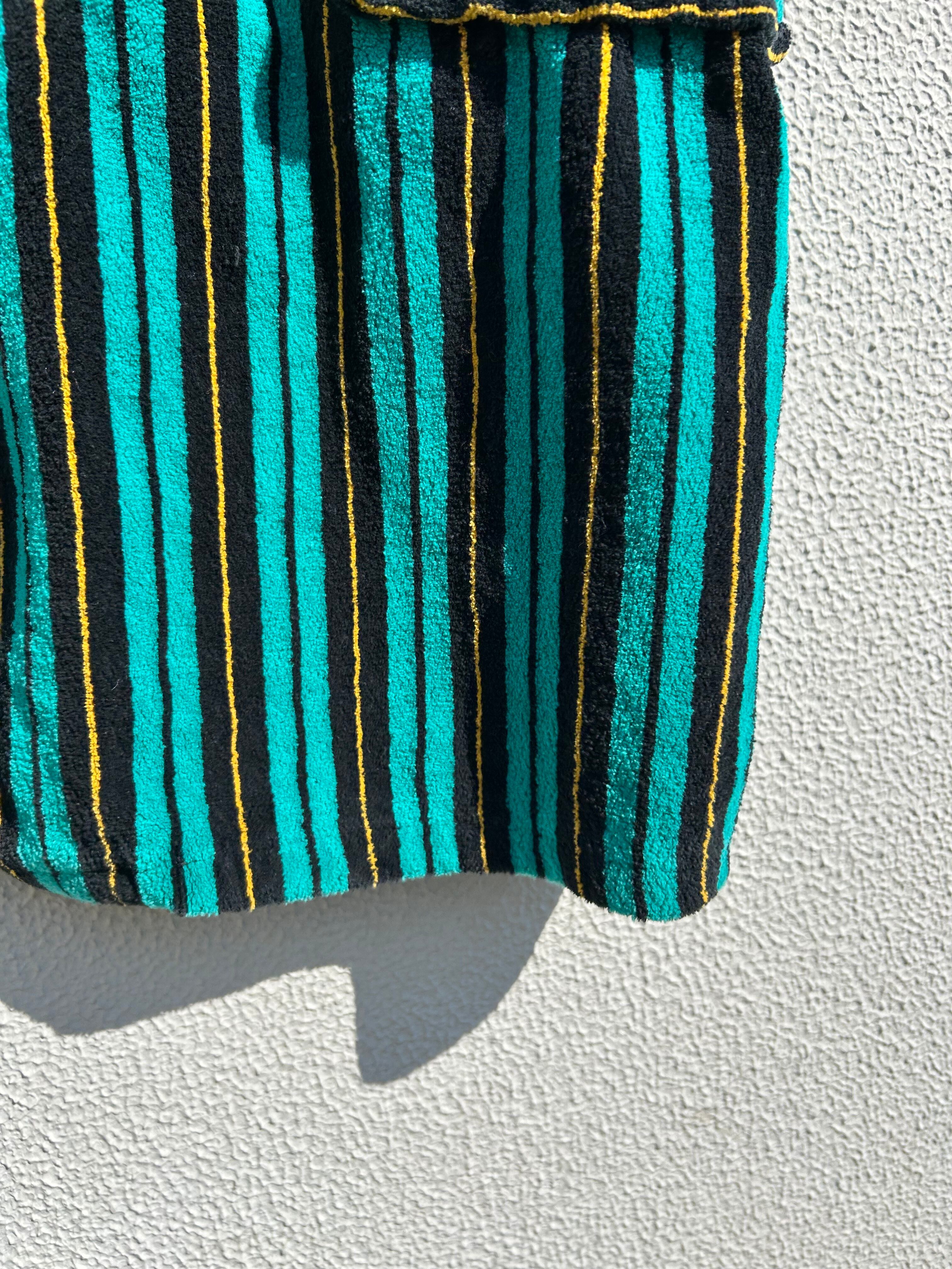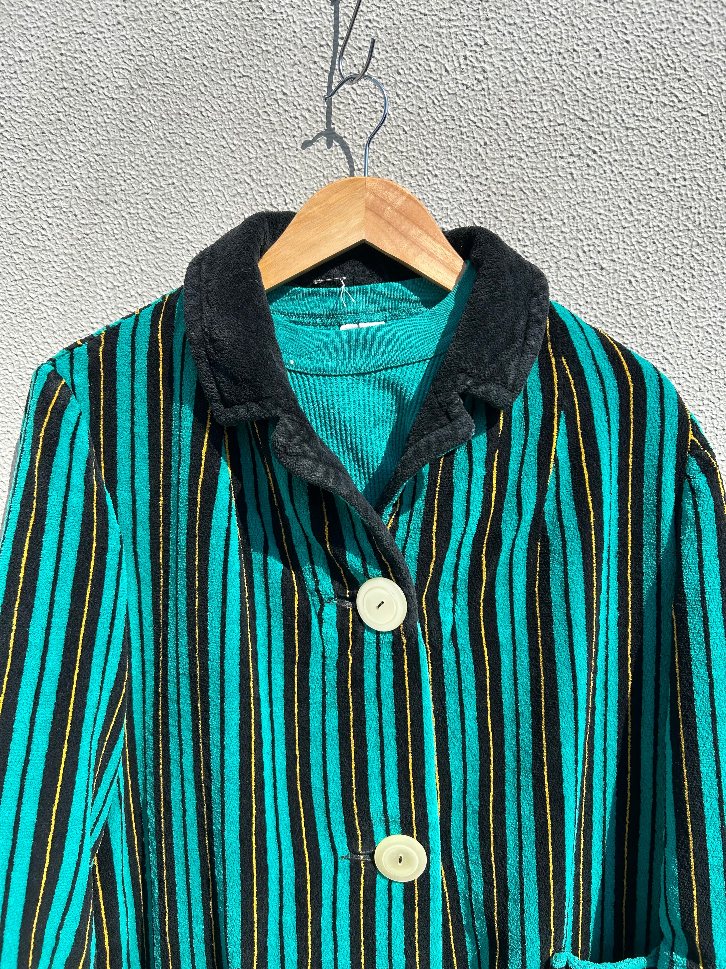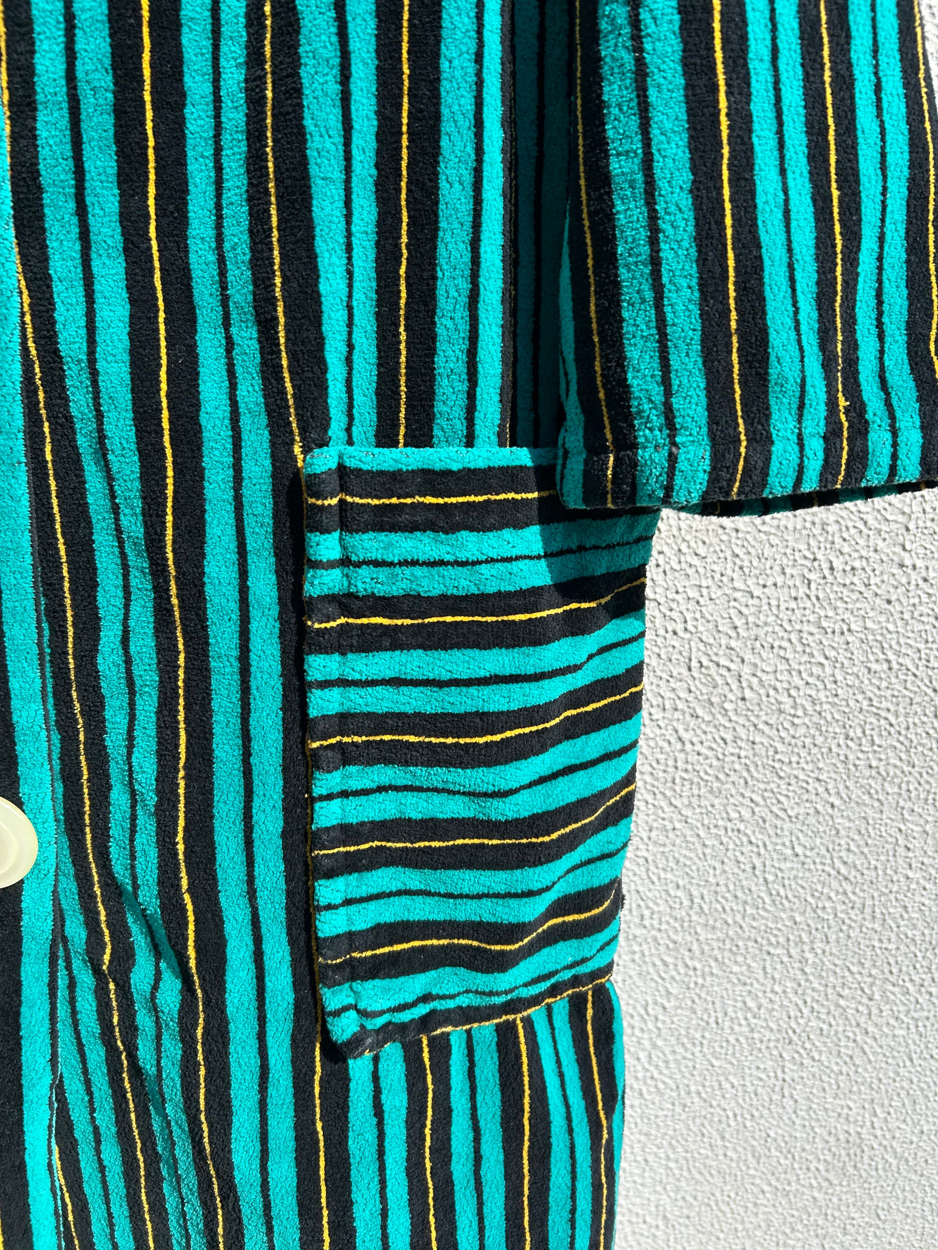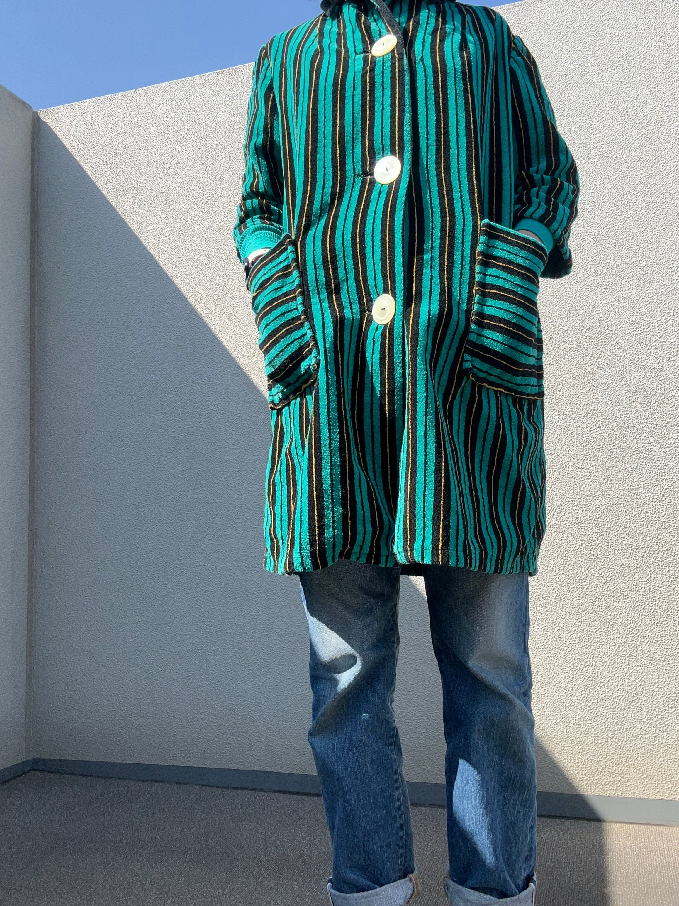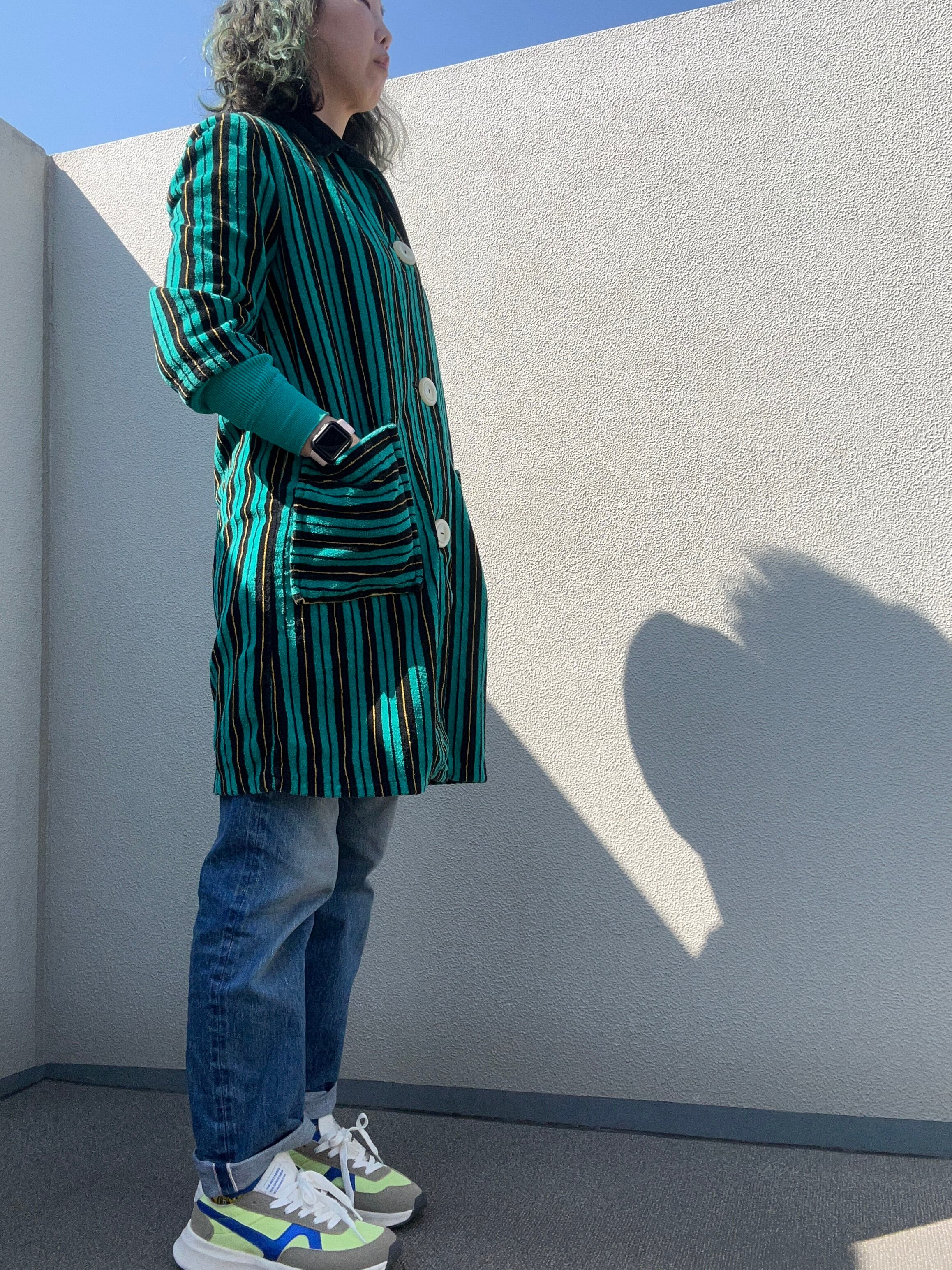 大きめのボタン、ポケットは同じ柄をボーダーに切り返して作ってあるのもレトロで素敵です。