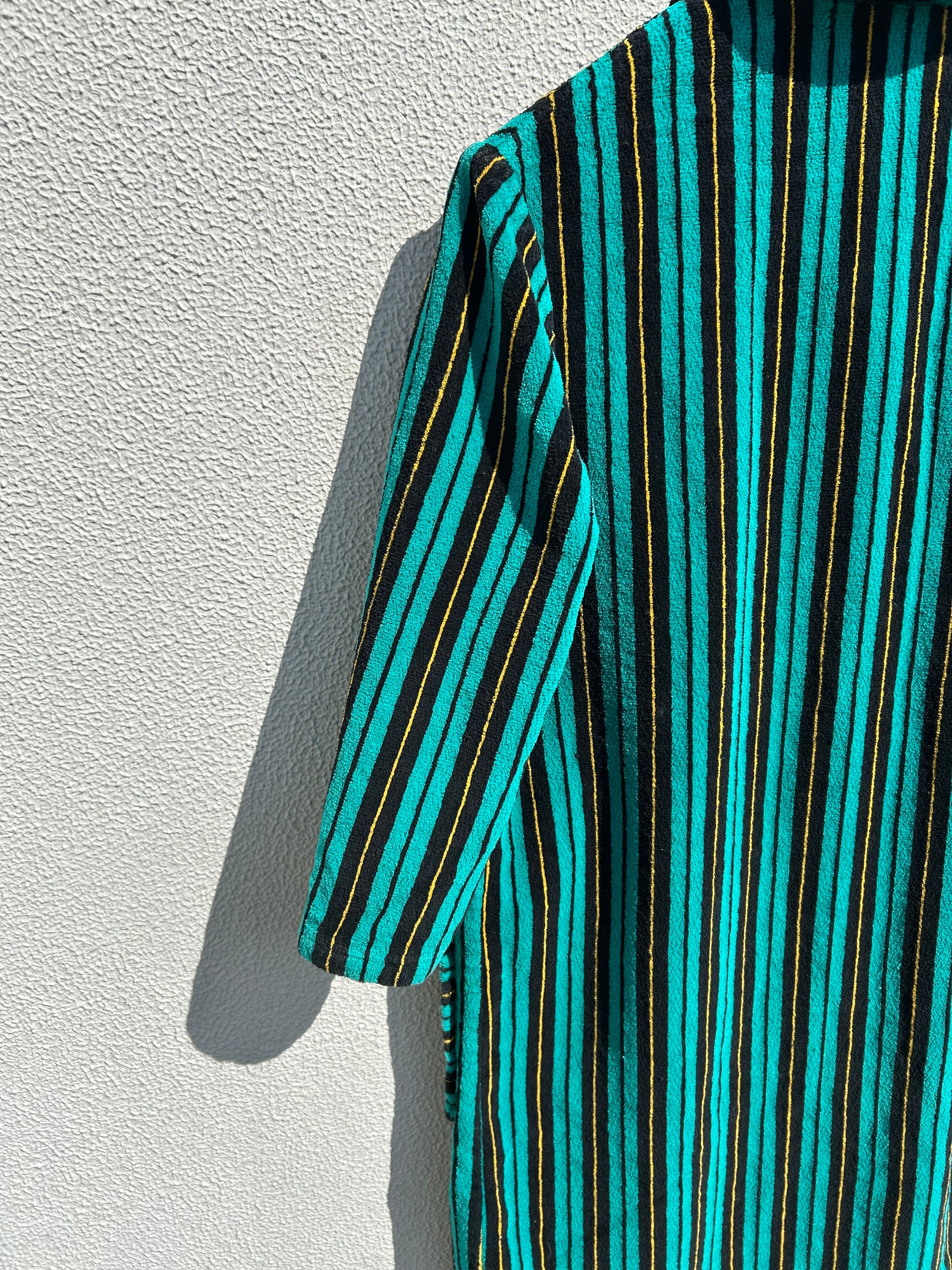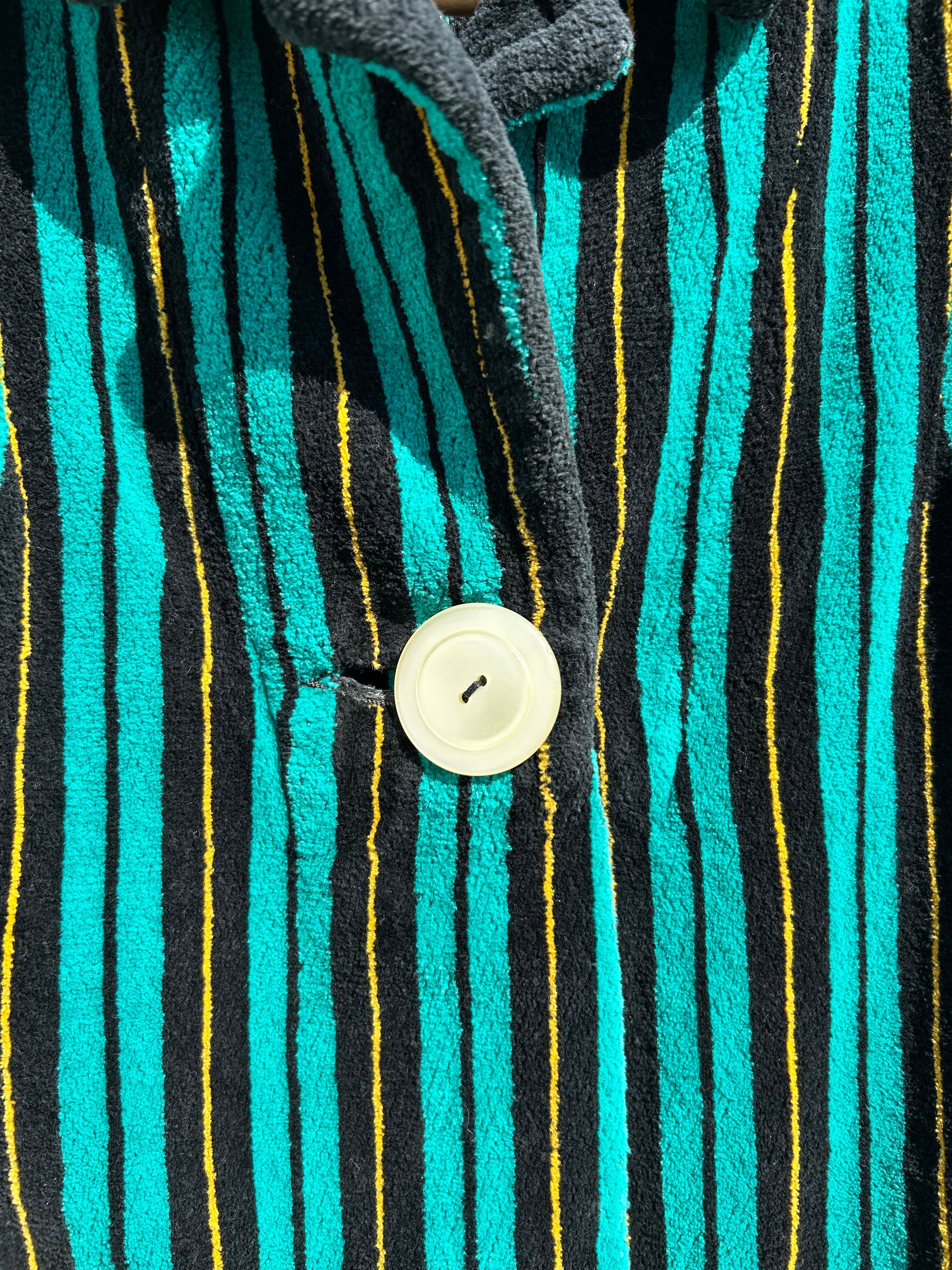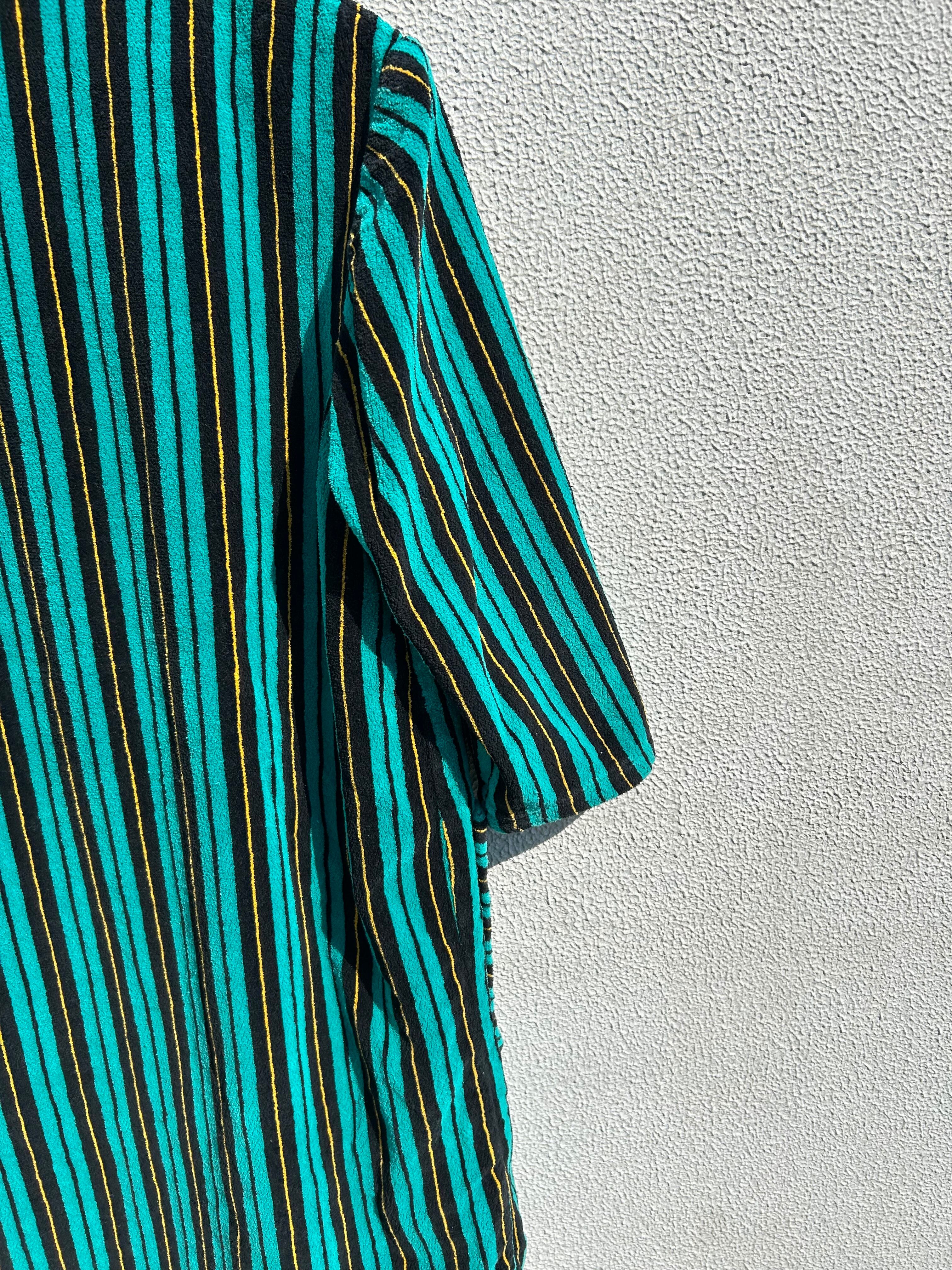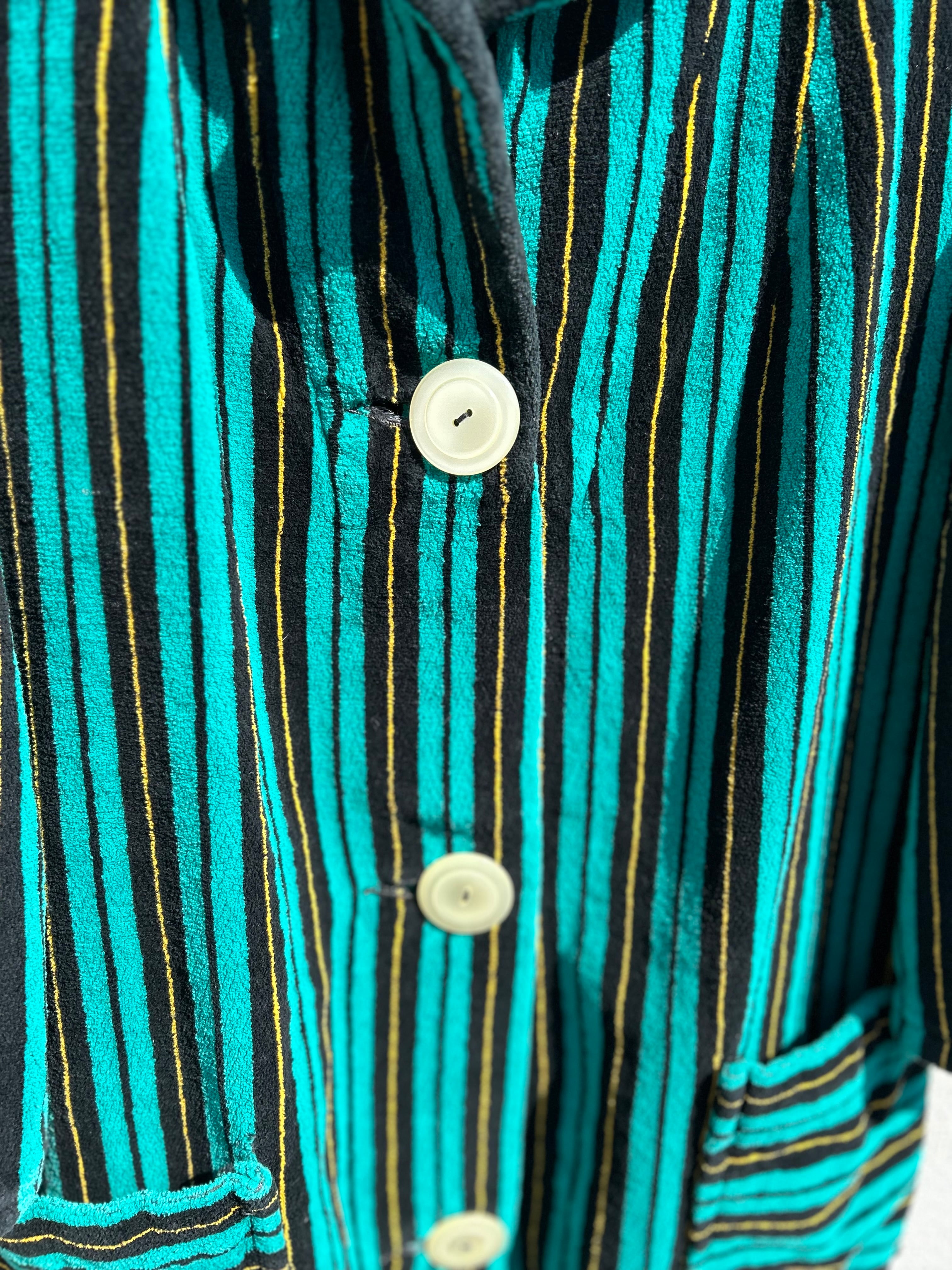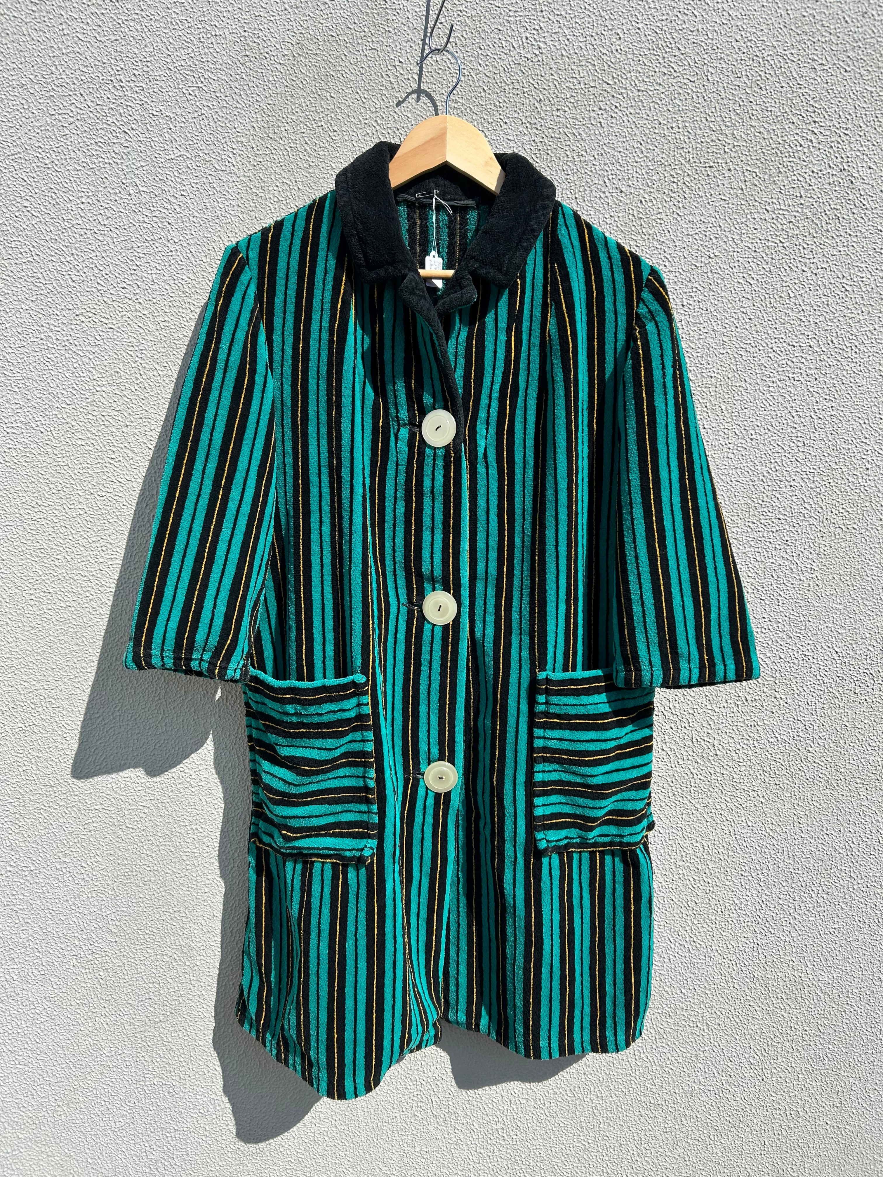 大きめのボタン、ポケットは同じ柄をボーダーに切り返して作ってあるのもレトロで素敵です。