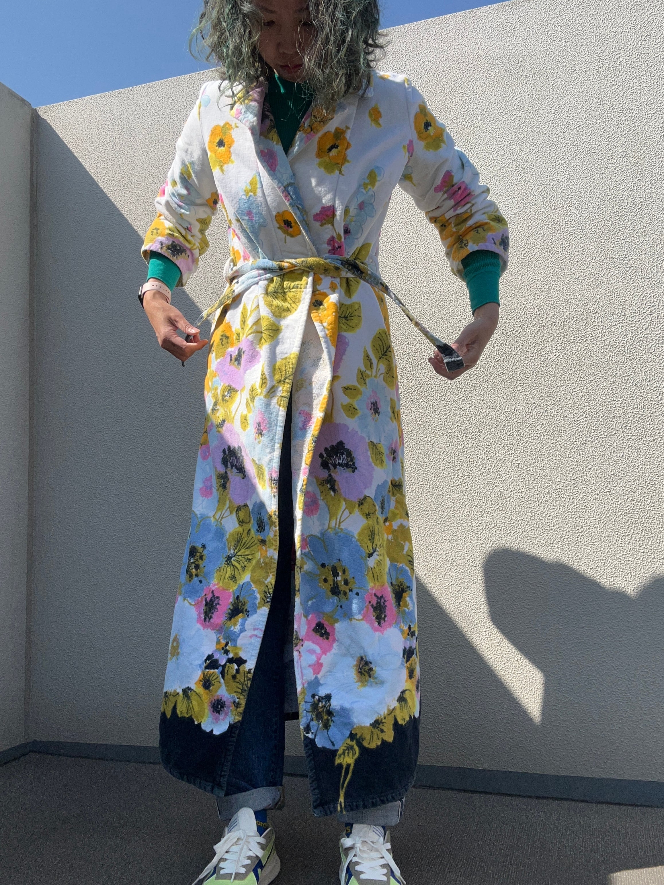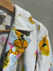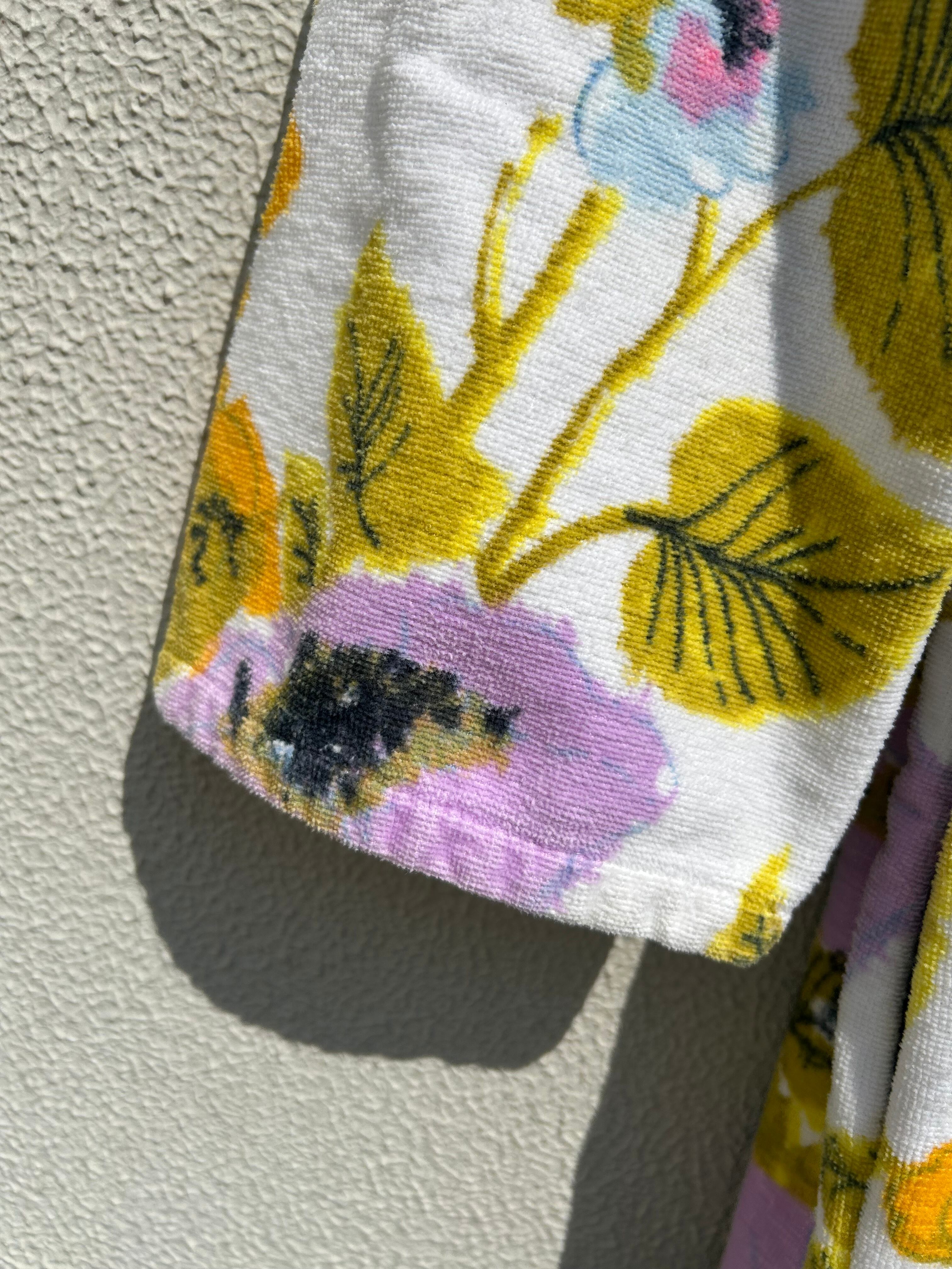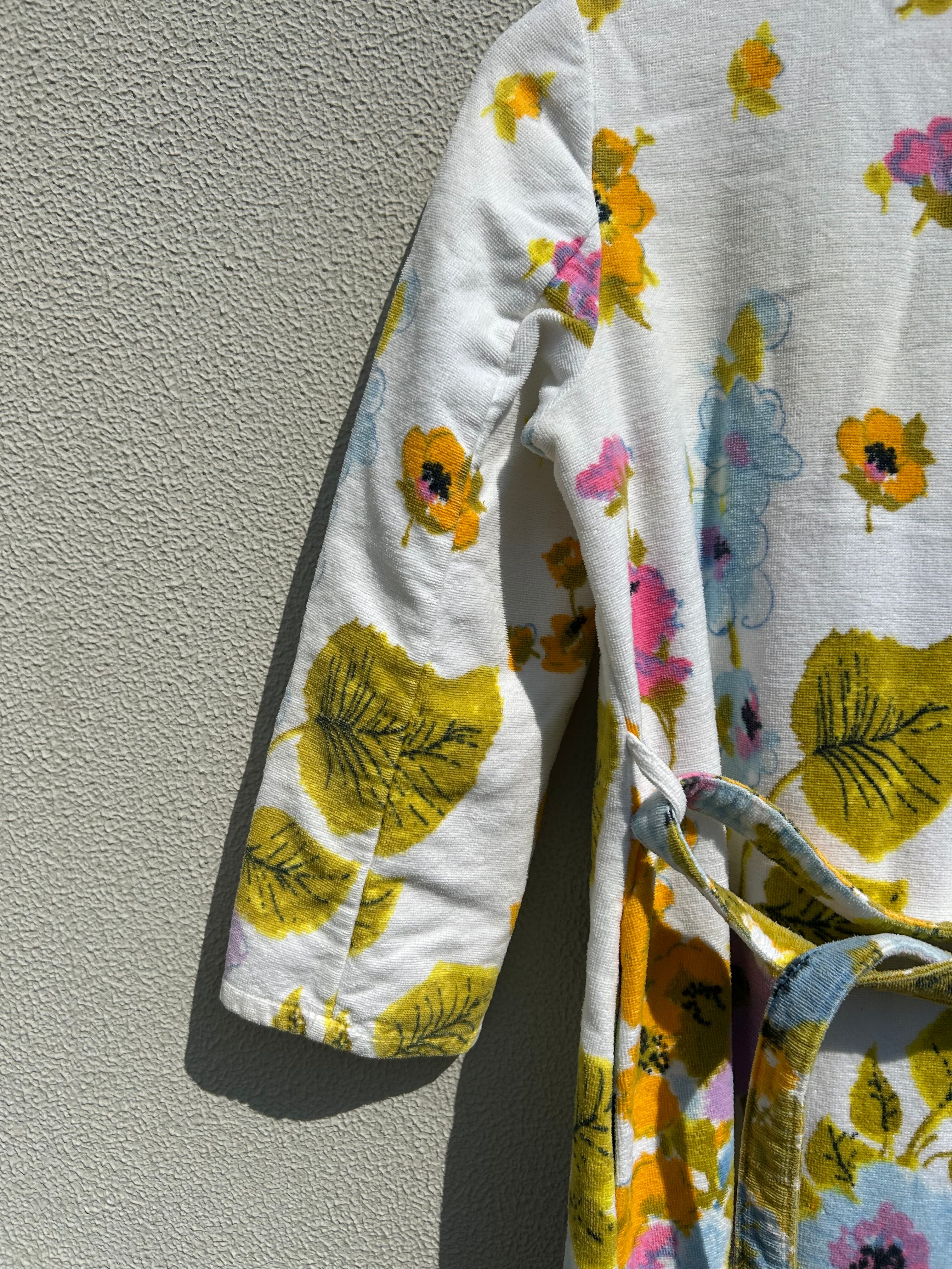 パンジーでしょうか?全面にカラフルな花柄が施された1枚で超主役になるパイル地のガウン。