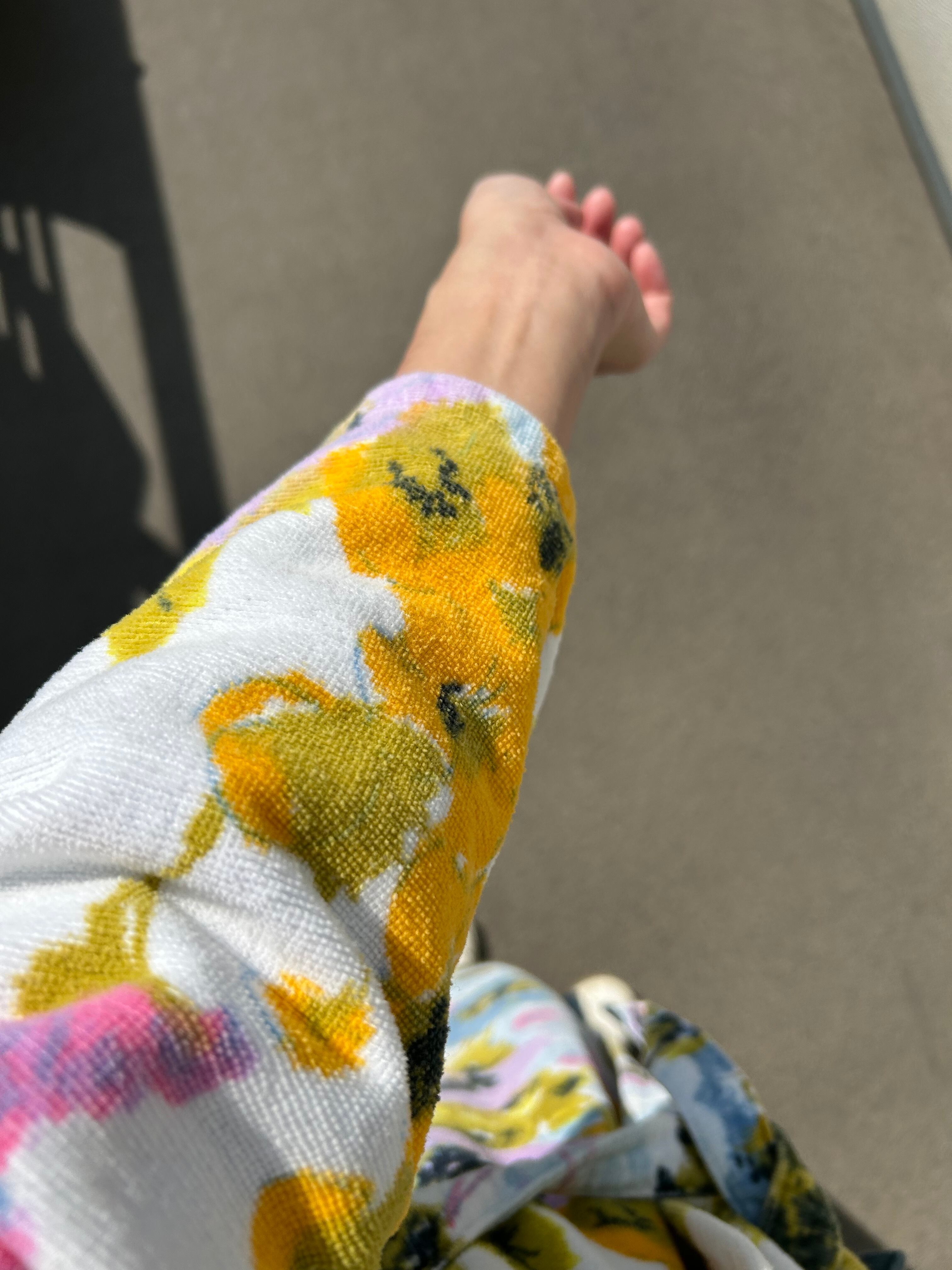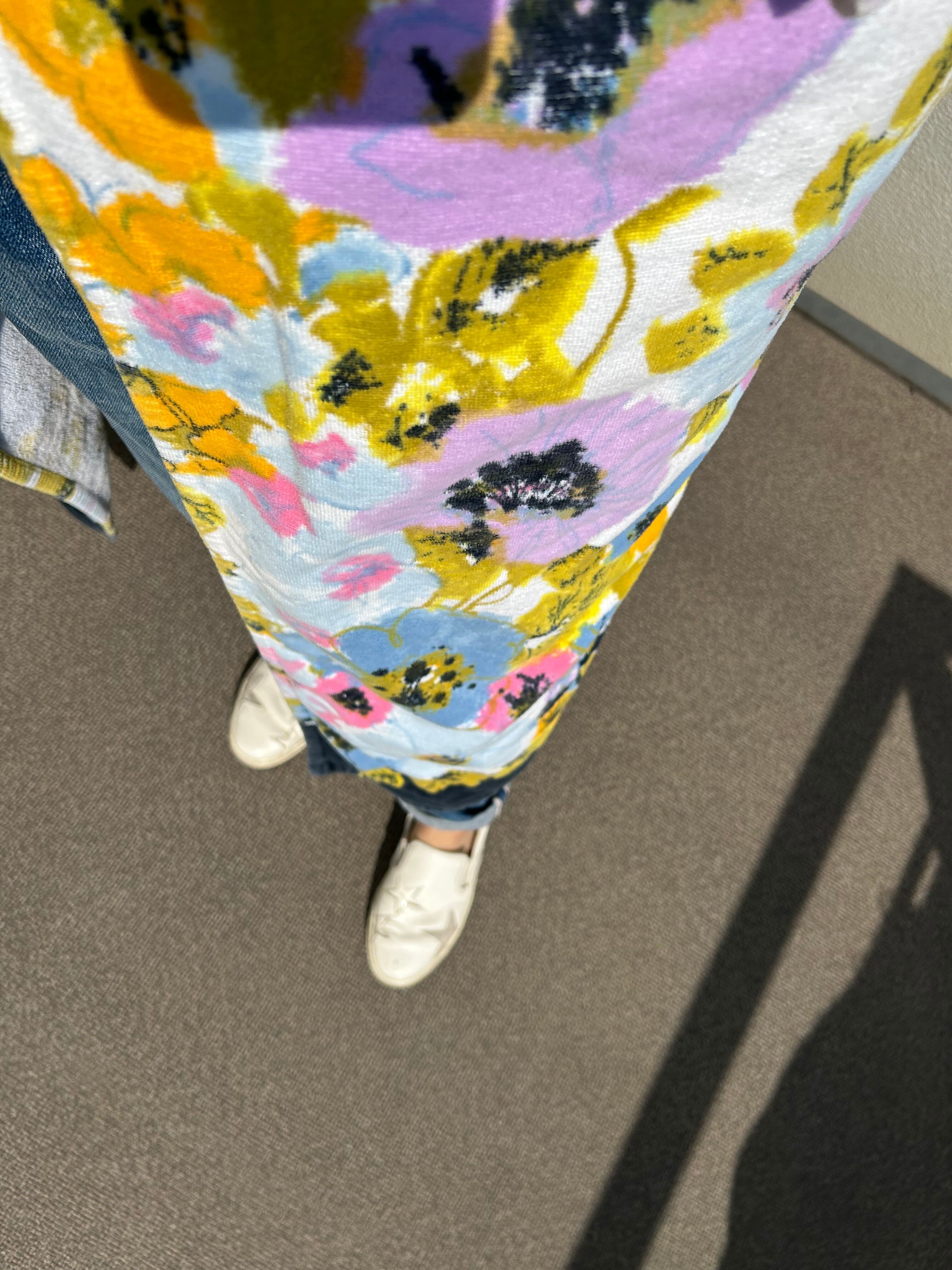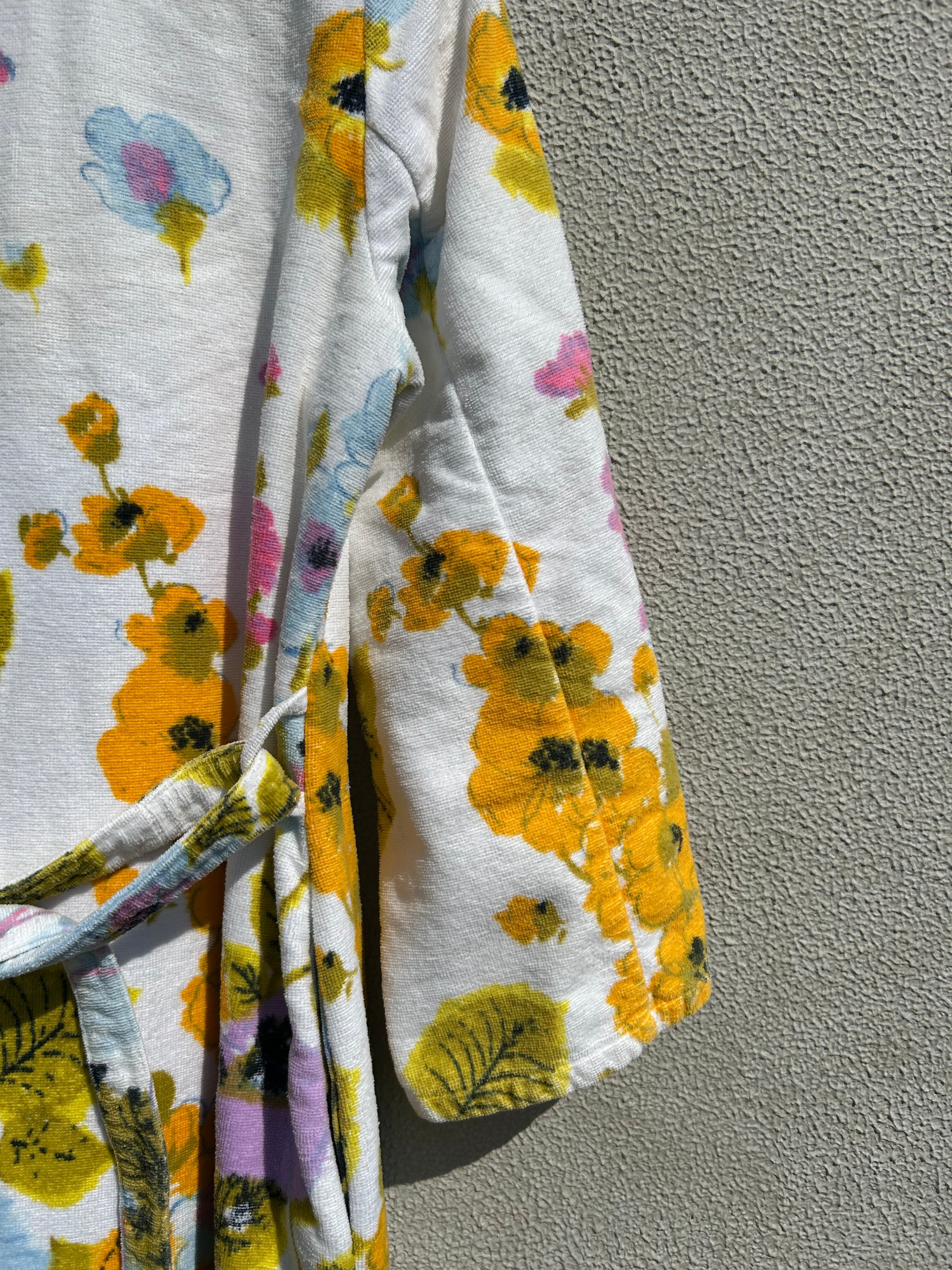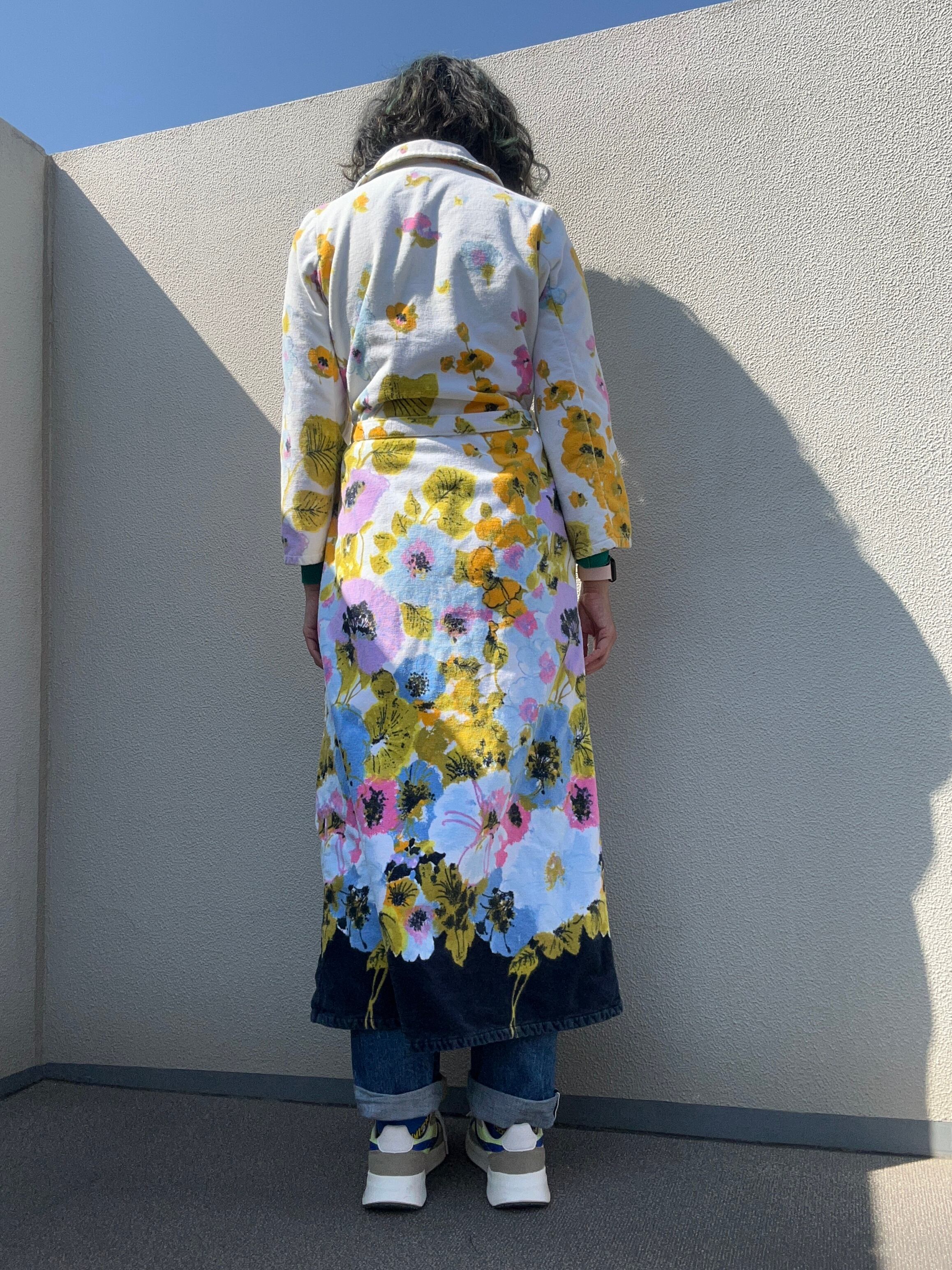 パンジーでしょうか?全面にカラフルな花柄が施された1枚で超主役になるパイル地のガウン。
