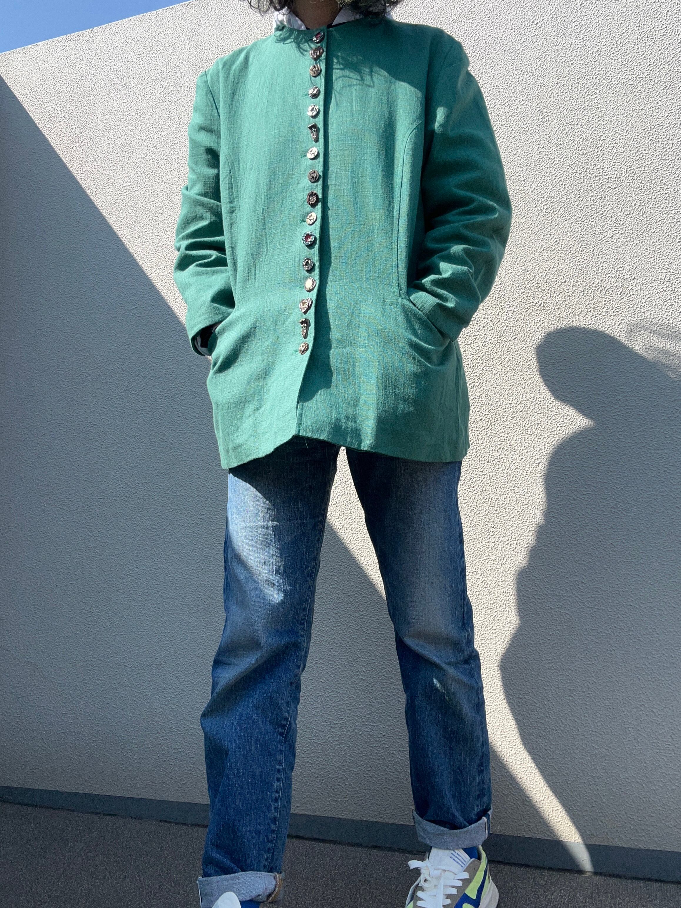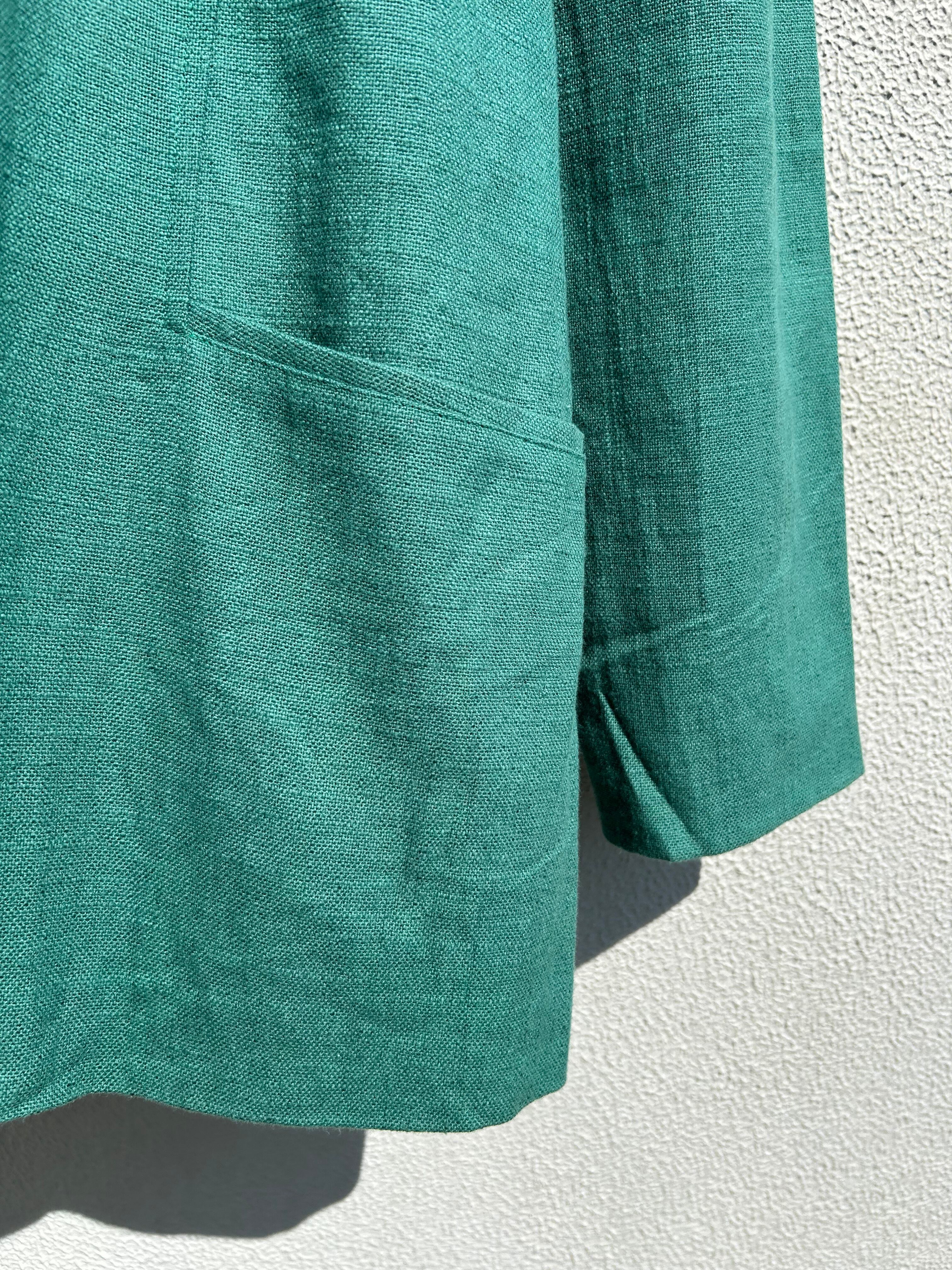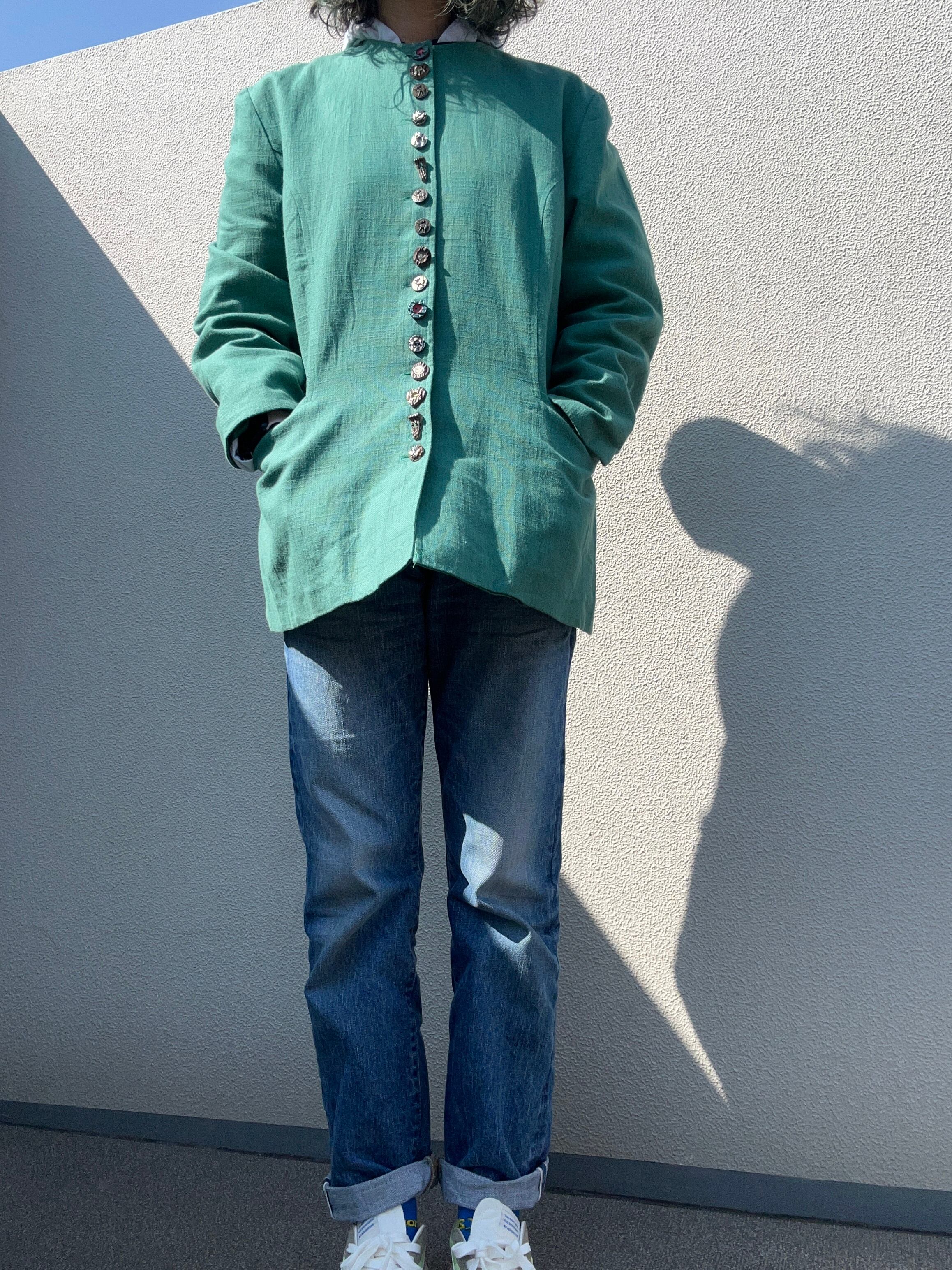 リネン素材なので、春から初夏にかけてちょうどよい、1枚持っておくと便利な1着です。