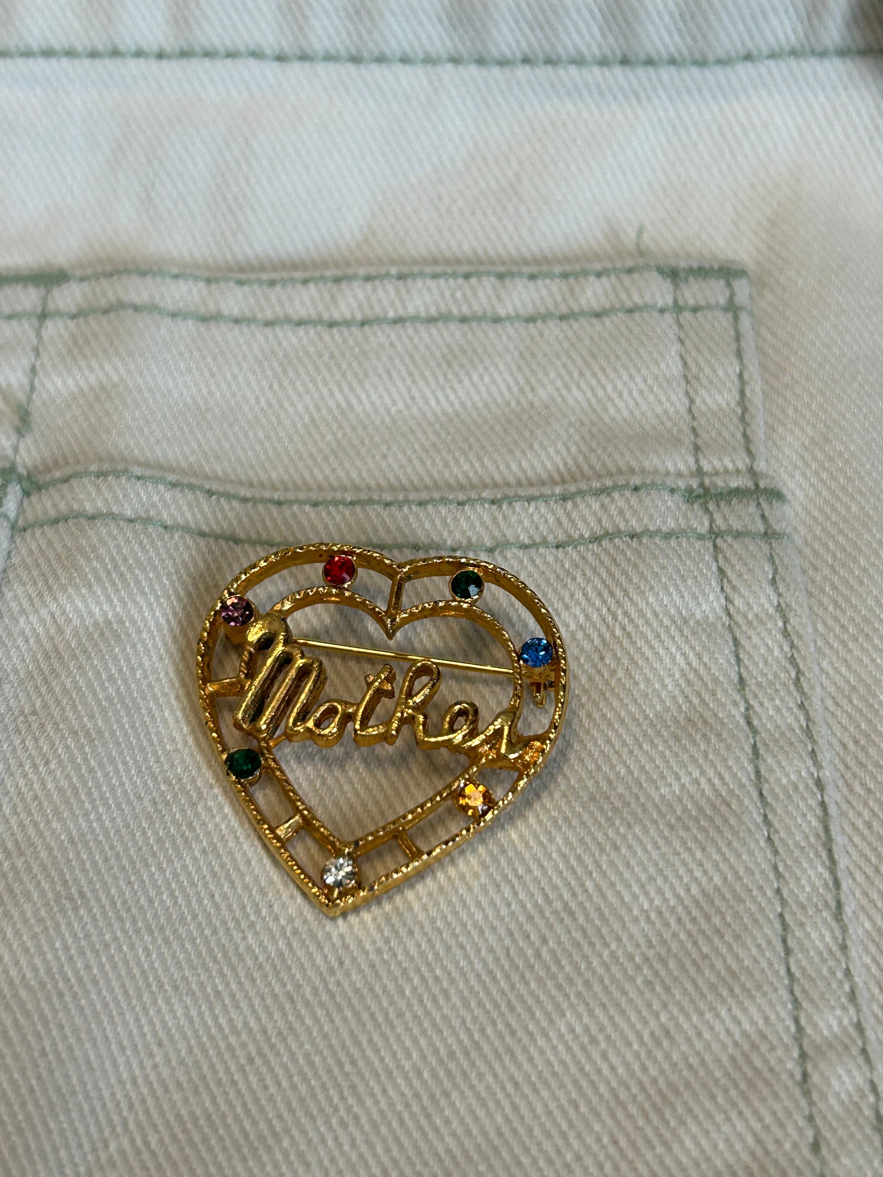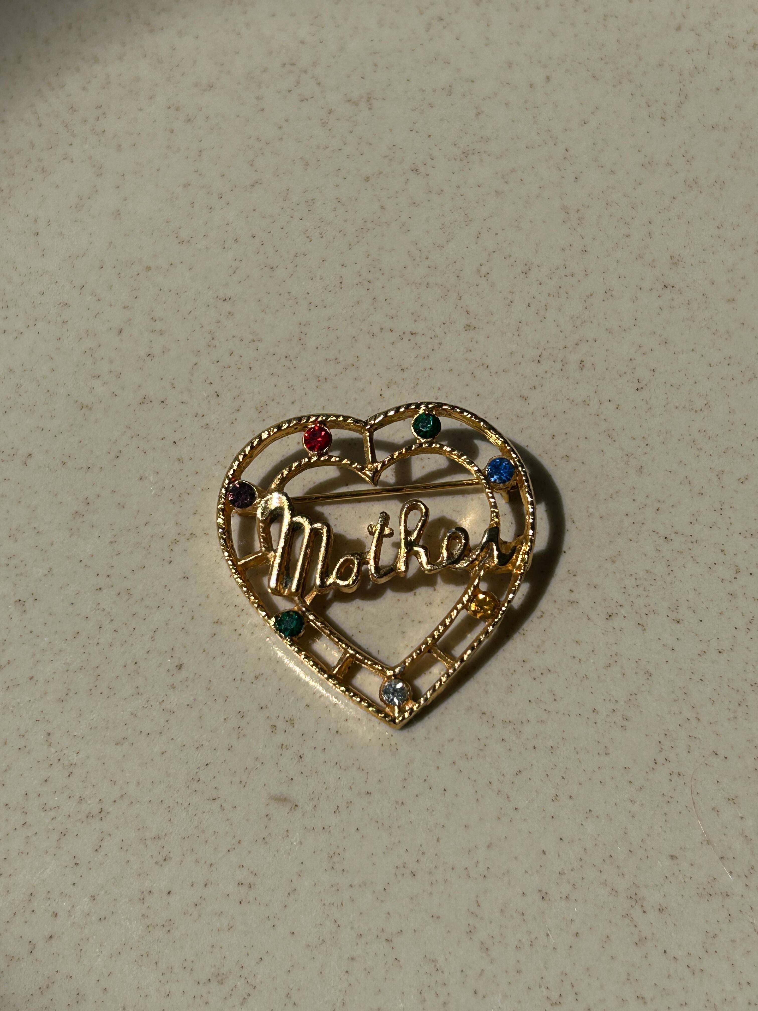 Motherの文字を囲むハートとビジュー付きのブローチ。